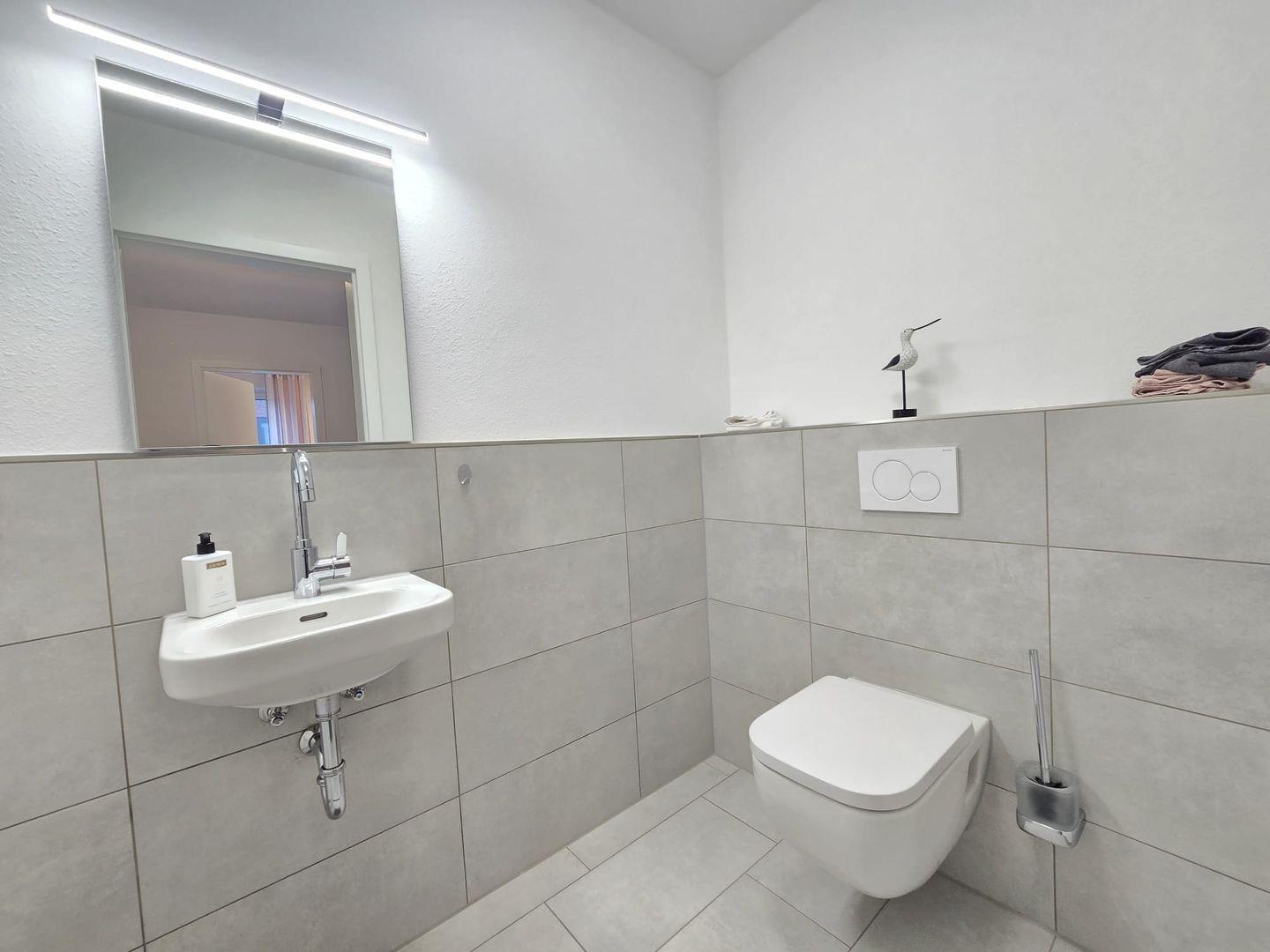 Das elegante Badezimmer verfügt über eine moderne Dusche, ein WC und einen Handtuchwärmer. Zusätzlich ist ein Gäste-WC vorhanden, was besonders für den Aufenthalt zu viert praktisch ist.