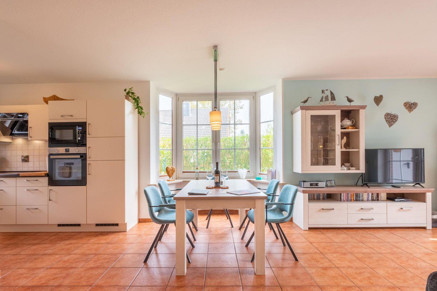Die moderne Kochnische ist voll ausgestattet mit Cerankochfeld, Mikrowelle und Spülmaschine – perfekt für gemeinsame Mahlzeiten. Genieße dein Essen auf der großen Terrasse mit Gartenmöbeln und Grill oder lass den Tag dort entspannt ausklingen.