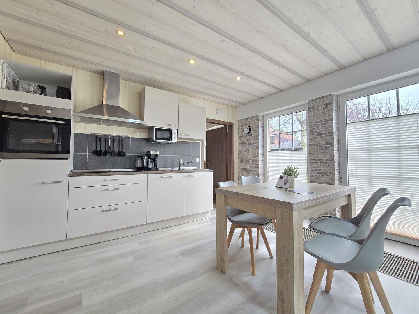 Küche: Voll ausgestattete Küche mit Backofen, Herd, Kühlschrank, Geschirrspüler und Kaffeemaschine – ideal für Selbstversorger.