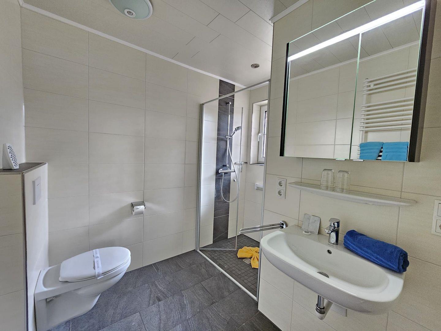 Badezimmer: Modernes Bad mit Dusche und WC.