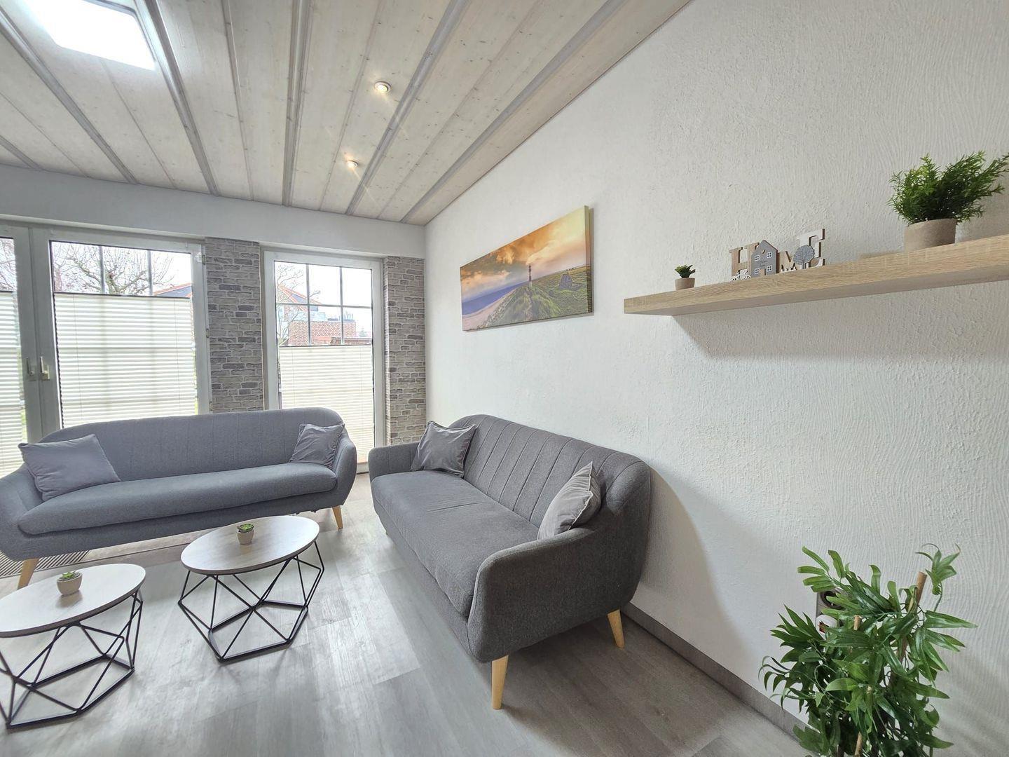 Wohnzimmer: Helles, gemütlich eingerichtetes Wohnzimmer mit komfortabler Sitzgelegenheit, TV und direktem Zugang zur Terrasse.