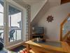 Zur Ferienwohnung gehört ein überdachter, attraktiv geschnittener Balkon (3x1,5m). Ein kleiner Tisch und vier Stühle mit bequemen Auflagen sorgen dafür, dass auf dem Freisitz entspannt verweilt werden kann. Auch Rückenkissen stehen Ihnen zur Verfügung, so dass dem Entspannen an der frischen Luft nichts im Wege steht.