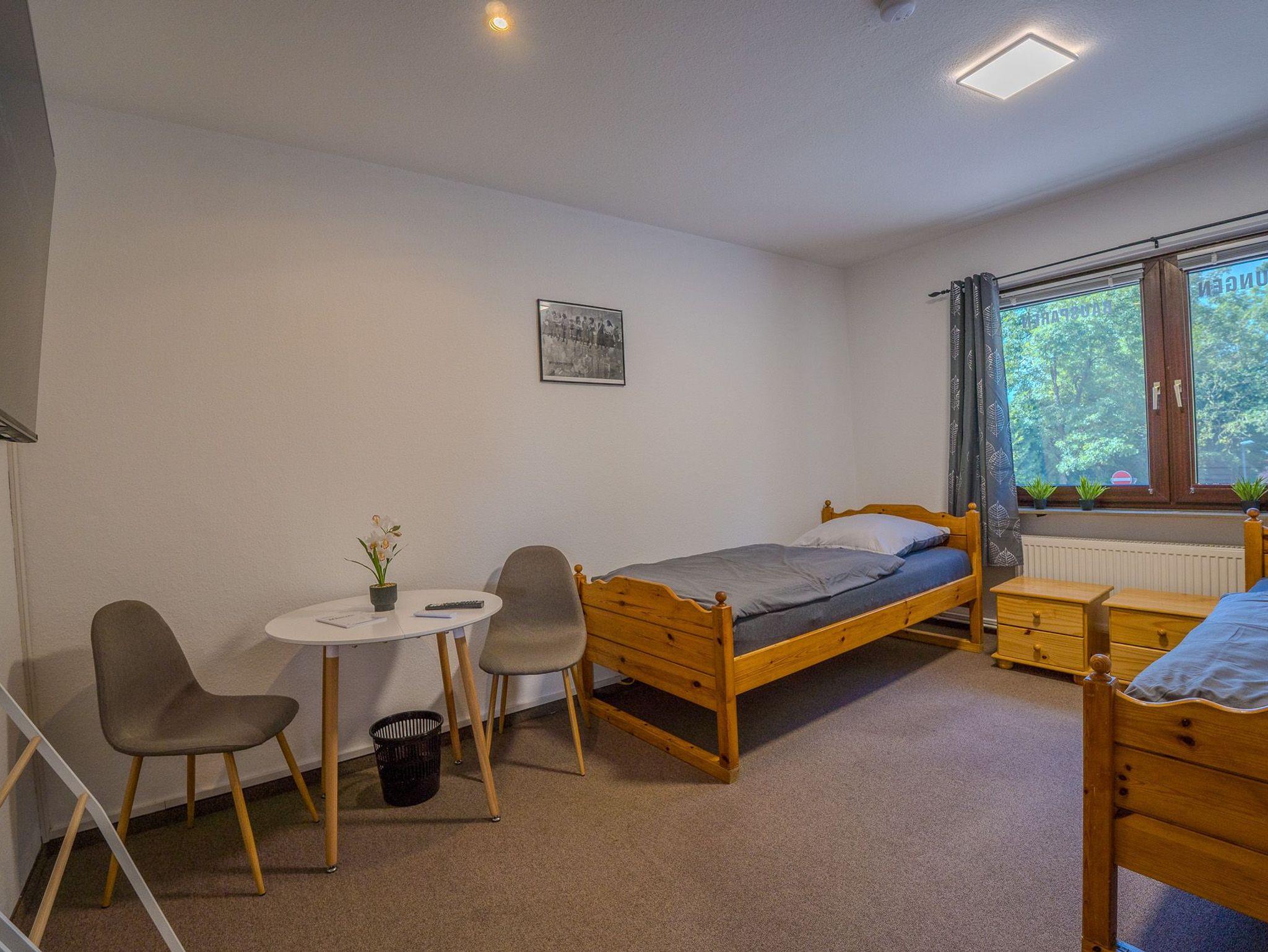 Jedes Zimmer verfügt über einen Fernseher, einen Tisch mit Stuhl und ein bequemes Bett. Bettwäsche und Handtücher liegen bereit(keine bezogenen Betten) Im allgemeinen Bereich stehen eine voll ausgestattete Küche und ein Duschbad sowie ein Aufenthaltsraum zur Verfügung. Es können ebenfalls ein Waschmaschine und ein Trockner genutzt werden. Selbstverständlich ist jedes Zimmer individuell abschließbar.