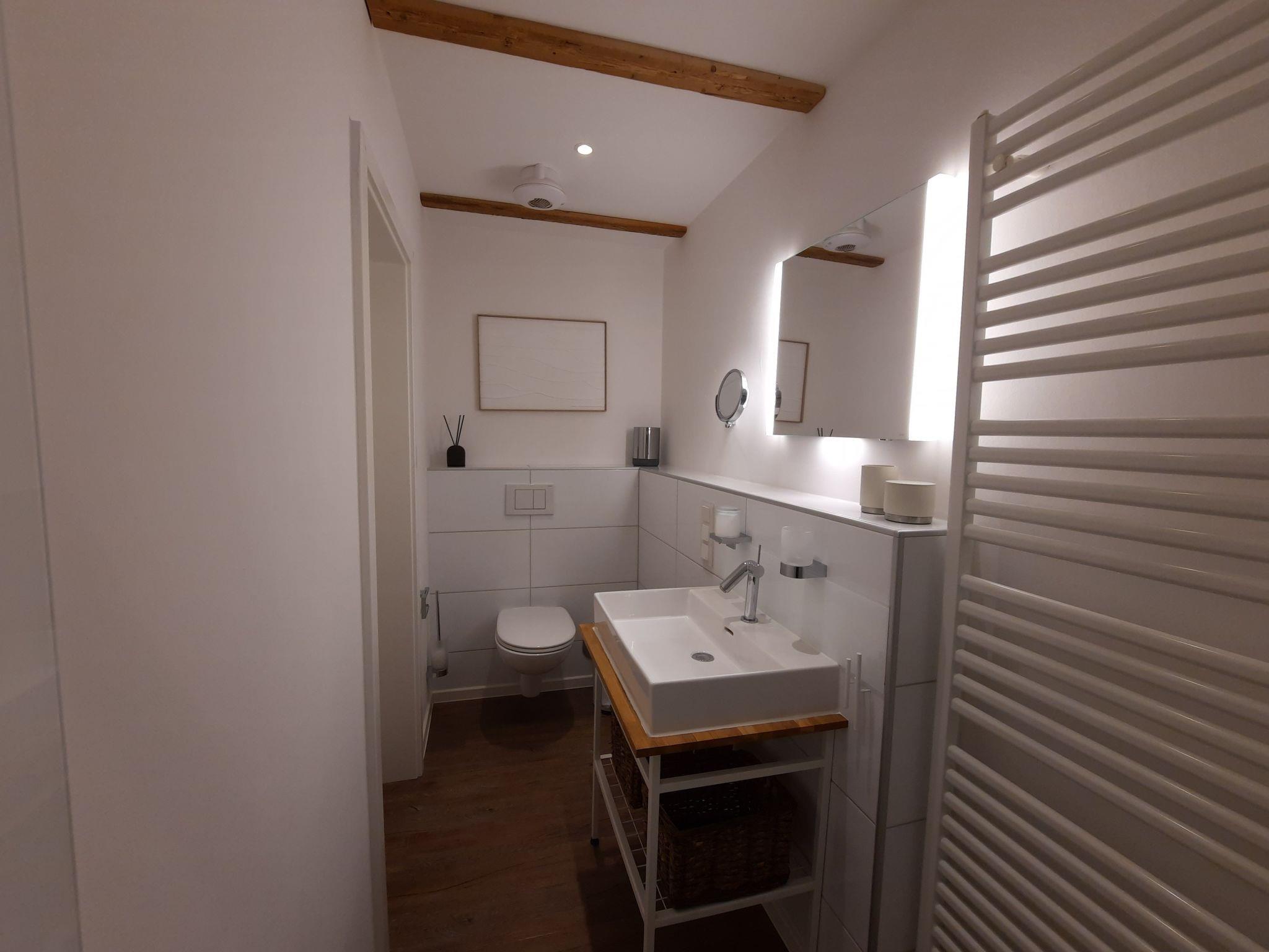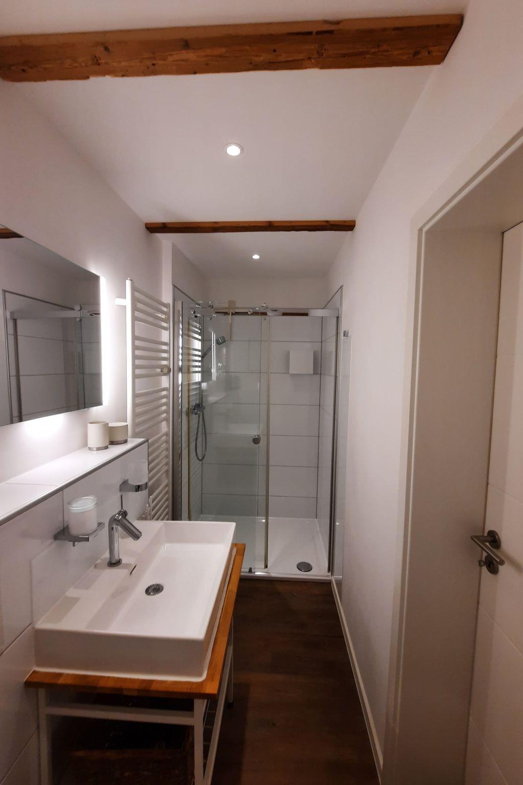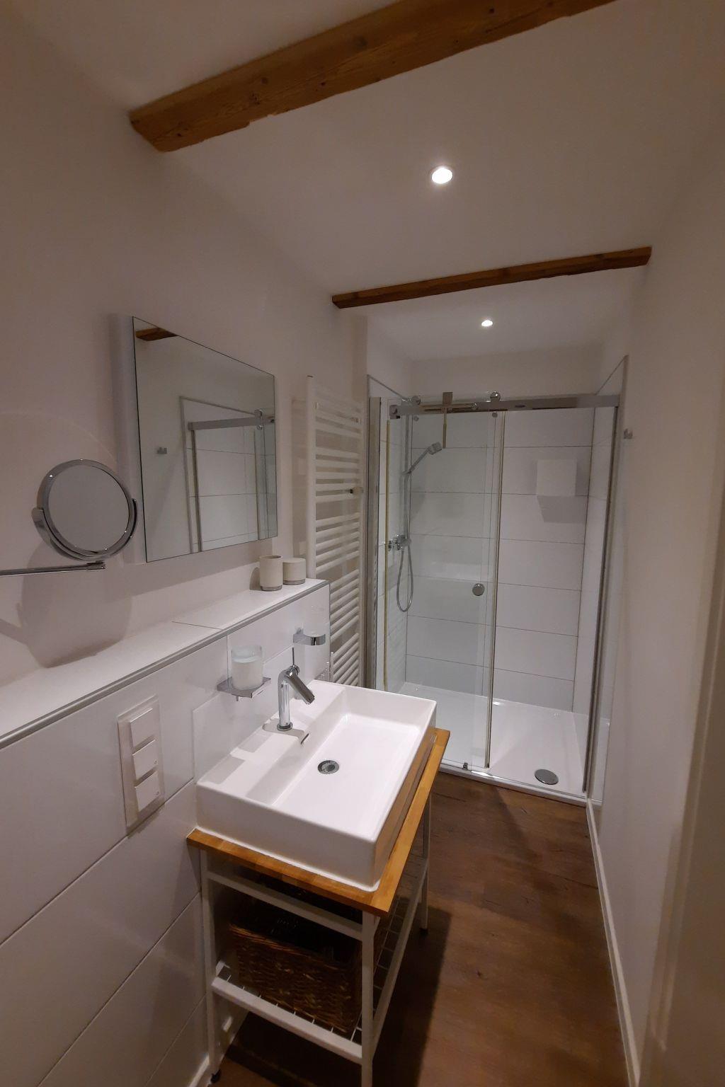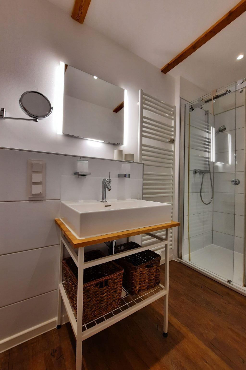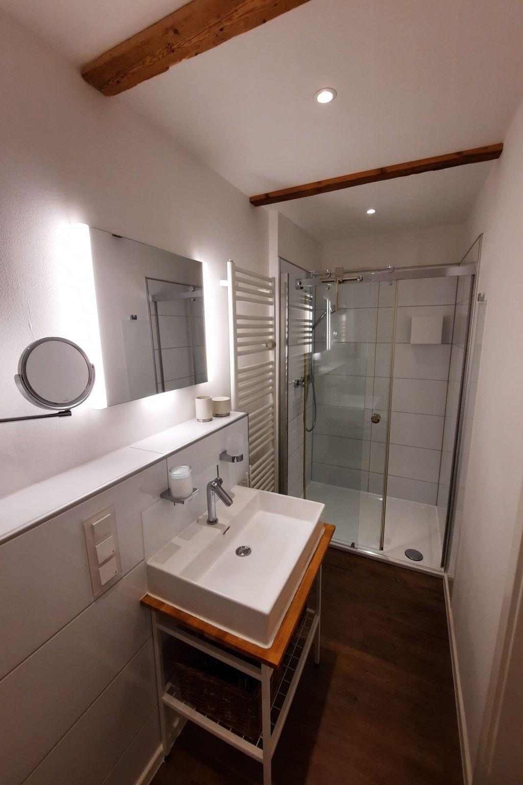 The bathroom with its walk-in shower has been fitted with items from Keuco. The high-quality wall mirror can be illuminated (and dimmed).