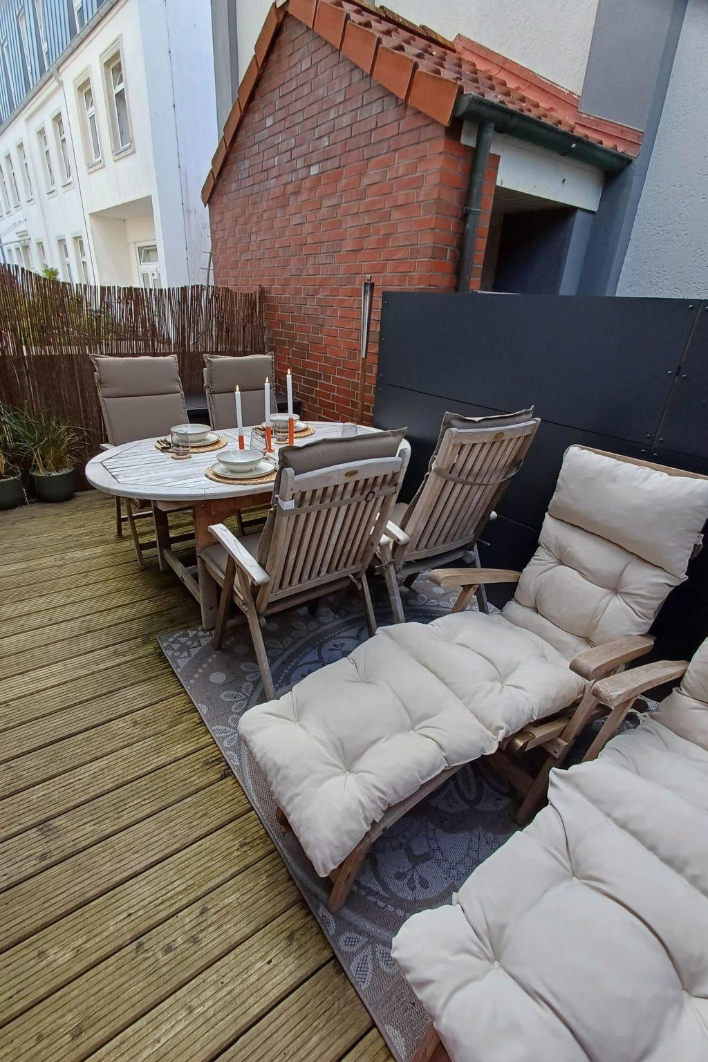 The secluded terrace, which belongs solely to the flat, has a table with four chairs and two deckchairs, each made of teak and with cushions. The cushions can be conveniently stored in the Biohort box. You will also find a clothes horse here.