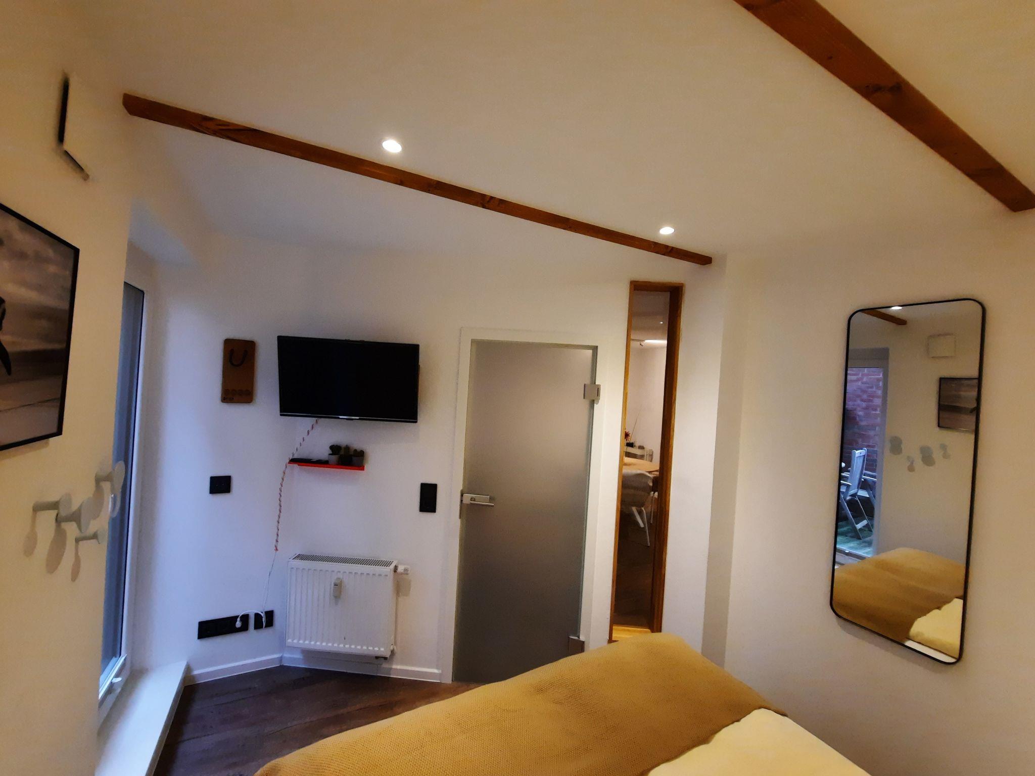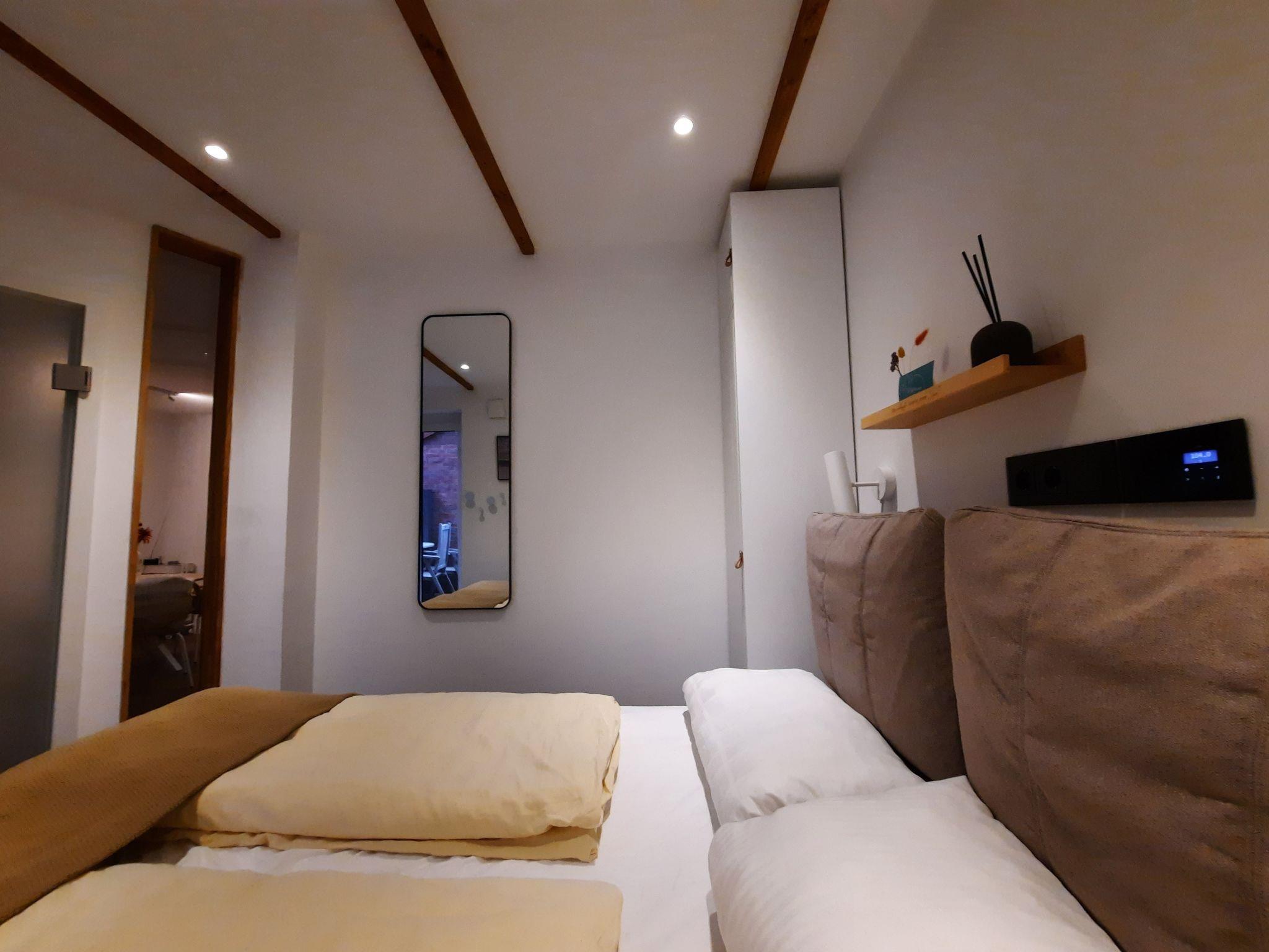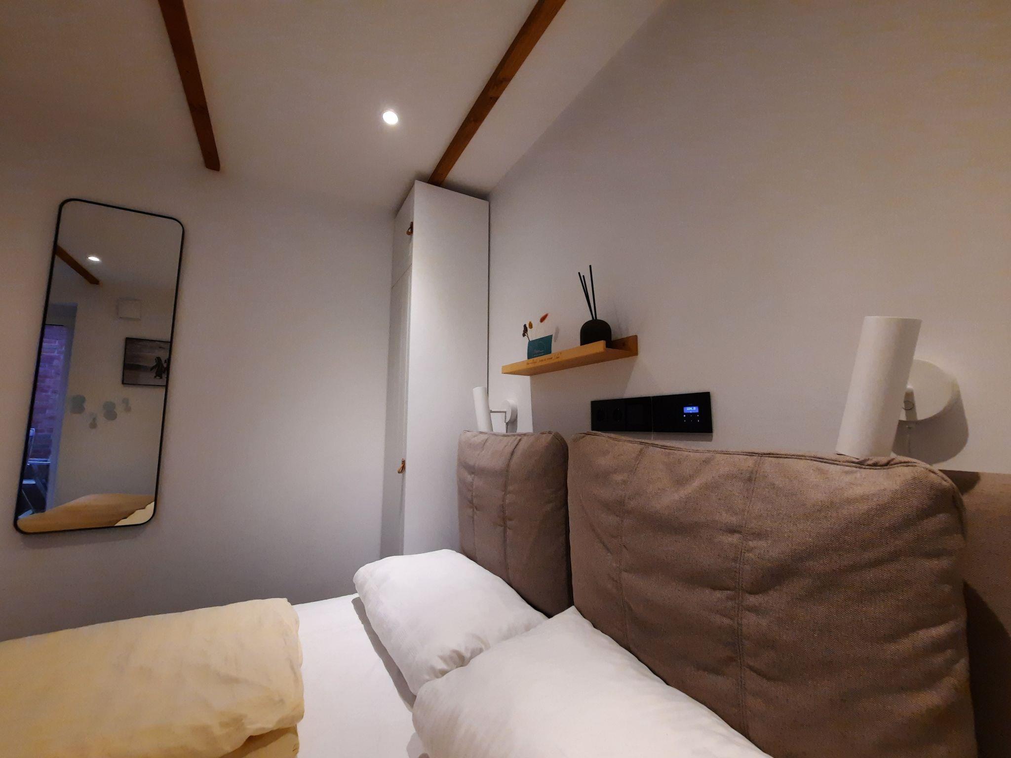 The bedroom has a box-spring bed measuring 1.60 m x 2.00 m and two wardrobes. From the bed, you can comfortably use the flat-screen TV including Sonos soundbar on the opposite wall. The floor-to-ceiling window can be opened completely and leads to the terrace.
