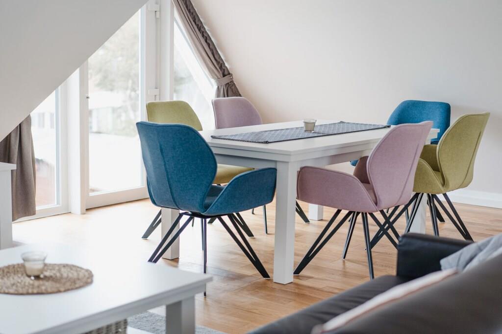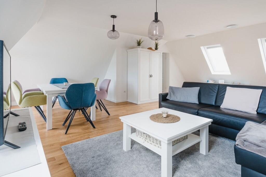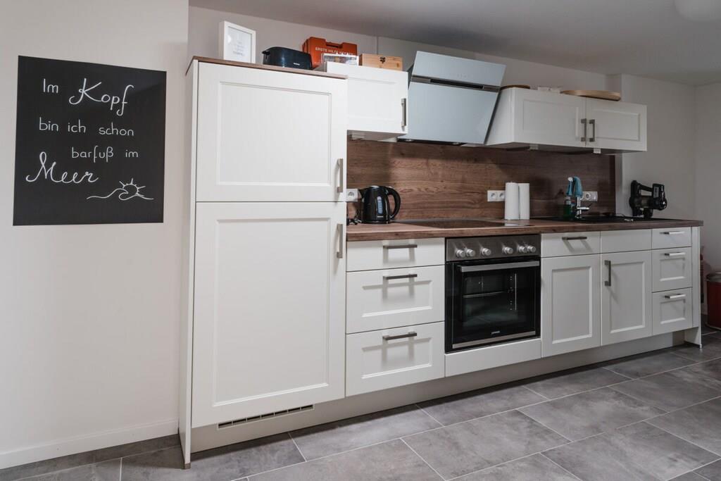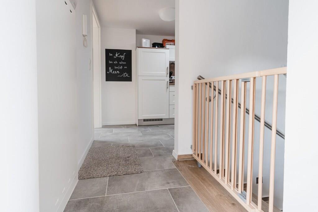 Auf 75 qm treffen moderne Einrichtung und gemütliches Ambiente aufeinander. Zahlreiche Dachflächenfenster und ein außergewöhnliches Dreiecksfenster sorgen für eine maximale Lichtdurchflutung. Ganz besonders der integrierte Gaskamin lädt nach einem ausgiebigen Strandspaziergang dazu ein, den Abend mit Buch und Wolldecke auf dem Ohrensessel zu verbringen. Natürlich steht dank großzügigem Eck-Ledersofa und großem Smart-TV auch Filmabenden über Fernsehen, Netflix und Co. nichts im Wege. Dank WLAN können Sie natürlich auch rund um die Uhr schnelles Internet nutzen. Wir bieten Schlafgelegenheiten en masse: Ein großes Schlafzimmer mit Doppelbett und eigenem Smart-TV (Netflix & Co. verfügbar), ein Schlafzimmer mit zwei bewegbaren Einzelbetten sowie ein multifunktionales Schlafsofa mit vollintegriertem Doppelbettgestell versprechen erholsame Nächte. Sechs Erwachsene finden hier ohne Probleme Platz. Für ausreichend Decken, Kissen und frische Bezüge ist selbstverständlich gesorgt. Sie haben Kinder? Familienfreundlichkeit ist uns wichtig! Darum ist neben einer Treppensicherung auch für einen TÜV-geprüften Kinderhochstuhl gesorgt, der jederzeit zu Kinderstuhl und -tisch umgesteckt werden kann. Das Highlight im geräumigen Bad mit Fenster ist neben der integrierten Fußbodenheizung, die sich in der gesamten Wohnung befindet, die Wasserfallfunktion der Dusche. Auch eine eigene Waschmaschine und ein Trockner stehen zur freien Verfügung. Für jeden Gast legen wir Ihnen mindestens zwei Handtücher parat. Sie kochen gerne? Kein Problem! Die voll ausgestattete Küche verfügt über alle Annehmlichkeiten, die Sie sich wünschen. Neben Kaffeemaschine, Wasserkocher, Toaster und Mikrowelle sind auch ein Vier-Flächen-Herd und ein Backofen vorhanden. Und weil im Urlaub nun wirklich niemand abwaschen sollte, lassen Sie den Geschirrspüler diese Arbeit für sich machen.