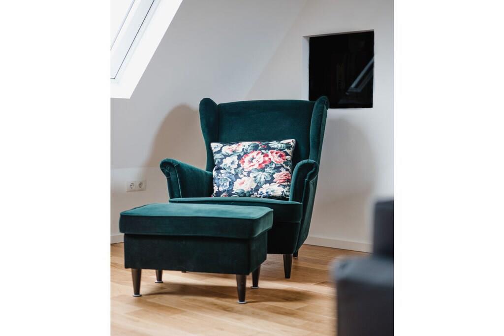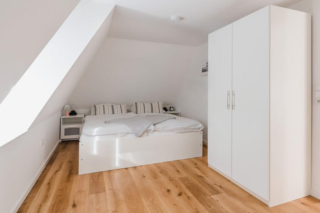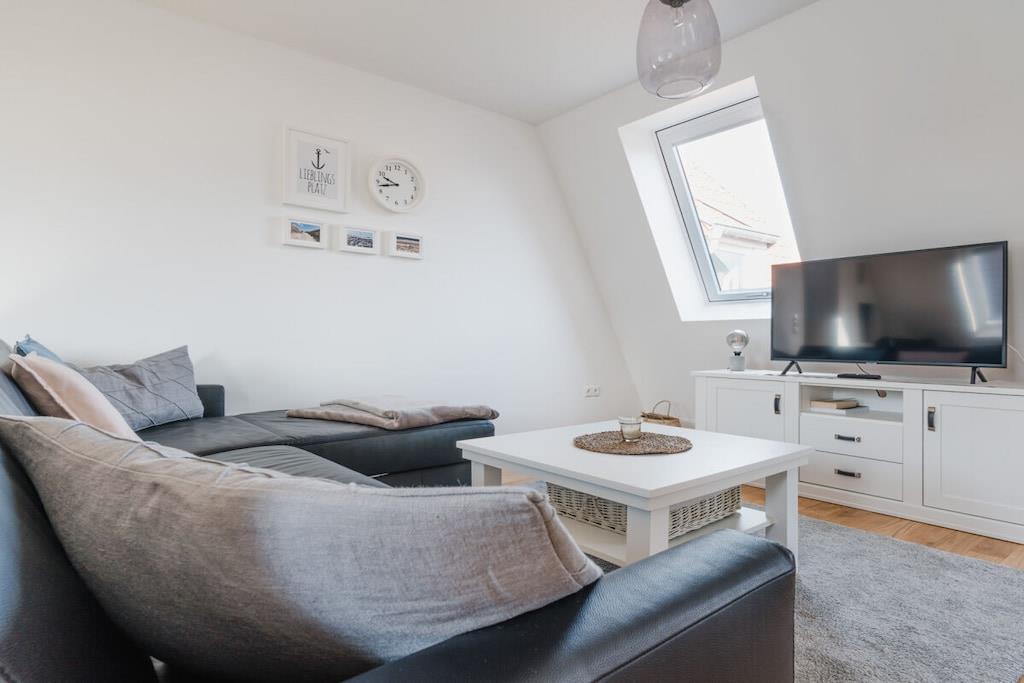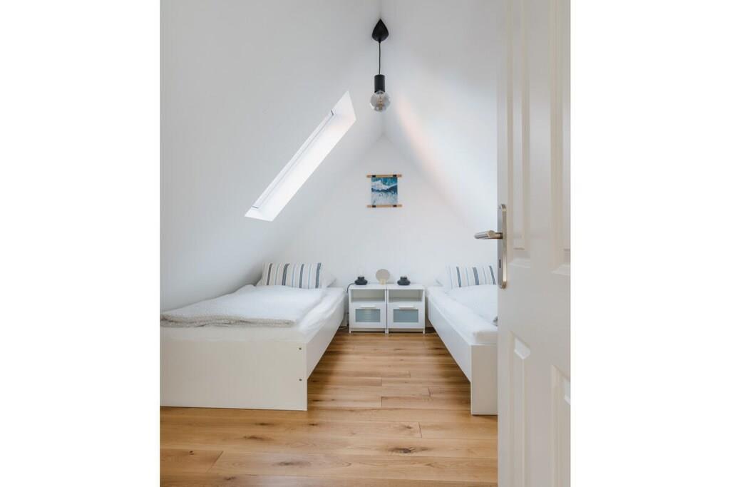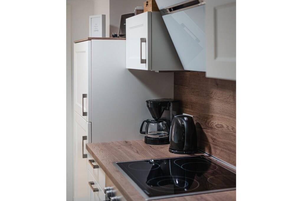 Auf 75 qm treffen moderne Einrichtung und gemütliches Ambiente aufeinander. Zahlreiche Dachflächenfenster und ein außergewöhnliches Dreiecksfenster sorgen für eine maximale Lichtdurchflutung. Ganz besonders der integrierte Gaskamin lädt nach einem ausgiebigen Strandspaziergang dazu ein, den Abend mit Buch und Wolldecke auf dem Ohrensessel zu verbringen. Natürlich steht dank großzügigem Eck-Ledersofa und großem Smart-TV auch Filmabenden über Fernsehen, Netflix und Co. nichts im Wege. Dank WLAN können Sie natürlich auch rund um die Uhr schnelles Internet nutzen. Wir bieten Schlafgelegenheiten en masse: Ein großes Schlafzimmer mit Doppelbett und eigenem Smart-TV (Netflix & Co. verfügbar), ein Schlafzimmer mit zwei bewegbaren Einzelbetten sowie ein multifunktionales Schlafsofa mit vollintegriertem Doppelbettgestell versprechen erholsame Nächte. Sechs Erwachsene finden hier ohne Probleme Platz. Für ausreichend Decken, Kissen und frische Bezüge ist selbstverständlich gesorgt. Sie haben Kinder? Familienfreundlichkeit ist uns wichtig! Darum ist neben einer Treppensicherung auch für einen TÜV-geprüften Kinderhochstuhl gesorgt, der jederzeit zu Kinderstuhl und -tisch umgesteckt werden kann. Das Highlight im geräumigen Bad mit Fenster ist neben der integrierten Fußbodenheizung, die sich in der gesamten Wohnung befindet, die Wasserfallfunktion der Dusche. Auch eine eigene Waschmaschine und ein Trockner stehen zur freien Verfügung. Für jeden Gast legen wir Ihnen mindestens zwei Handtücher parat. Sie kochen gerne? Kein Problem! Die voll ausgestattete Küche verfügt über alle Annehmlichkeiten, die Sie sich wünschen. Neben Kaffeemaschine, Wasserkocher, Toaster und Mikrowelle sind auch ein Vier-Flächen-Herd und ein Backofen vorhanden. Und weil im Urlaub nun wirklich niemand abwaschen sollte, lassen Sie den Geschirrspüler diese Arbeit für sich machen.