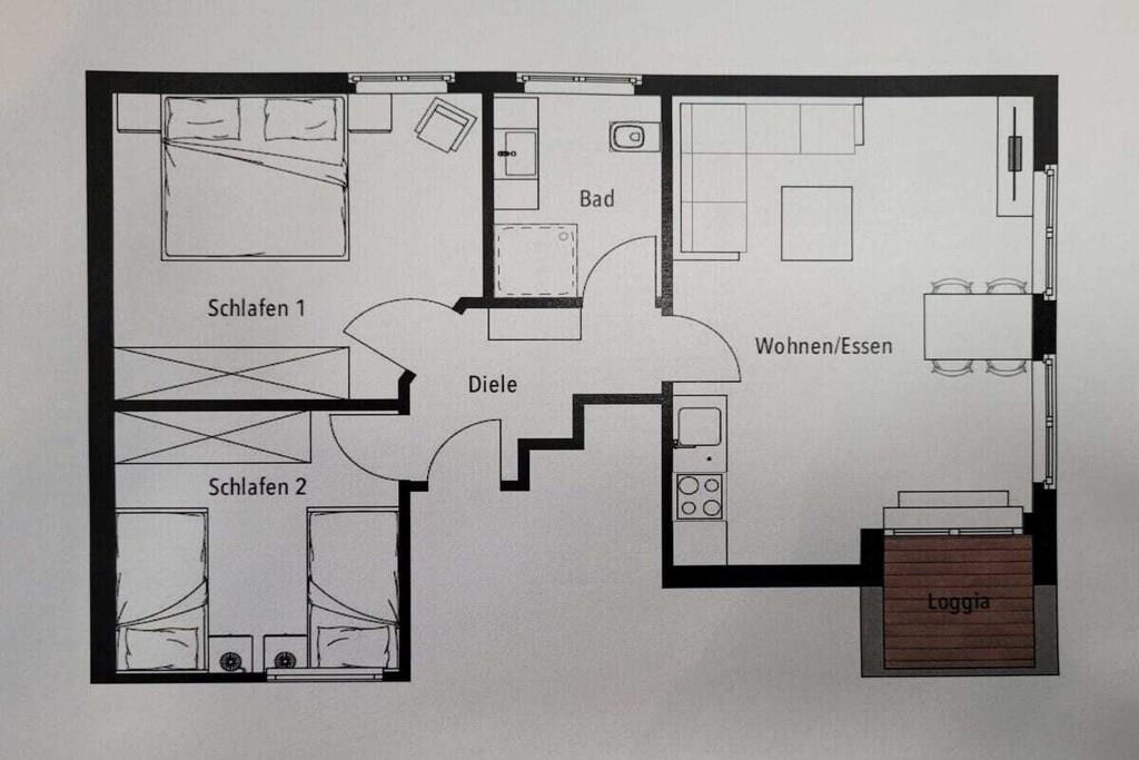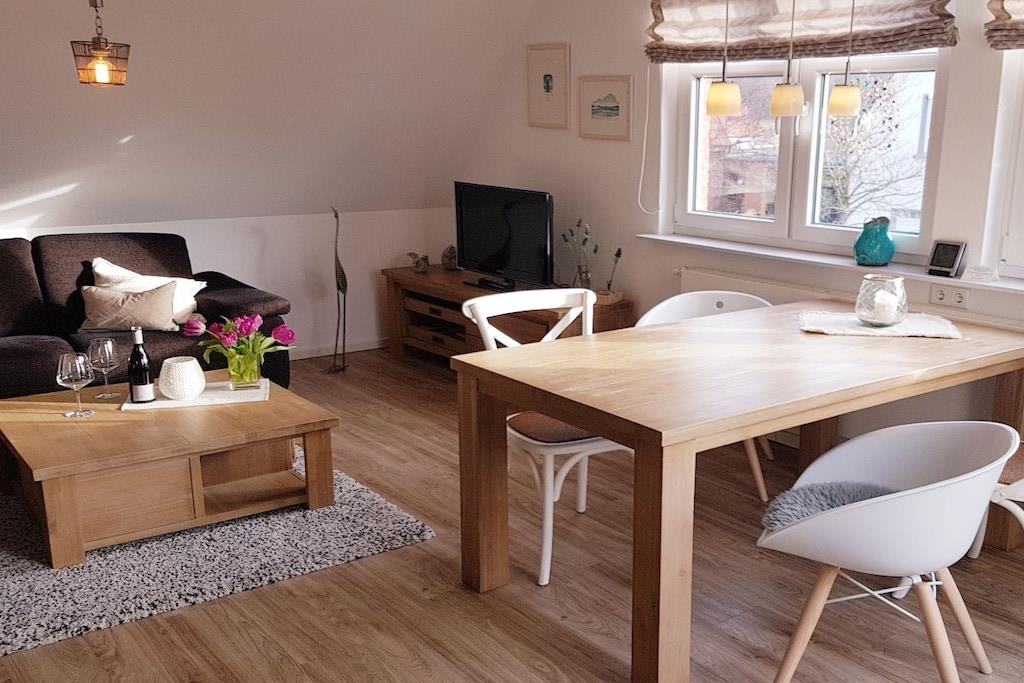 The holiday apartment is lovingly and brightly furnished with individual amenities. The high-quality 3-room apartment (approx. 50 sqm) on the 1st floor offers two separate bedrooms (1 flat-screen TV), a living room (flat-screen TV) with a fully equipped kitchenette (microwave, dishwasher, coffee maker, kettle, 4-burner ceramic stove), a bathroom, and a hallway. A small rooftop balcony (loggia for 2 people) invites you to linger. The apartment accommodates 2-3 people (non-smoking). A 4th person can be accommodated upon request. Bicycle racks are available at the house (uncovered). (Please note that the apartment is not suitable for groups or clubs, and pets are unfortunately not allowed.) Virtual tour of the apartment is available on the website www.haus-cramer-norderney.de