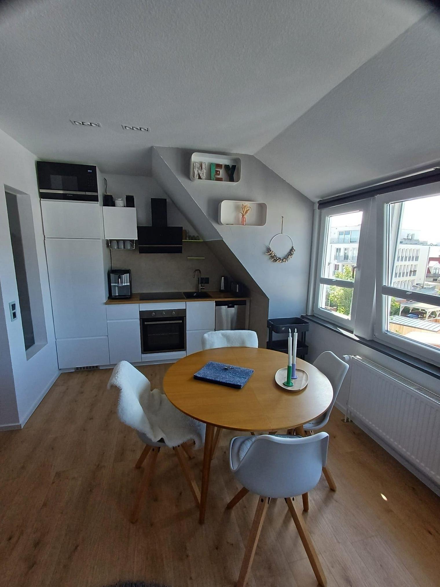 Die Küche ist mit allen nötigen Utensilien wie Kühlschrank inklusive Gefrierfach, Wasserkocher, Mikrowelle mit Grillfunktion, elektrischer Stabmixer, Toaster, Kaffeevollautomat, Backofen, Induktionskochfeld, Spülmaschine etc. ausgestattet (Geräte überwiegend von Siemens). Vom angrenzenden Essplatz aus hat man einen schönen Ausblick über die Dächer Norderneys.
