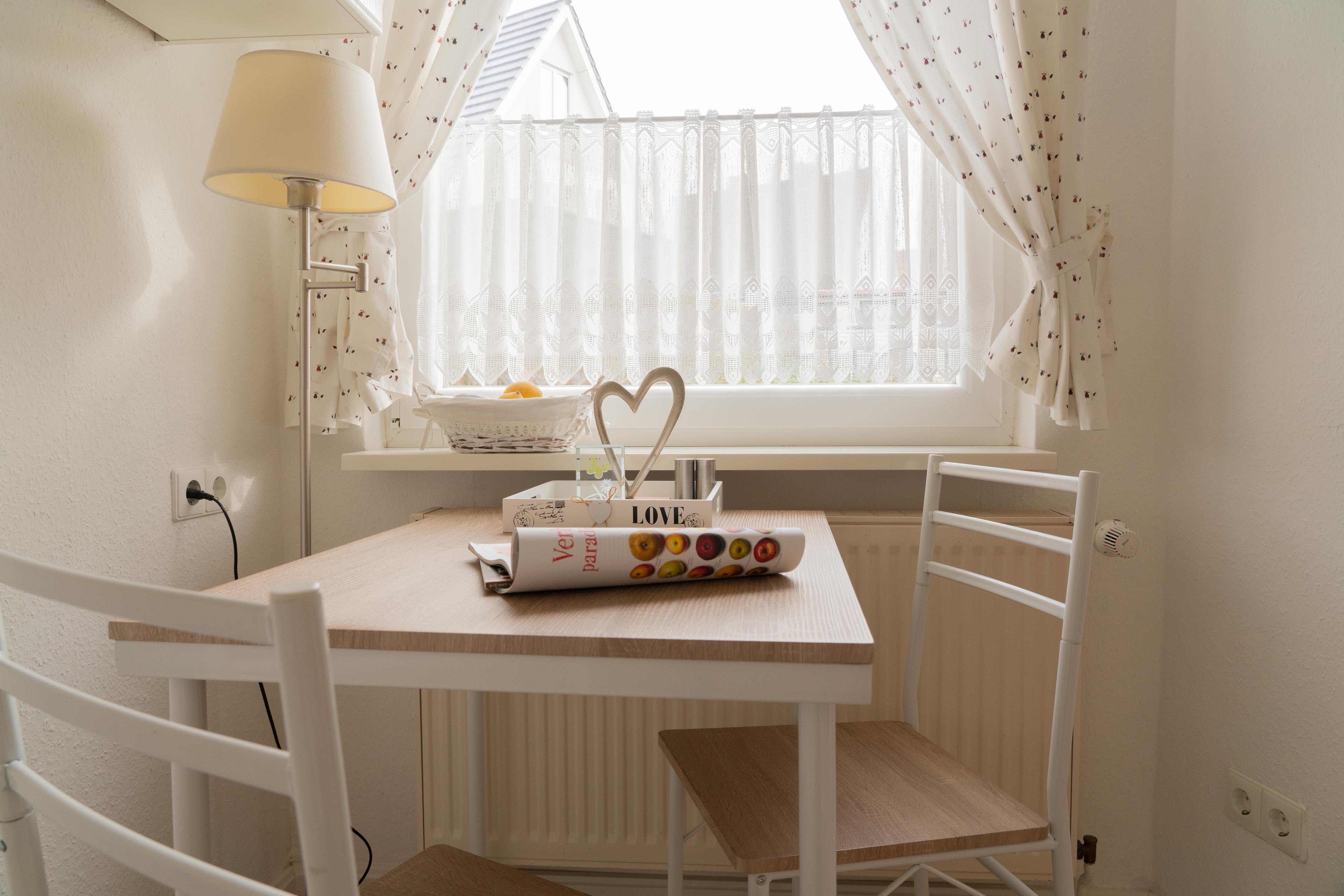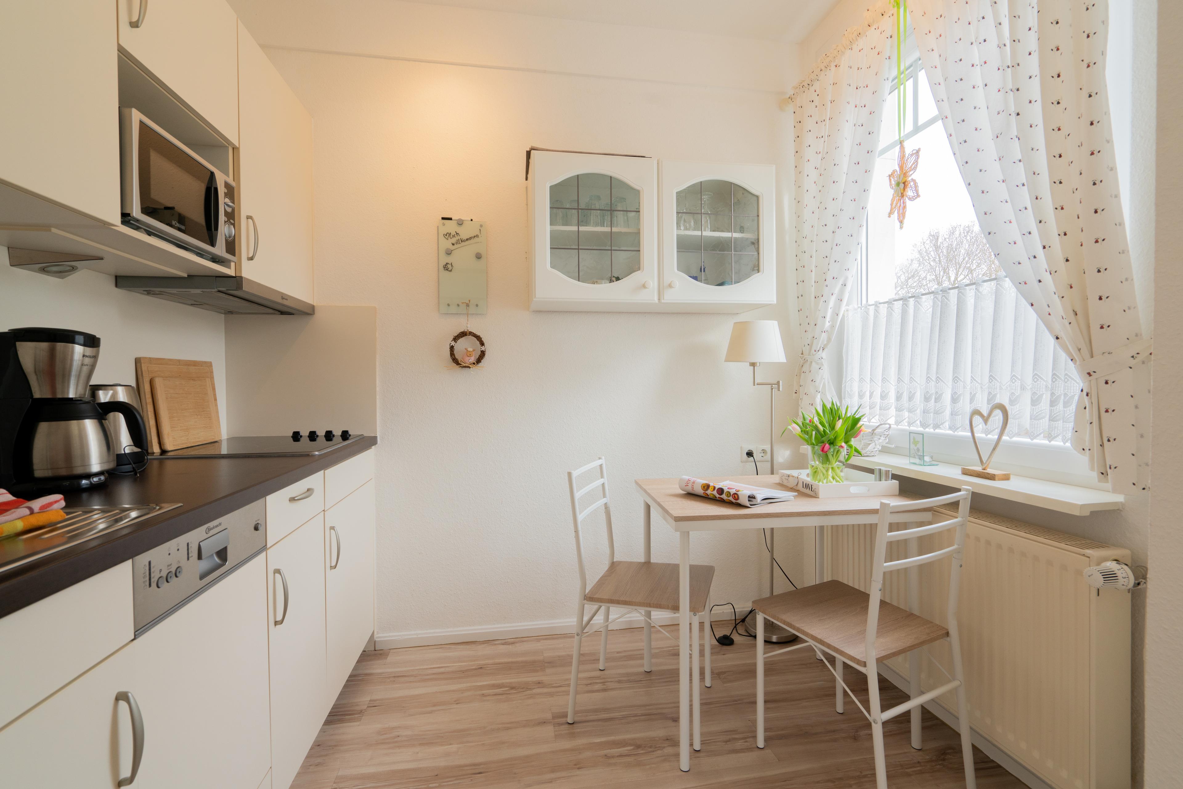 Die vollausgestattete Küche bietet einen Esstisch für zwei Personen, ein 4-Platten-Cerankochfeld, Toaster, Wasserkocher und eine Spülmaschine.