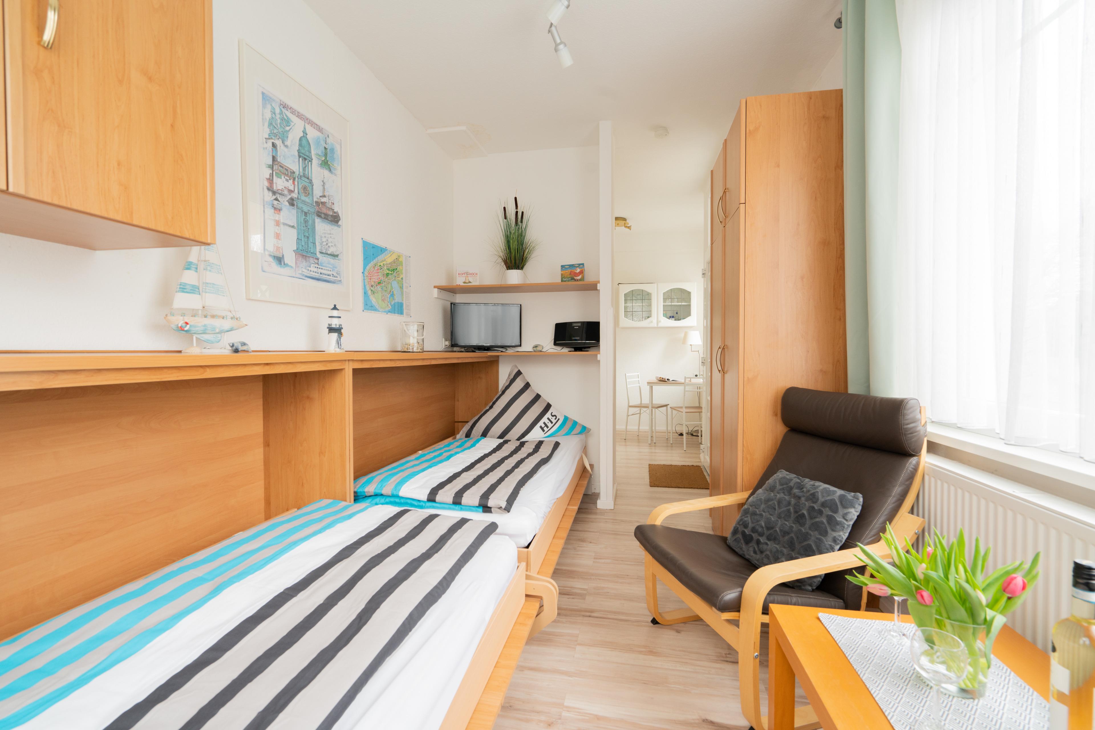 Der kombinierte Wohn-/ Schlafraum bietet ein Schrankbett mit zwei Einzelbetten (90x200cm), einem Flachbild-TV und gemütlicher Sitzecke mit zwei Sesseln.