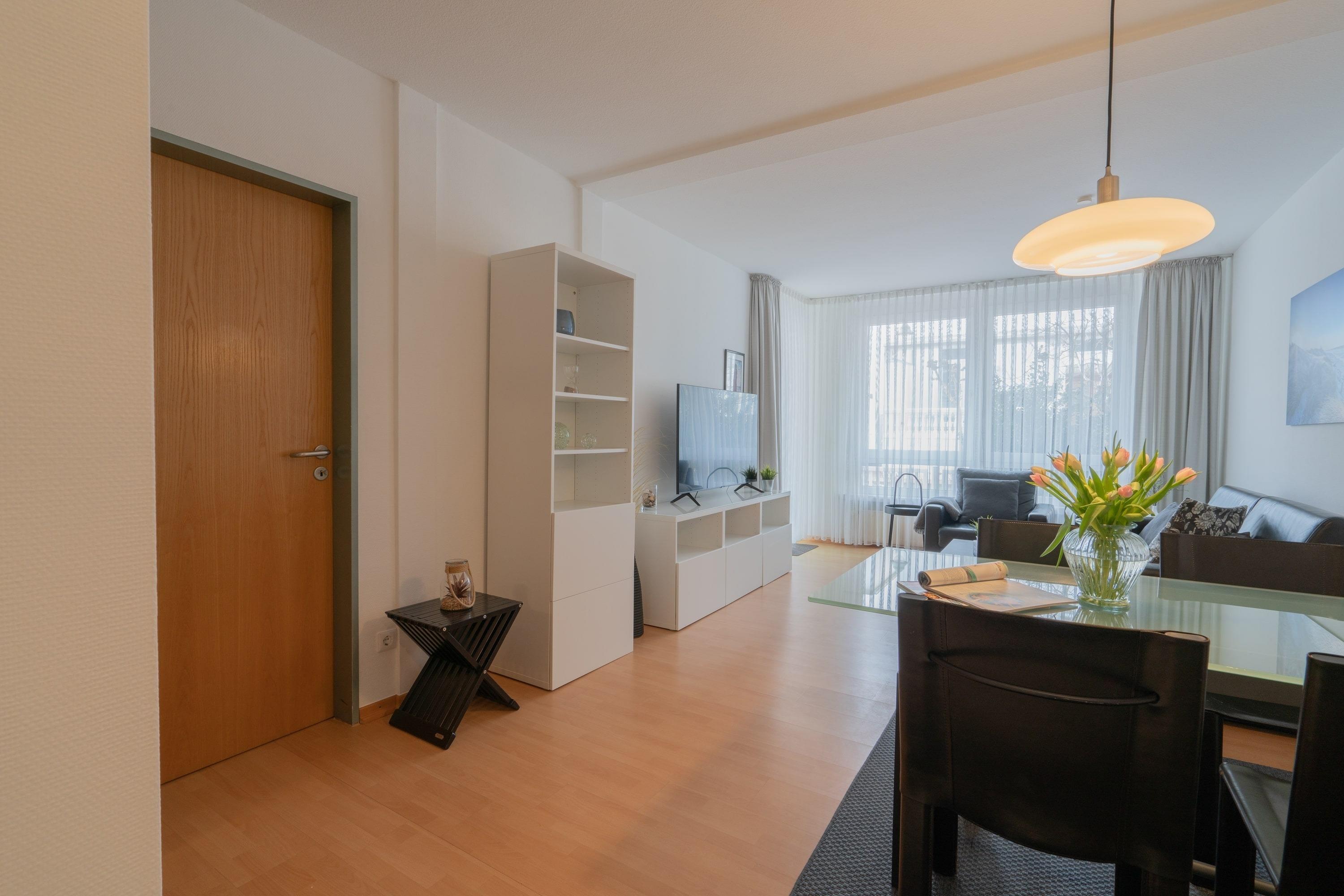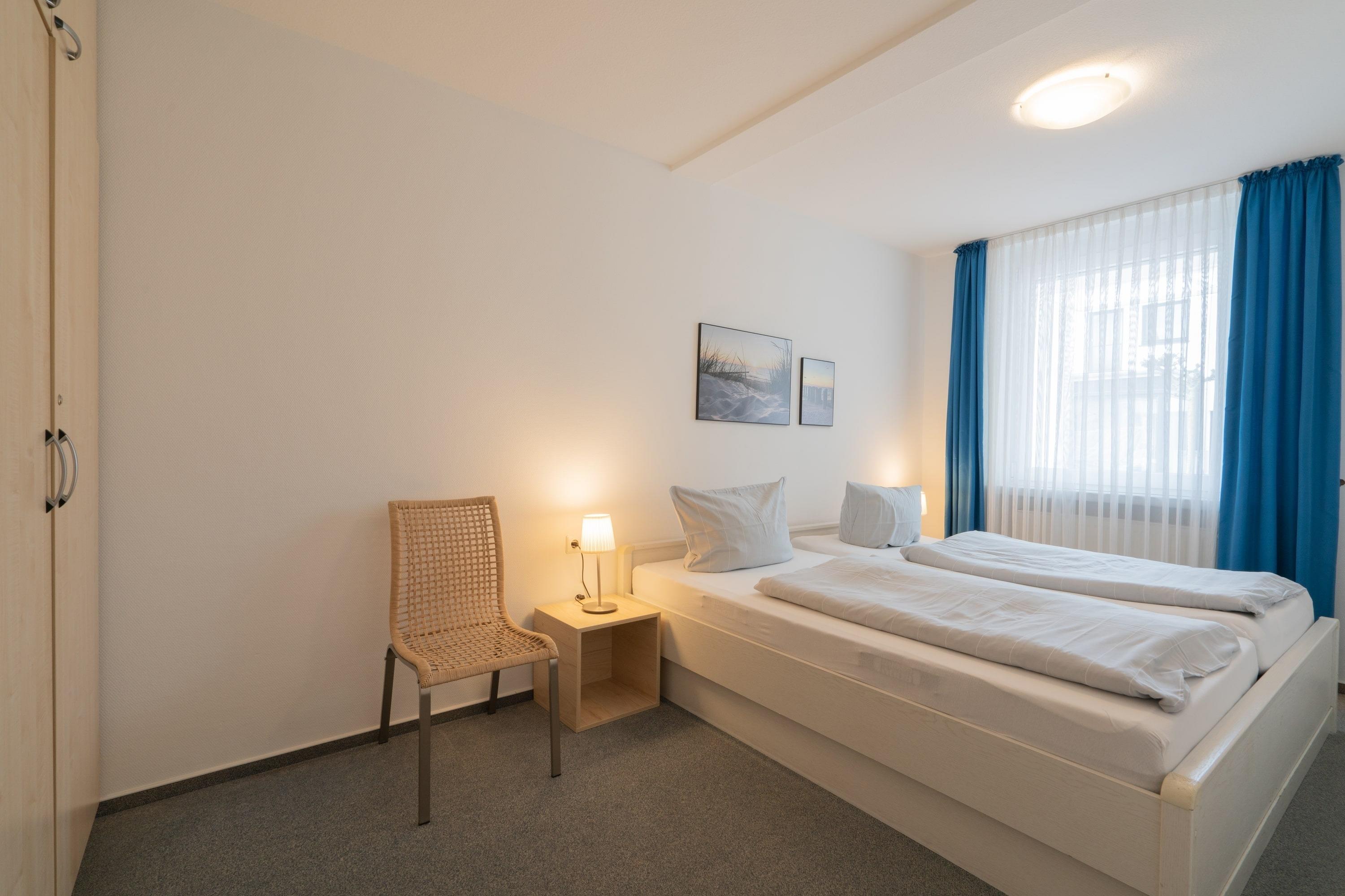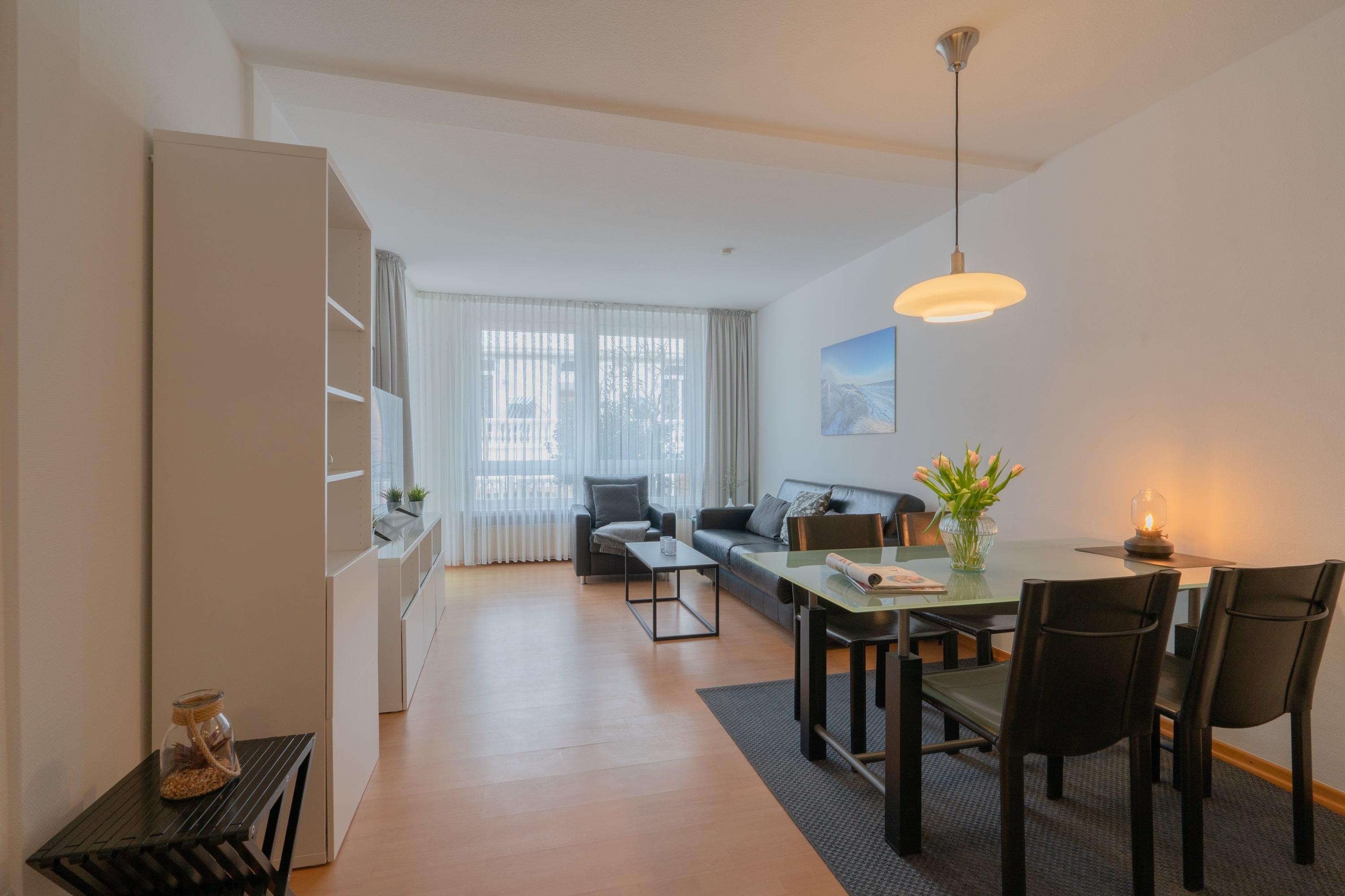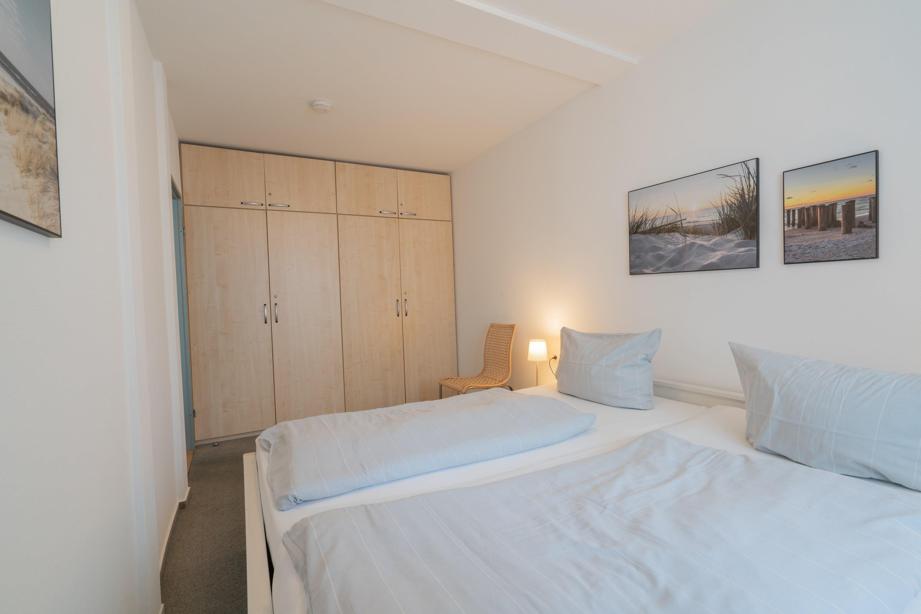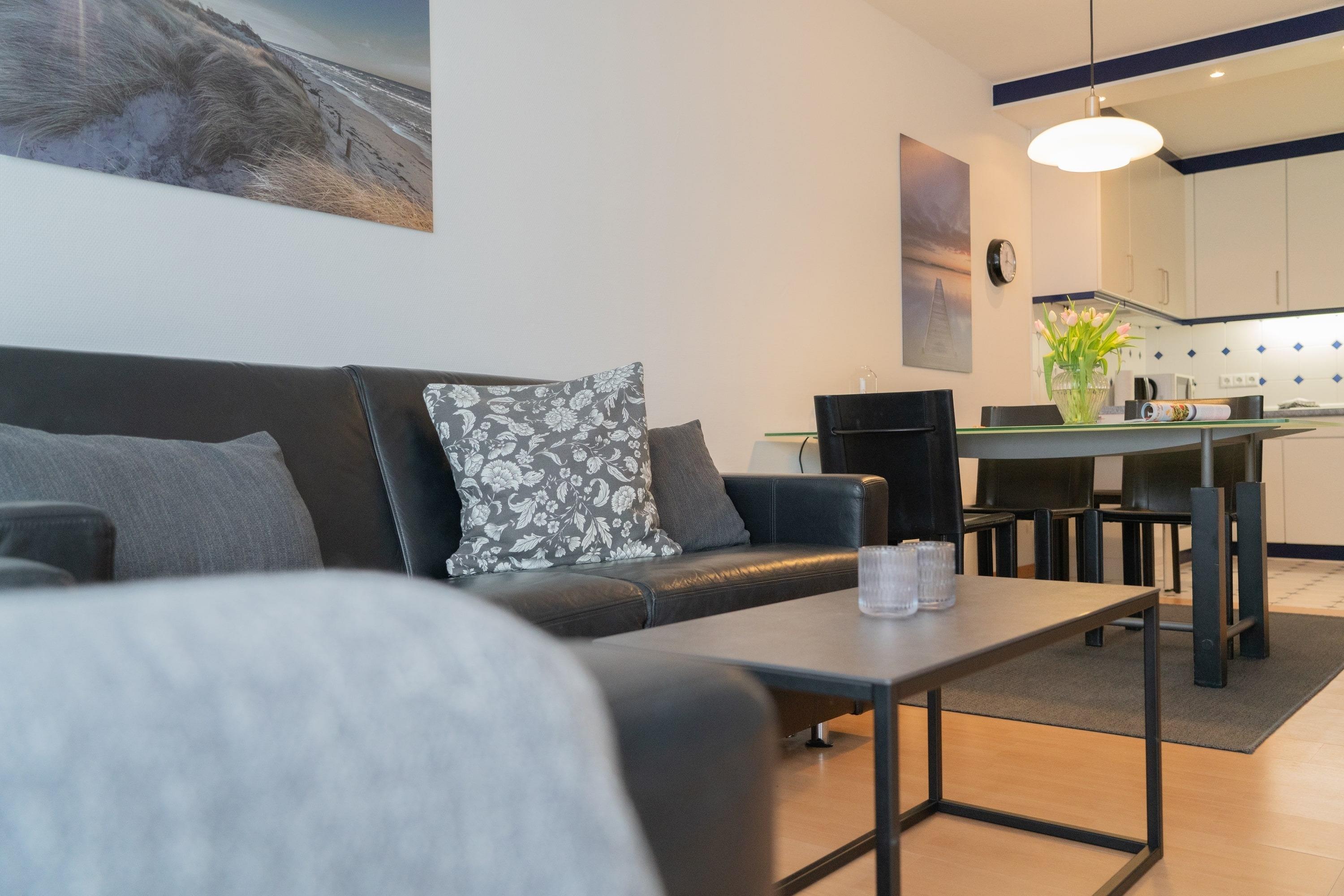 Die Wohnung überzeugt mit einer offenen Gestaltung. Das separate Schlafzimmer mit einem gemütlichen Doppelbett sorgt für erholsame Nächte, während das Schlafsofa im Wohnzimmer zusätzlichen Platz für Ihre Mitreisenden bietet. Der Wohnbereich ist hell und freundlich gestaltet – ideal, um nach einem Tag am Meer die Beine hochzulegen. Die offene Küche ist voll ausgestattet, sodass Sie sich kulinarisch austoben können.