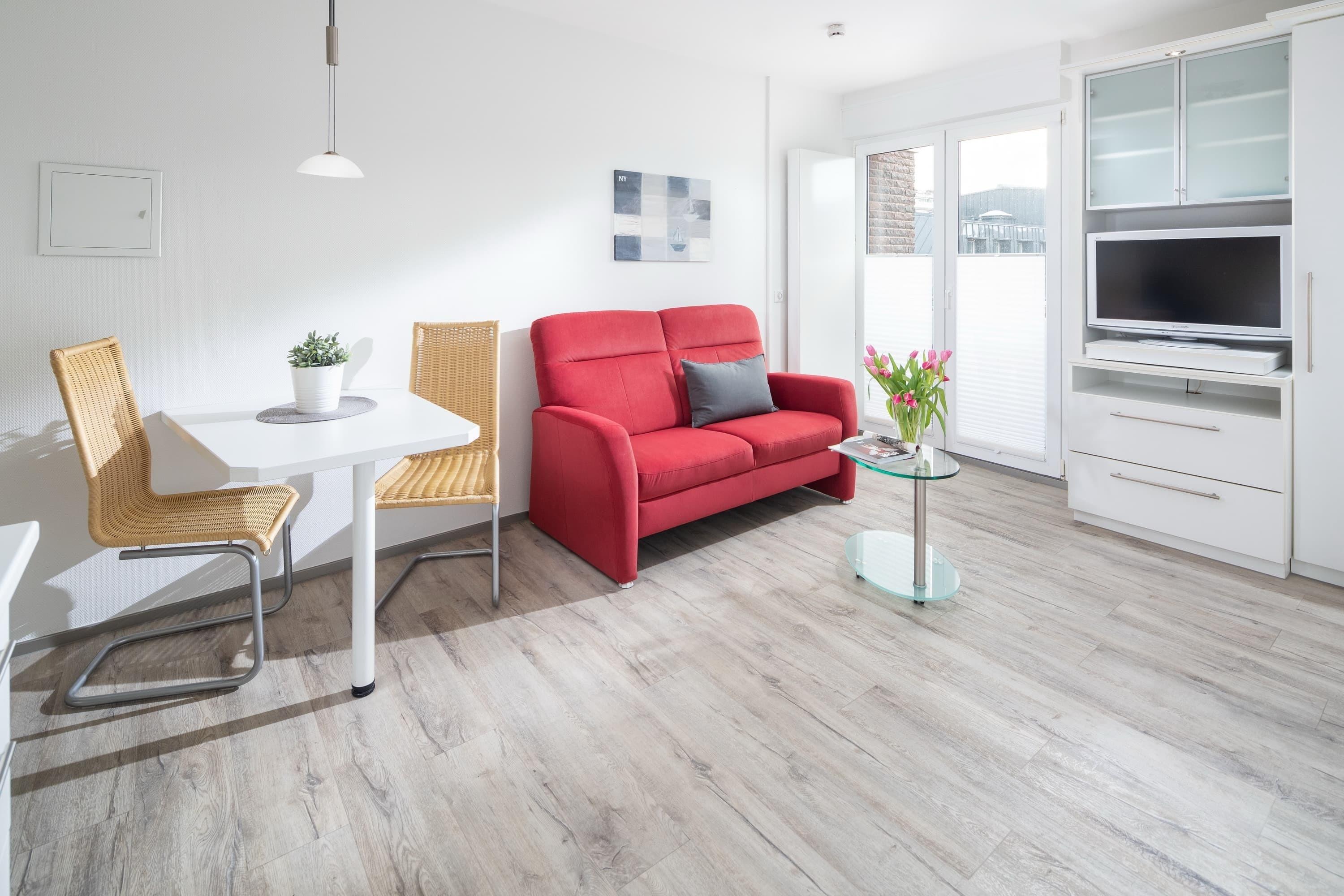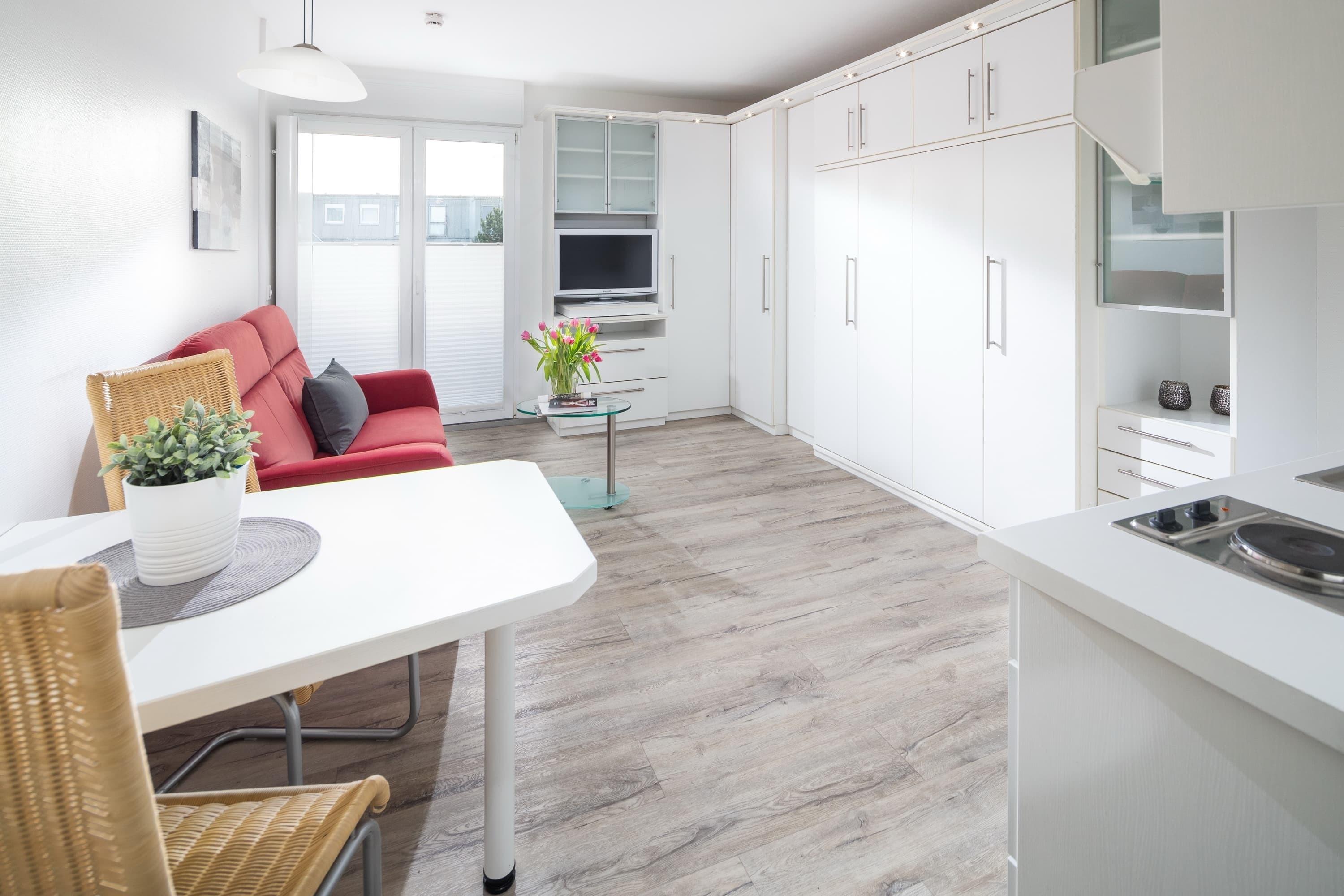 Das gemütliche Einraum-Apartment bietet Platz für 2 Personen. Neben einer gemütlichen Couch und TV steht ein platzsparendes Doppel-Schrankbett zur Verfügung. Am Esstisch kann man gemeinsam essen und spielen. Die Wohnung hat eine kleine Küchenzeile mit allen nötigen Geräten. Das Duschbad ist weiß gefliest. Die Wohnung bietet einen kleinen französischen Balkon zum Luftschnappen.