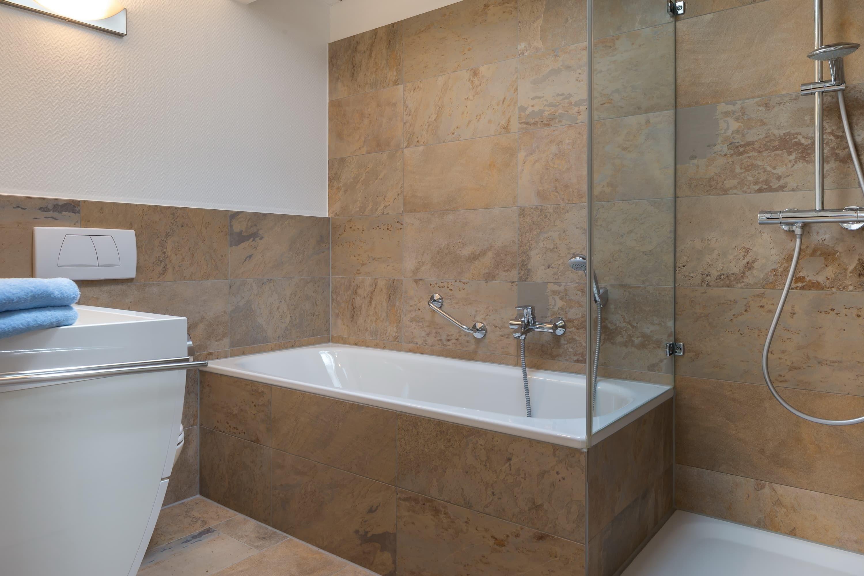 Die Wohnung erreichen Sie über den ruhig gelegenen Innenhof. Im unteren Bereich befindet sich die gemütliche Wohnküche mit geräumigem Esstisch und Zugang zum Hof mit Esstisch und Strandkorb. Über die Treppe von der Wohnküche aus gelangen Sie in den oben gelegenen Wohnbereich mit Sofa, Sesseln und Fernseher – ein Platz zum Entspannen! Von dort gehen beide Schlafzimmer (1x Doppelbett, 1x 2 Einzelbetten) und das Badezimmer ab.