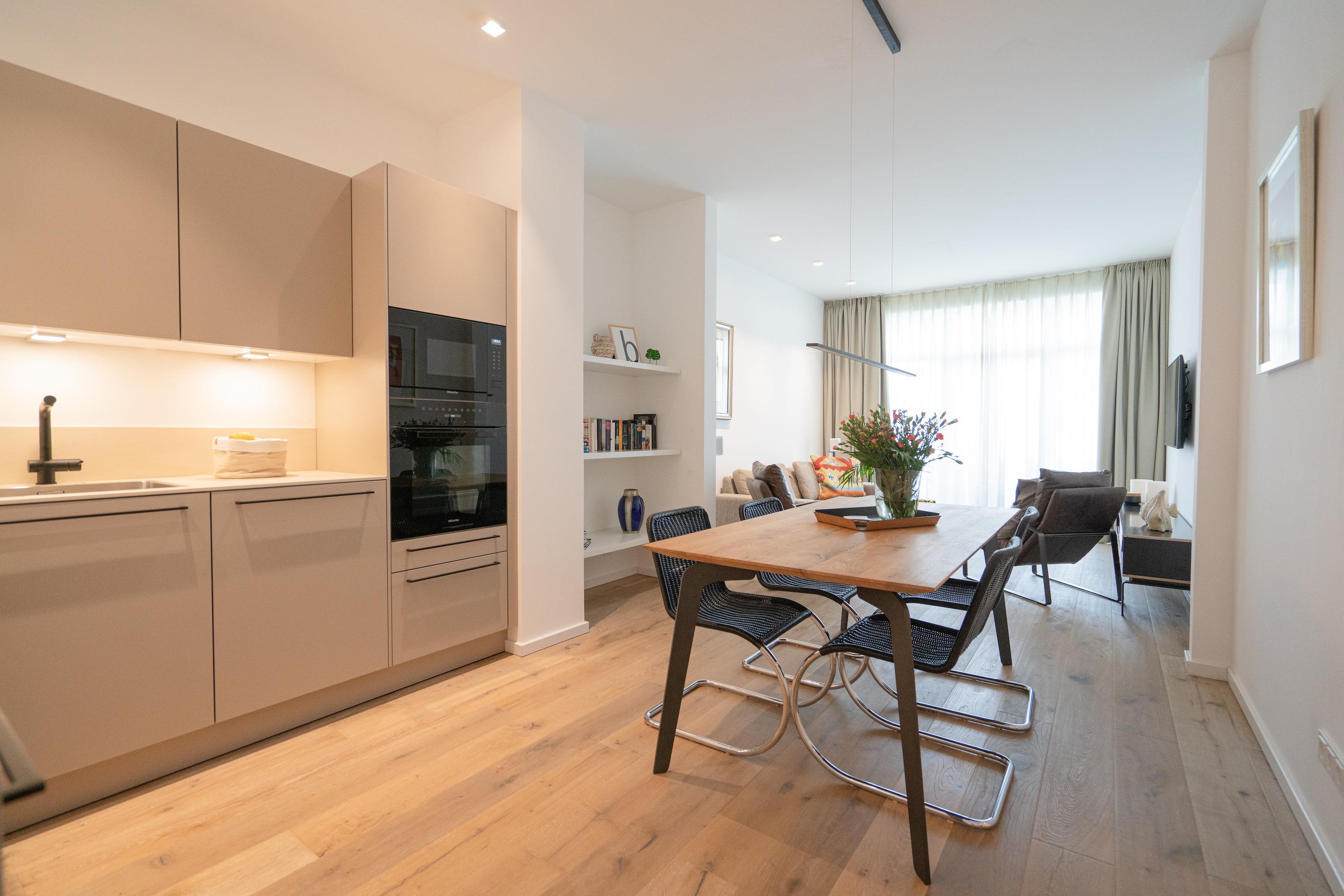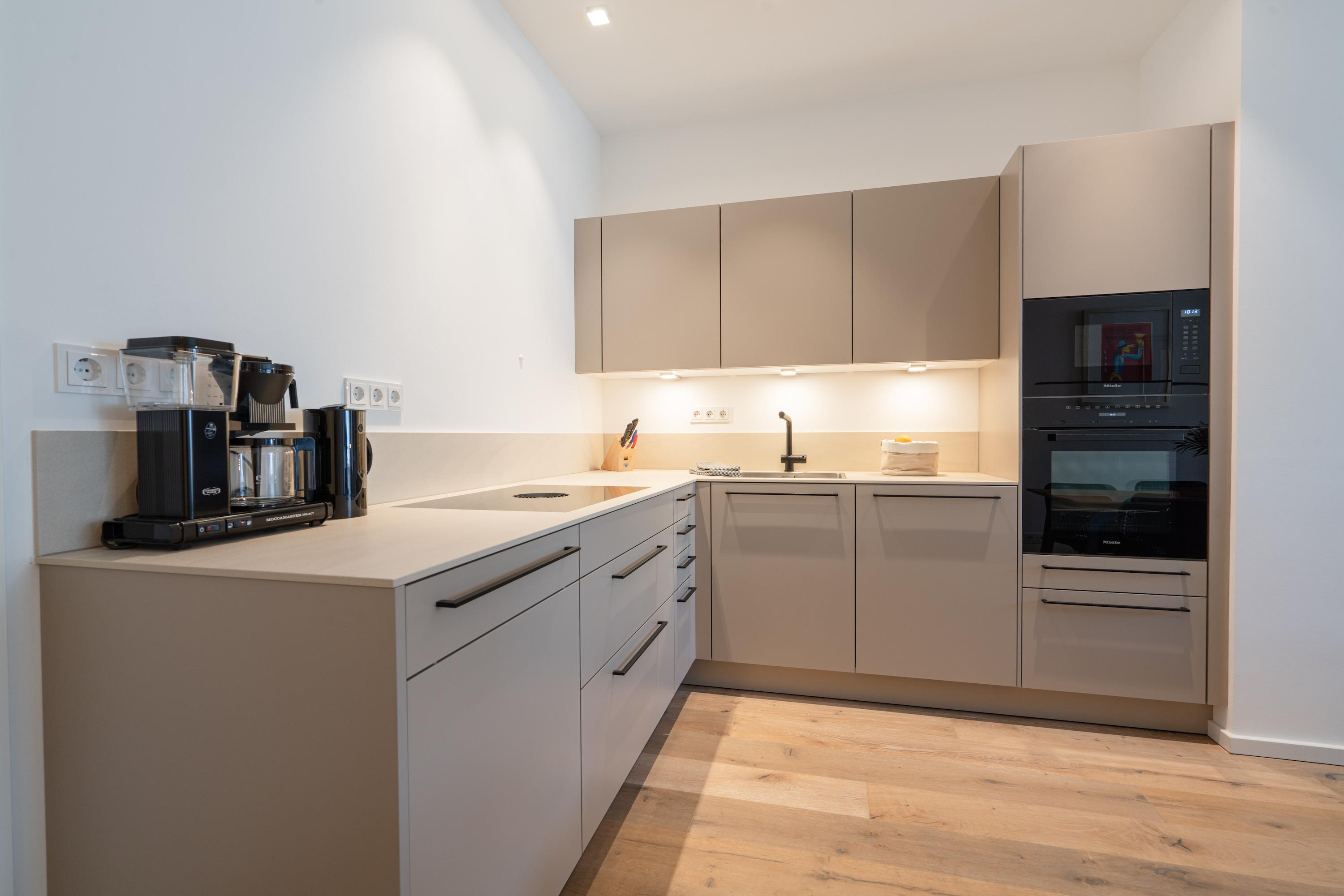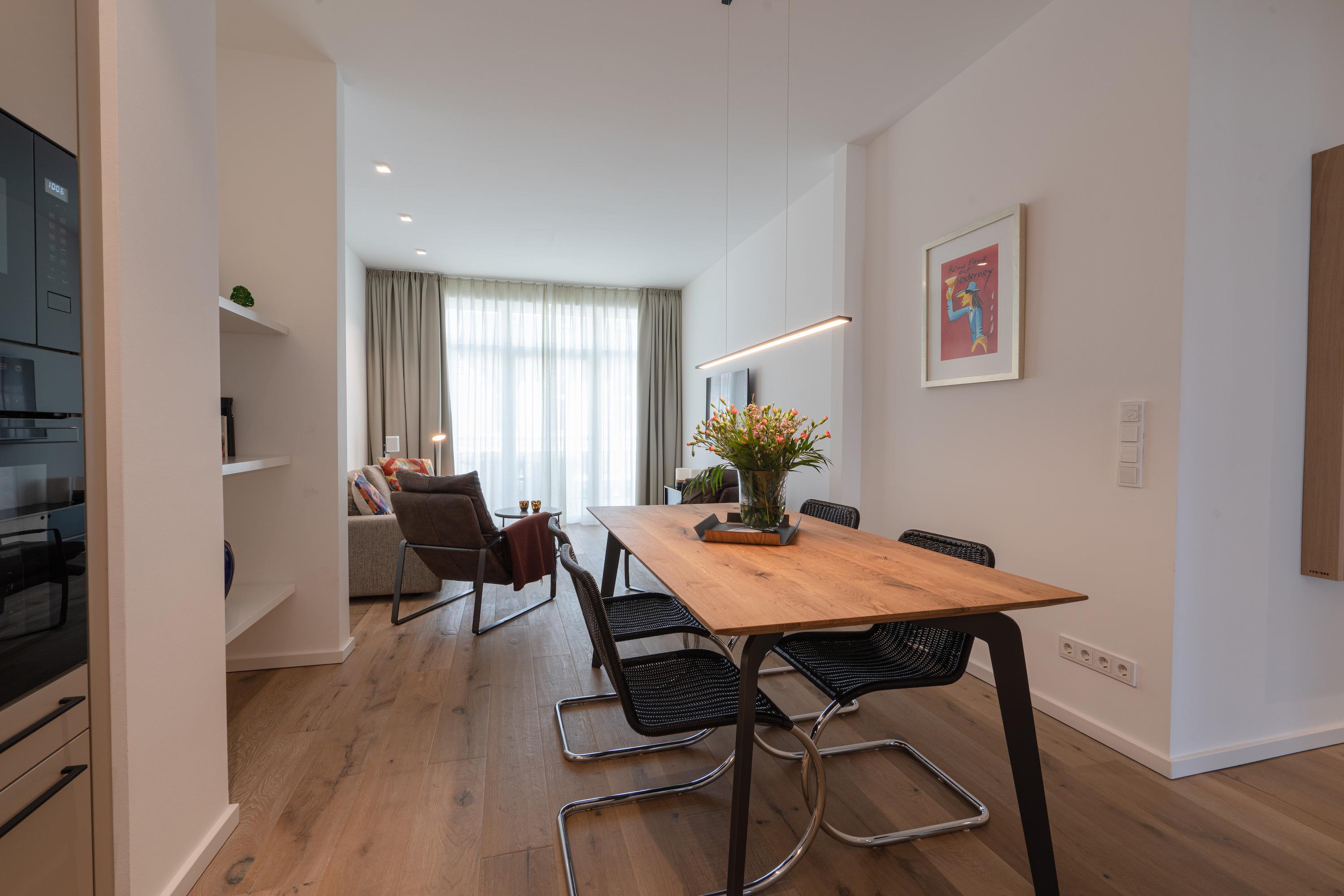 Das zur Dachterrasse gelegene, lichtdurchflutete Wohnzimmer bietet neben der gemütlichen Sofaecke mit TV und zwei Sesseln einen geräumigen Esstisch und eine angrenzende, großzügige Wohnküche. Ein perfekter Ort zum Zusammensein, Kochen, Spielen und Entspannen. Die Einbauküche bietet ein Glaskeramikkochfeld mit 4 Kochzonen, Backofen, Mikrowelle, Spülmaschine und Kühl-/Gefrierkombination.