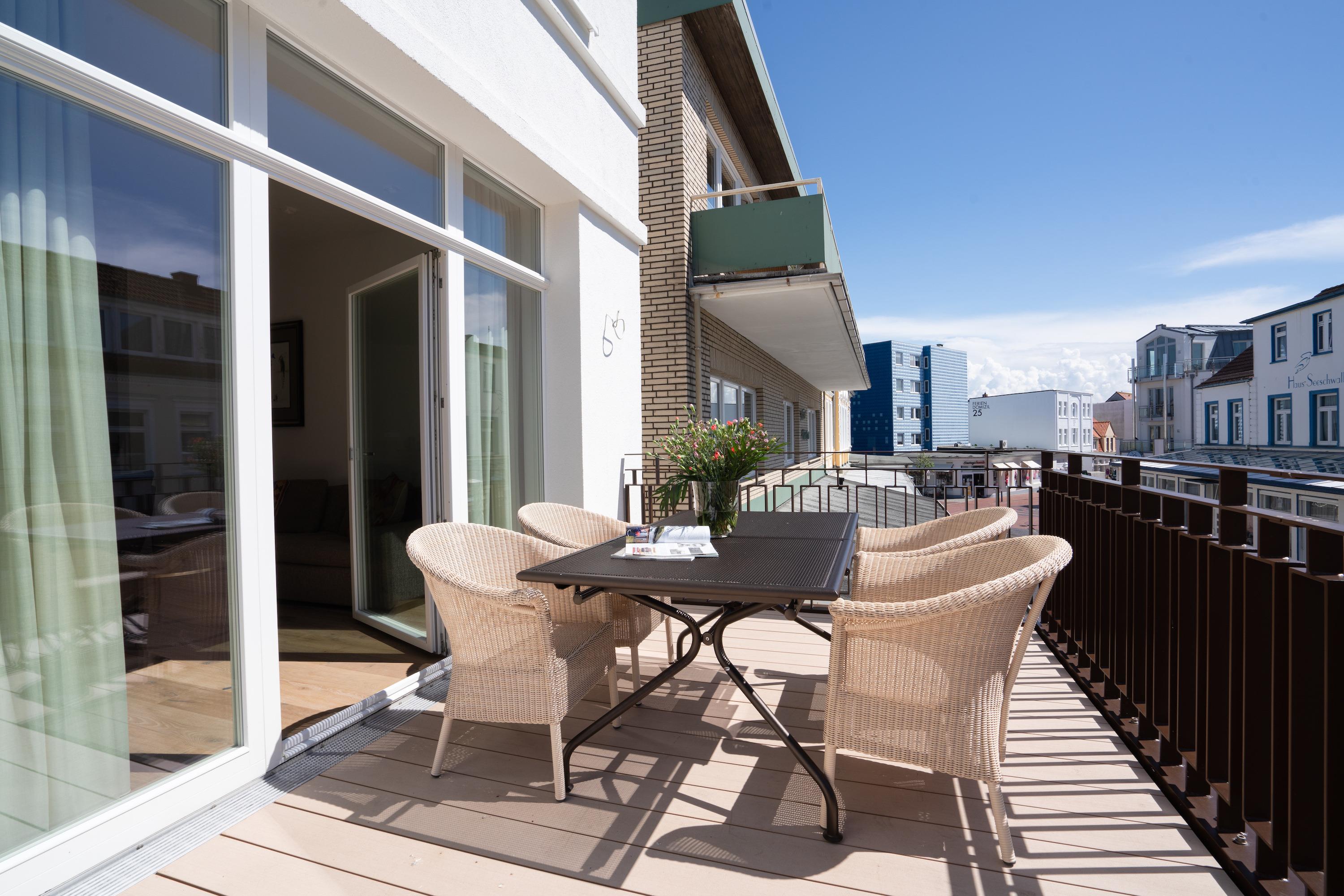 Diese exklusive „Meerliebe“ für bis zu 4 Personen lässt keine Wünsche offen. Sie befindet sich im 01. Obergeschoss und überzeugt durch den großzügigen Grundriss mit großen Wohn- und Esszimmer mit integrierter Küche, zwei Schlafräumen, 2 Badezimmern (en Suite) sowie der großen Dachterrasse, die einen kleinen, seitlichen Blick auf das Meer zulässt.