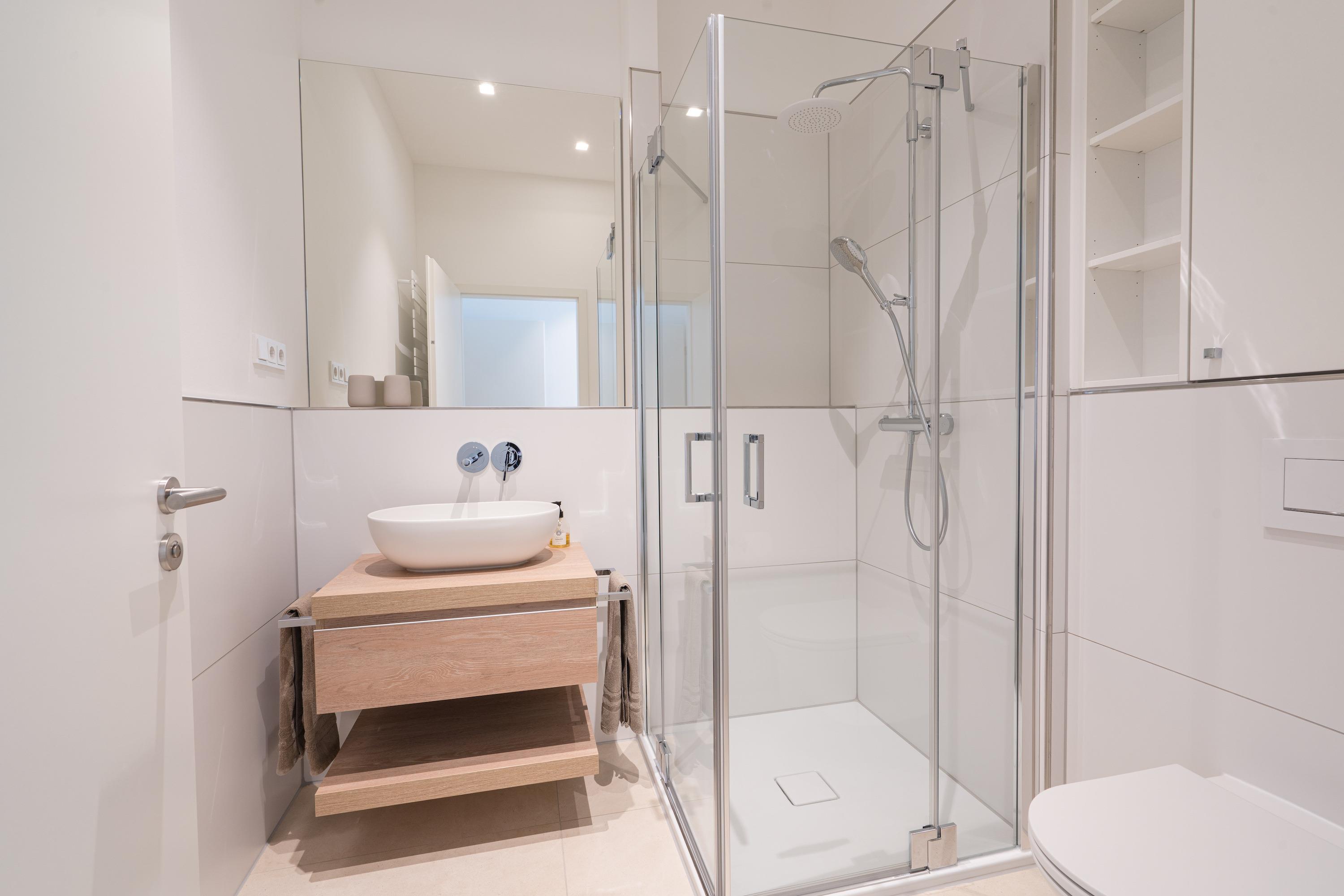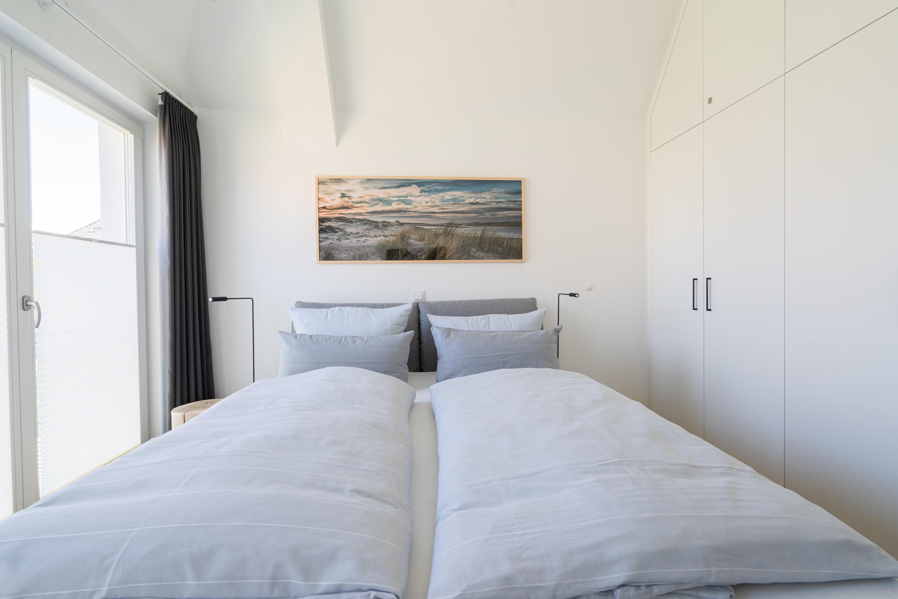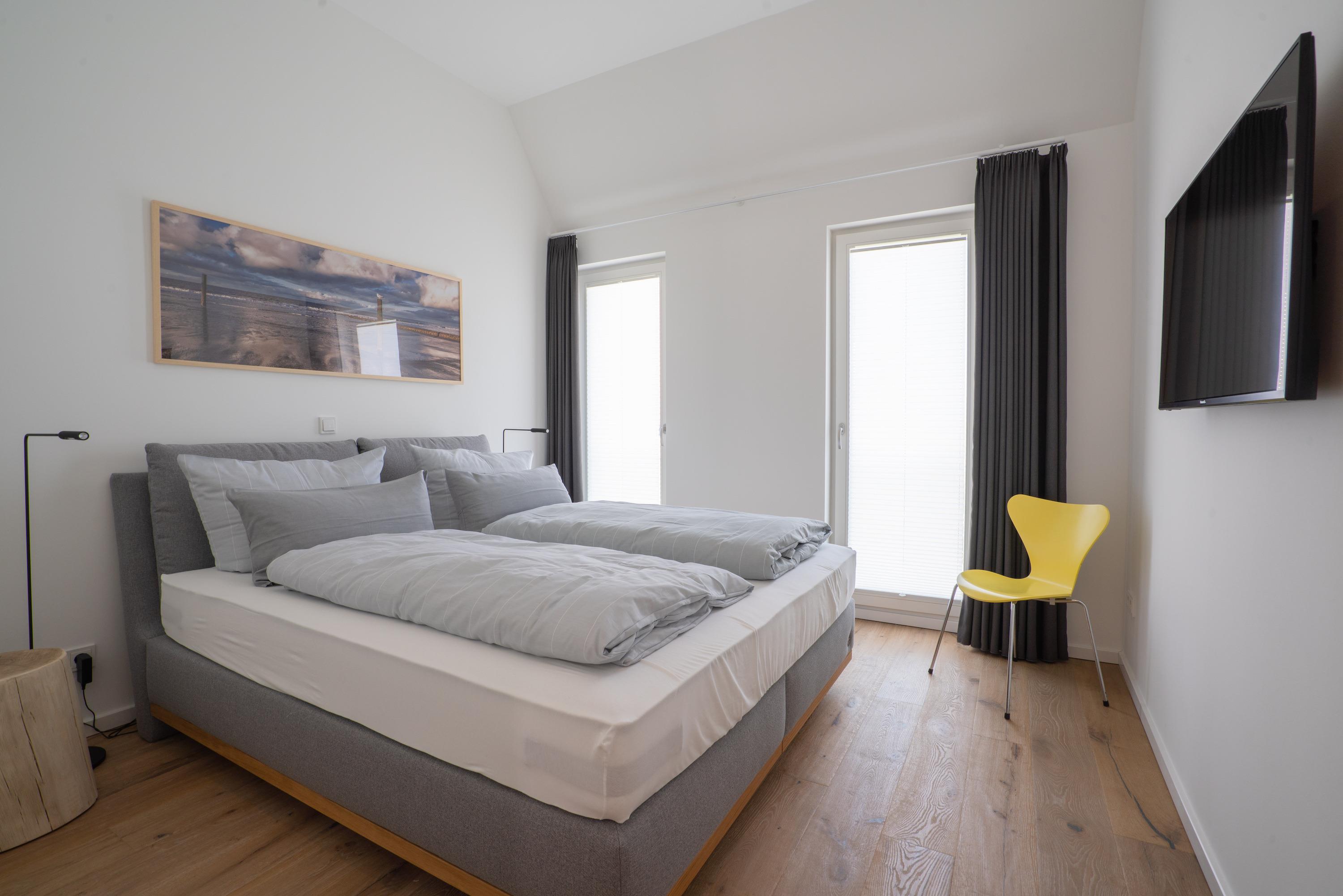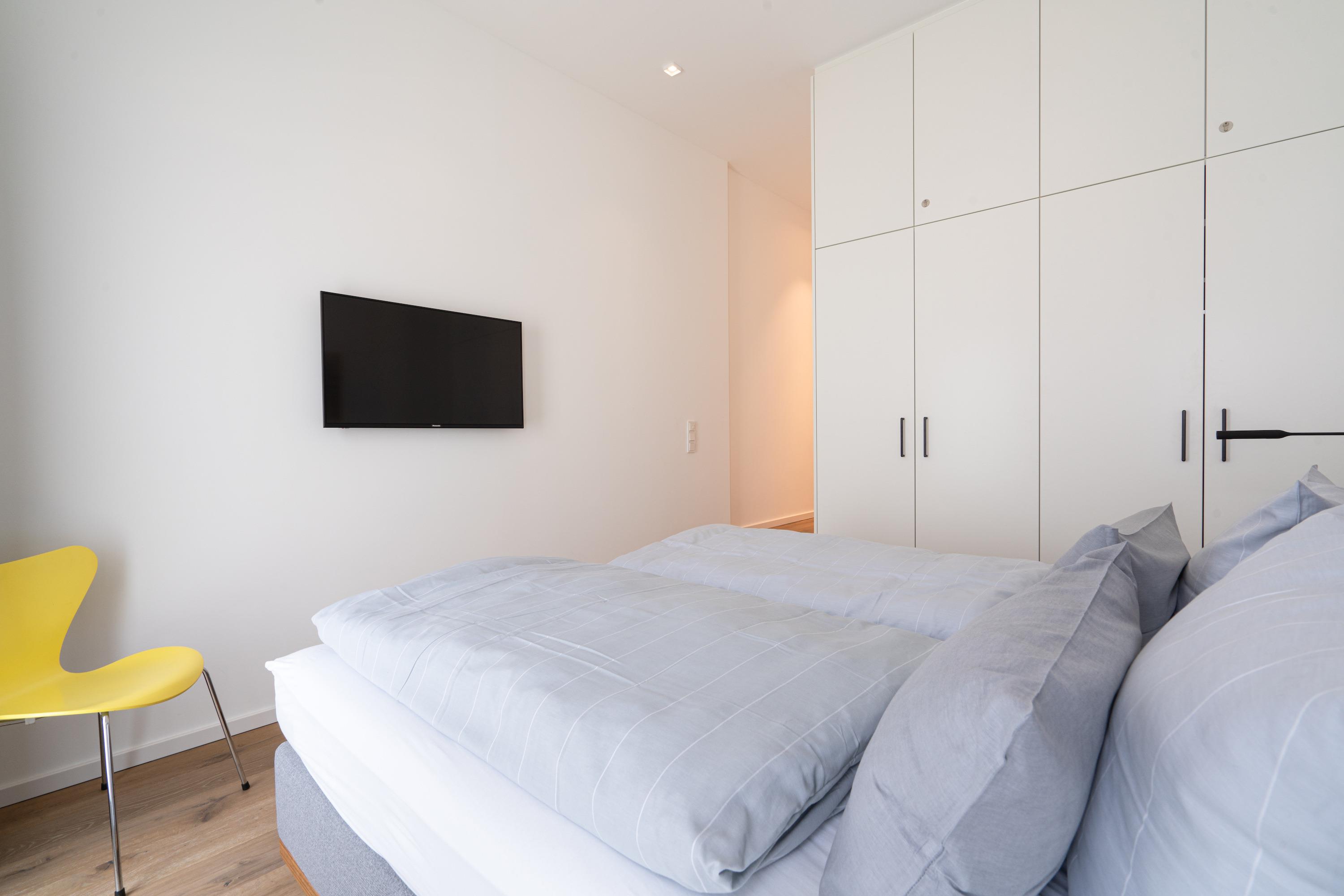 Die Wohnung verfügt über zwei Schlafräume.Beide bieten neben einem 1,80m breiten Boxspringbett ausreichend Stauraum und einen Fernseher und haben von dort Zugang zum jeweiligen Bad.