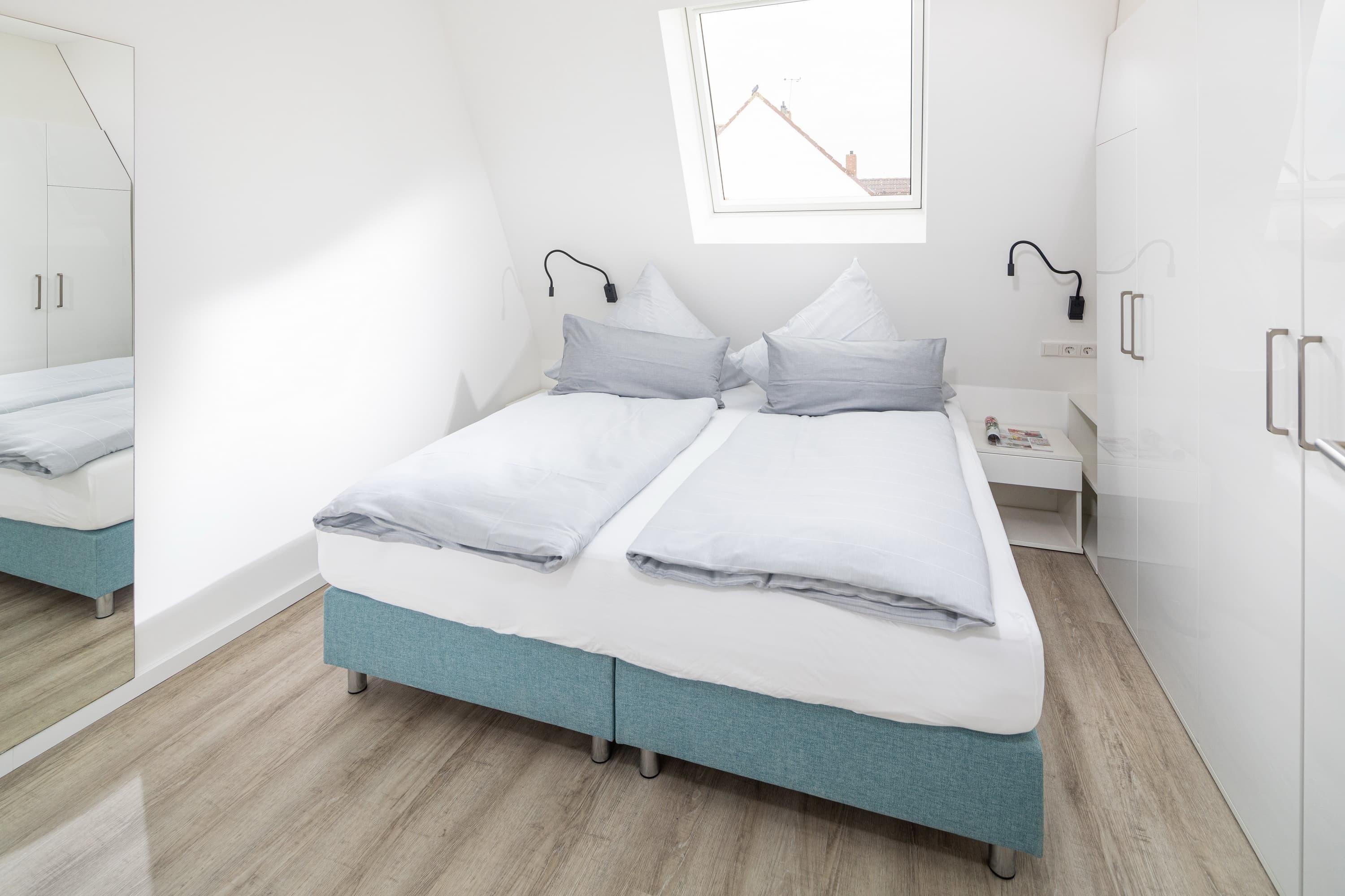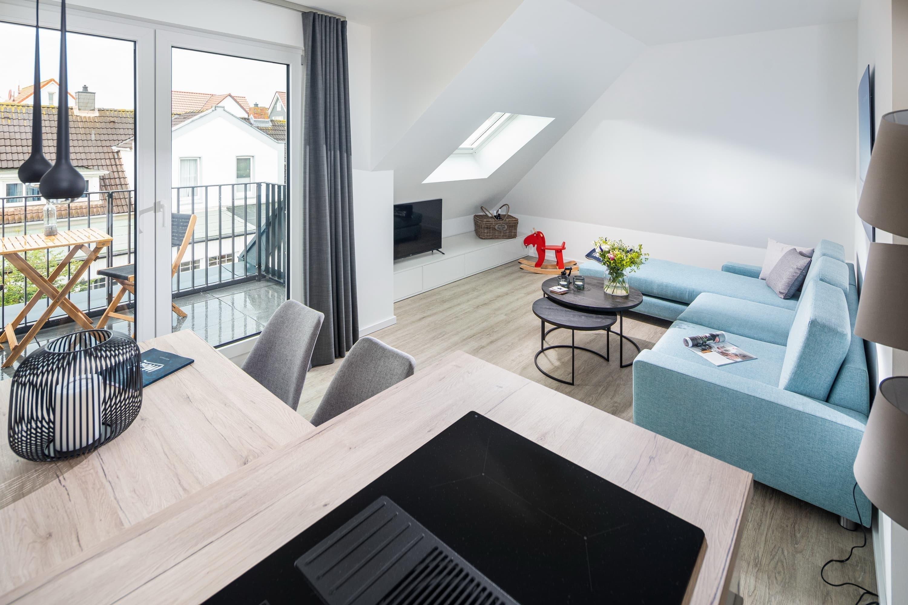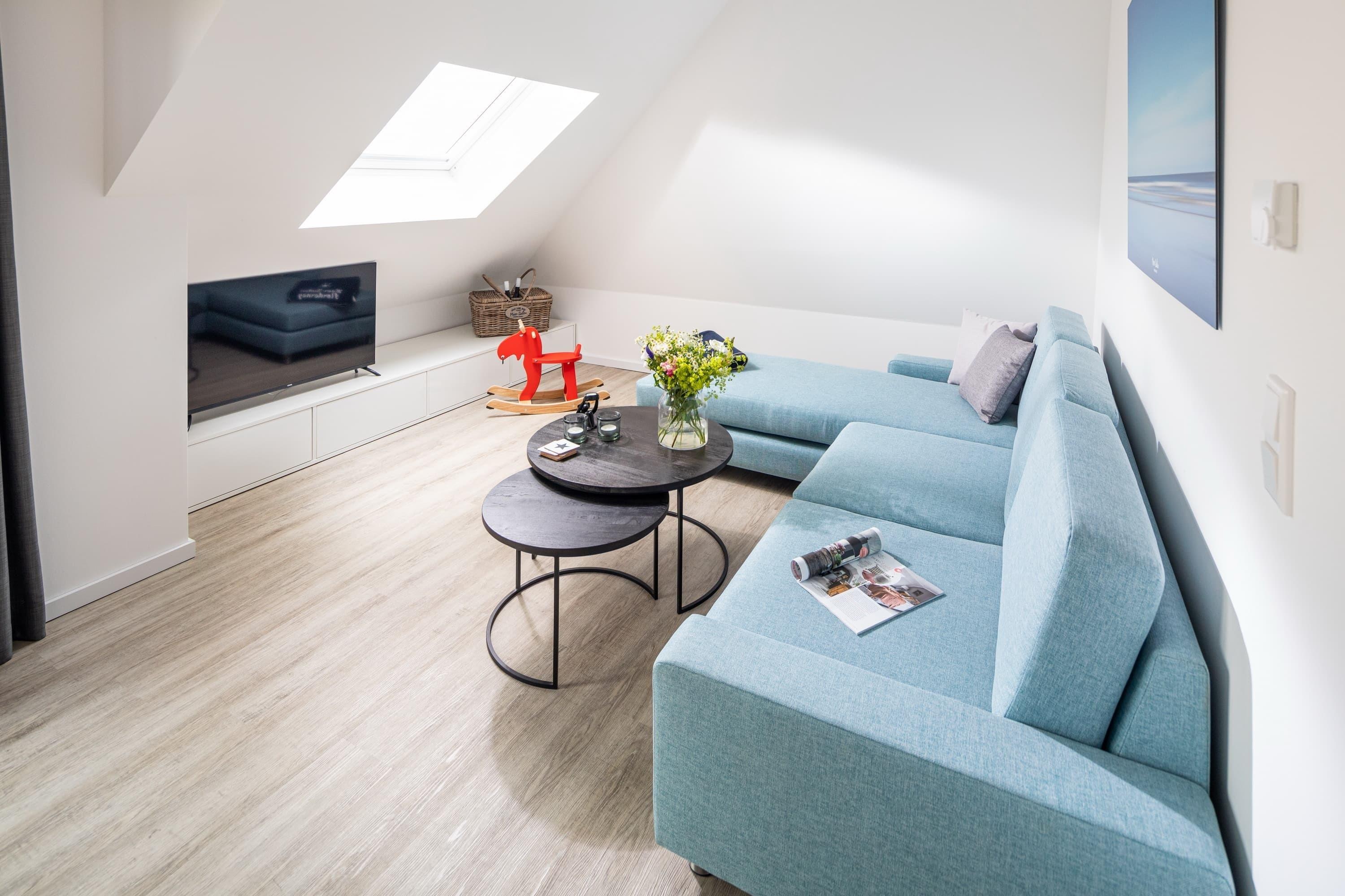 Im Haus gibt es insgesamt 7 Wohneinheiten. Die Meersuite N°7 liegt im 02. OG (Fahrstuhl) und verfügt über ein Schlafzimmer mit Boxspringbett, ein Badezimmer (ebenerdige Dusche) und einen gemütlichen Wohnraum mit Eckcouch, Esstisch, offener Küche und Zugang zum Balkon. Im Wohnraum steht Ihnen der Schlafgiebel mit zwei Einzelbetten als alternative bzw. zweite Schlafgelegenheit zur Verfügung. Hunde sind in dieser Wohnung herzlich willkommen.