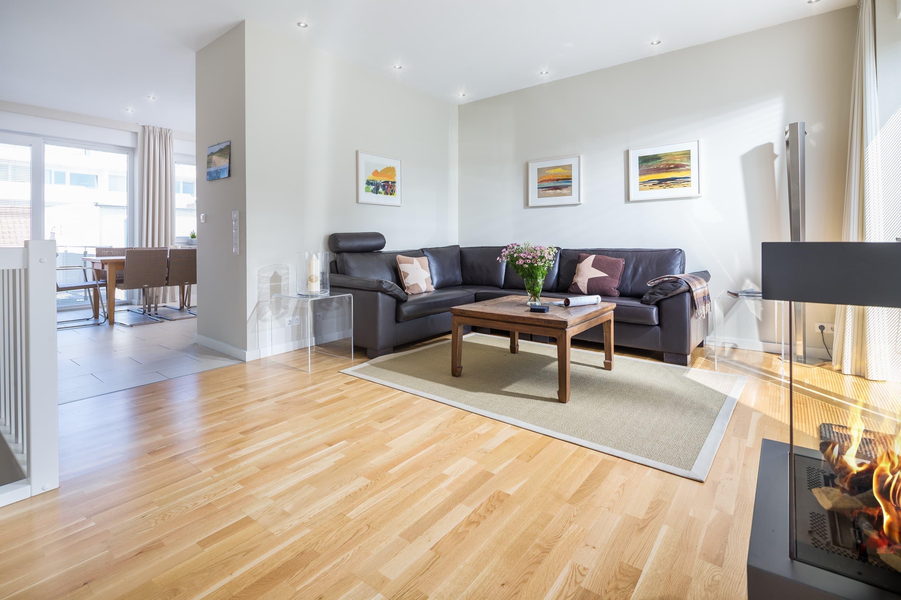 Im ersten Stockwerk kann man den Urlaub gemeinsam im großzügigen Wohn-Essbereich mit Küchenzeile und Esstisch oder im Wohnzimmer gemütlich auf dem Sofa vor dem Gaskamin verbringen. Die Sonne kann man den ganzen Tag geniessen – es gibt zwei Dachterrassen – eine nach Osten und eine nach Westen. Auf beiden gibt es Sitzmöglichkeiten und einen Sonnenschirm. [nbsp]Ein Haus mit viel Wohnkomfort, das durch seine moderne hochwertige Einrichtung und tolle Lage einen guter Ausgangspunkt für den Urlaub ist.