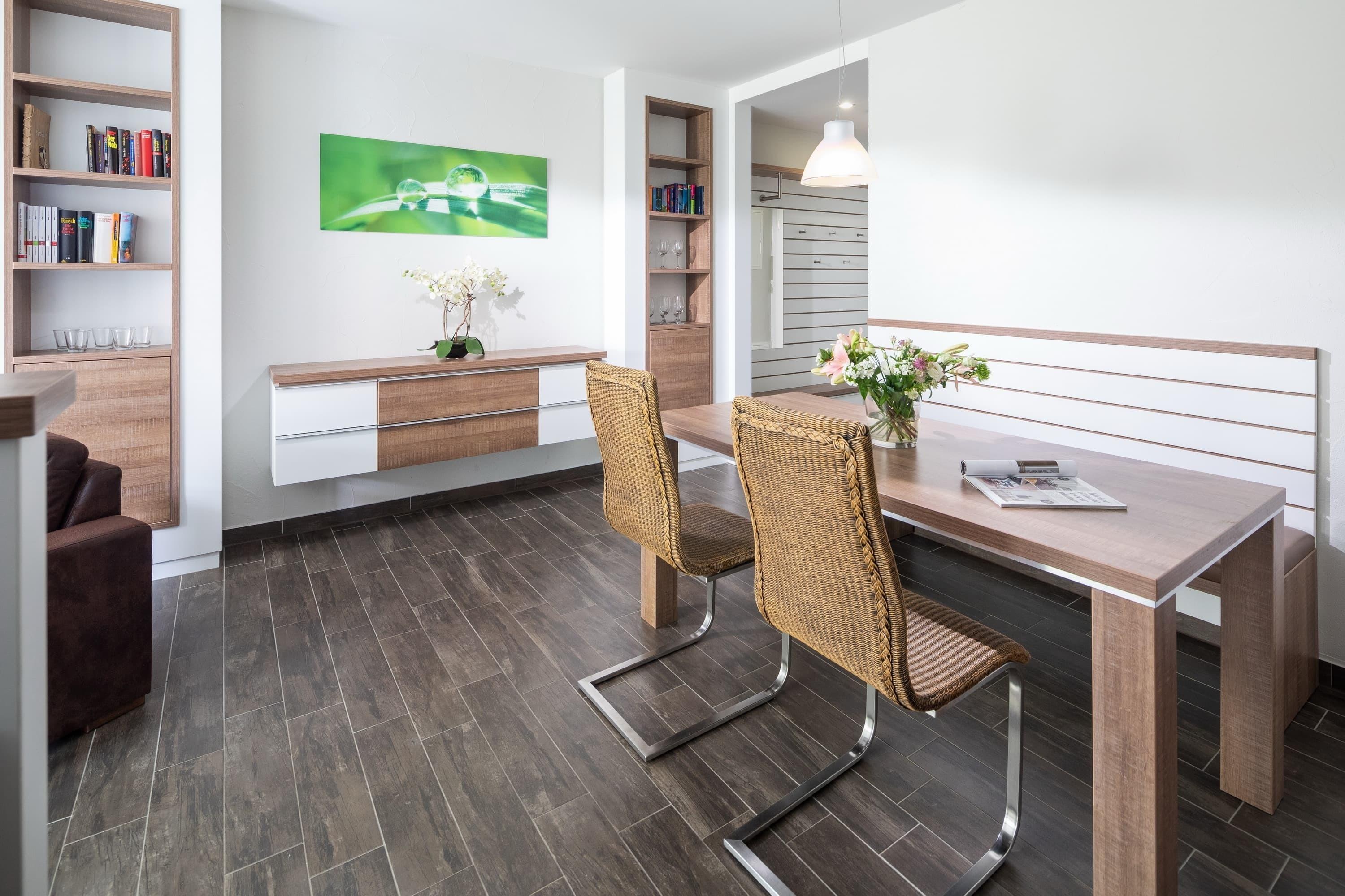 Die „Villa Rossini“ Whg. 3 befindet sich im Erdgeschoss und verfügt über einen großzügigen, modern eingerichteten Wohn-Essbereich mit 2 Flachbildschirmen, eine hochwertig eingerichtete Einbauküche (Spülmaschine, Backofen, etc.), 1 Schlafzimmer mit Doppelbett (1,80m x 2,00m) und 1 Schlafzimmer mit 2 Einzelbetten, Bad und eine Terrasse.