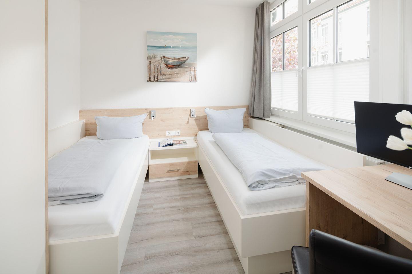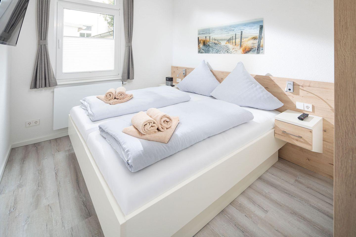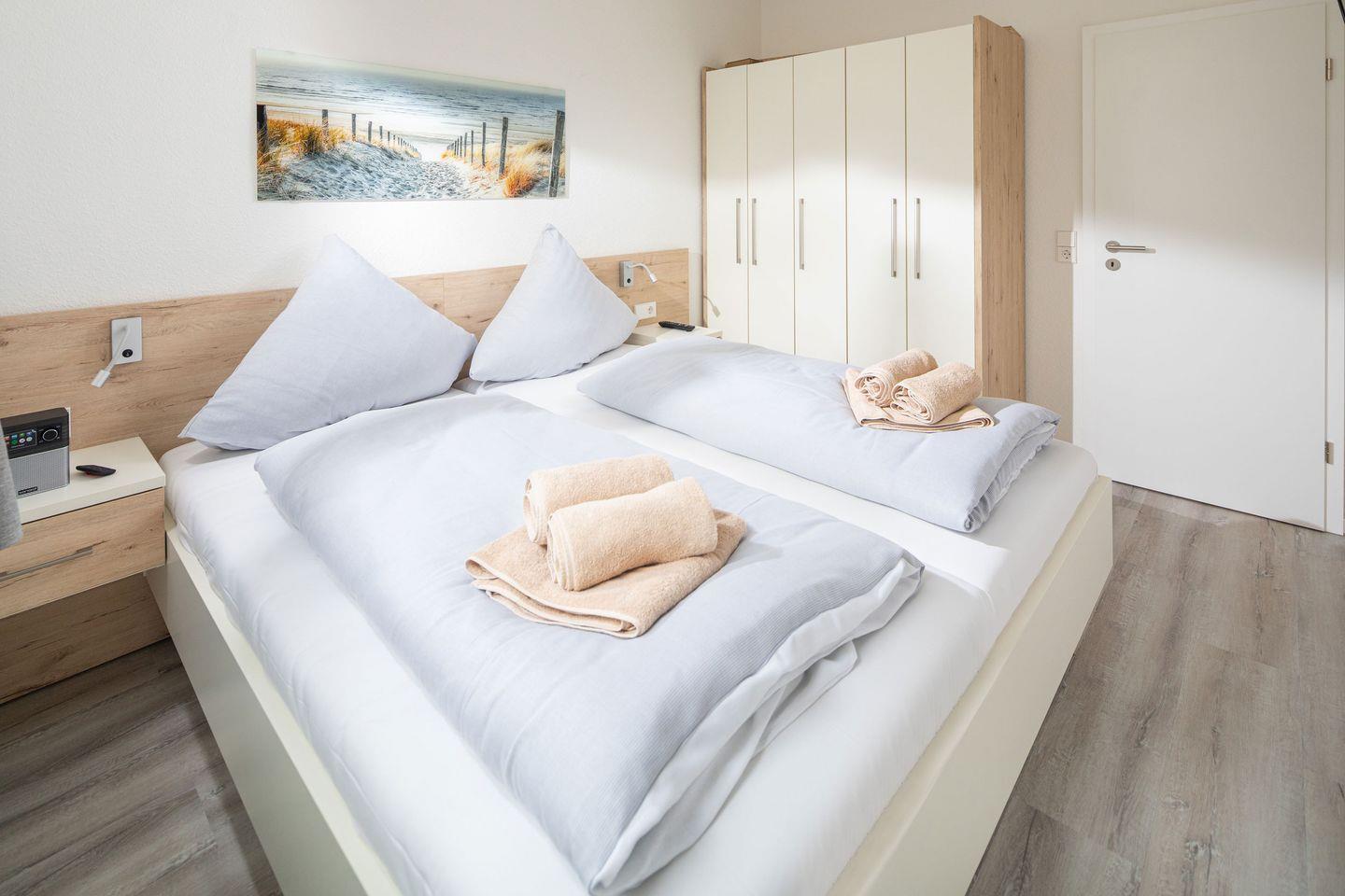 Das 1. Schlafzimmer mit Doppelbett (180*200) verfügt über ein zusätzliches TV-Gerät, das 2. Schlafzimmer über 2 Einzelbetten (2 x 90*200) sowie Schreibtisch mit Monitor.