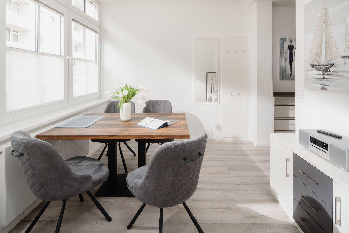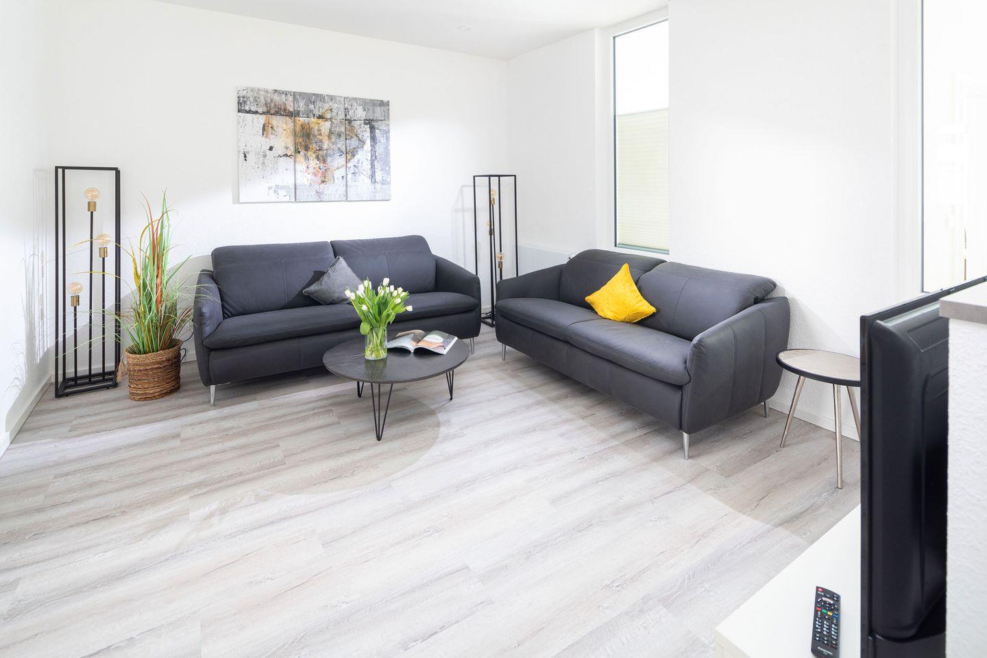 Das stilvoll gestaltete großzügige Appartement bietet einen offenen Wohnbereich mit Couch-Sitzgruppe und TV sowie einen großen Küchenbereich mit sonnigem Essplatz auf der Veranda.