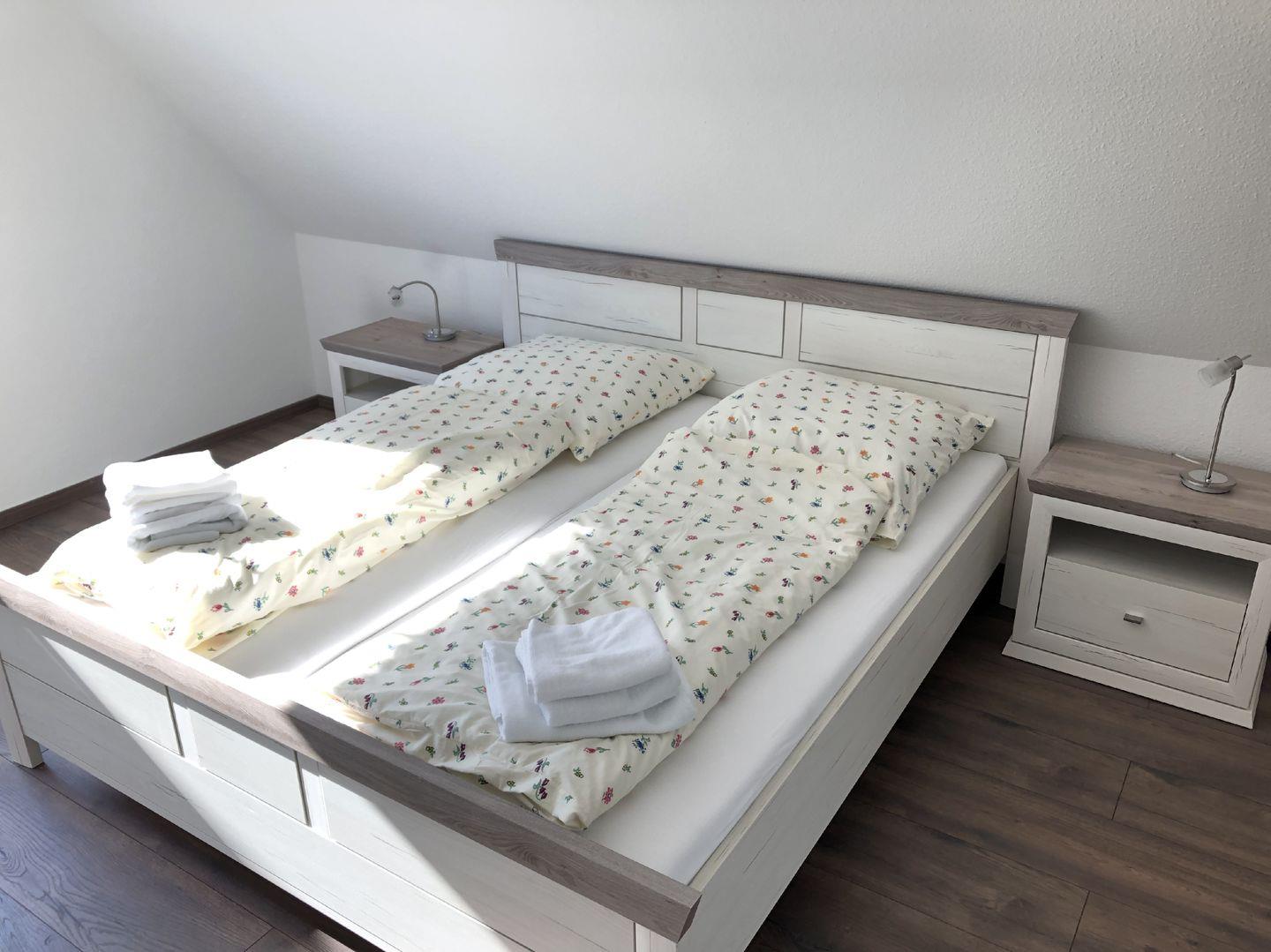 Beide Schlafzimmer verfügen über 1,80 m Doppelbetten. Im Wohnzimmer befindet sich ein ausziehbares Schlafsofa (Liegefläche ca. 1,40×2,00m). Die Ferienwohnung ist demnach für bis zu sechs Personen ausgelegt.