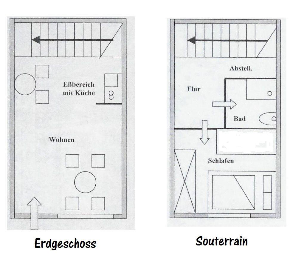 Die moderne Ferienwohnung erstreckt sich über zwei Etagen im Souterrain und Erdgeschoß. Schlafzimmer und Bad befinden sich im Souterrain, der Wohn-/Schlafraum einschließlich Einbauküche im Erdgeschoss. Neben dem Doppelbett im Schlafzimmer finden Sie im Wohn-/Schlafraum 2 Schrankbetten, sodass problemlos bis zu 4 Personen in der Ferienwohnung gastieren können.