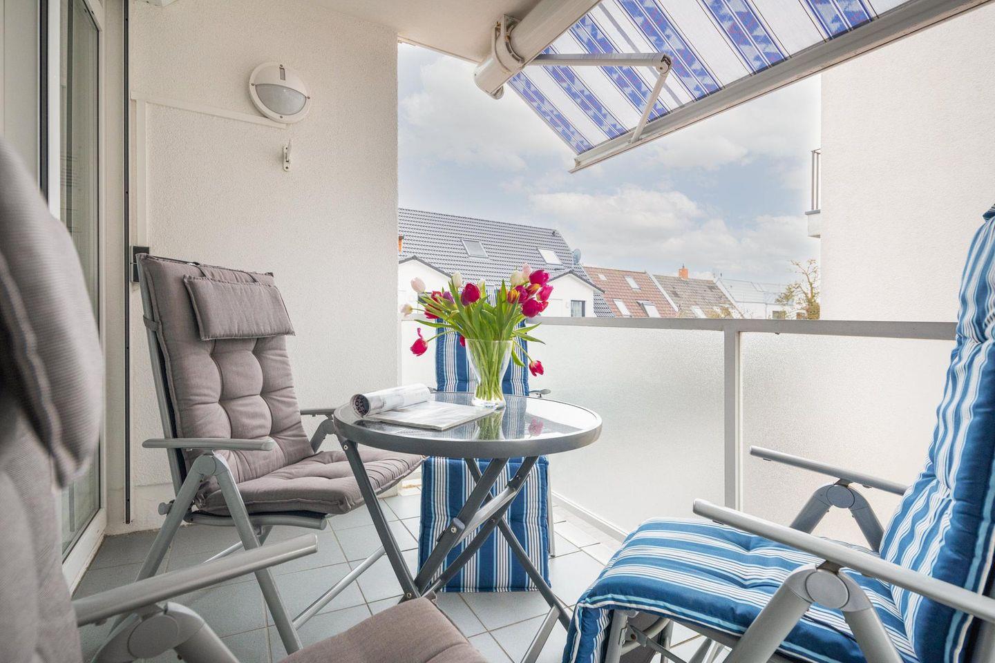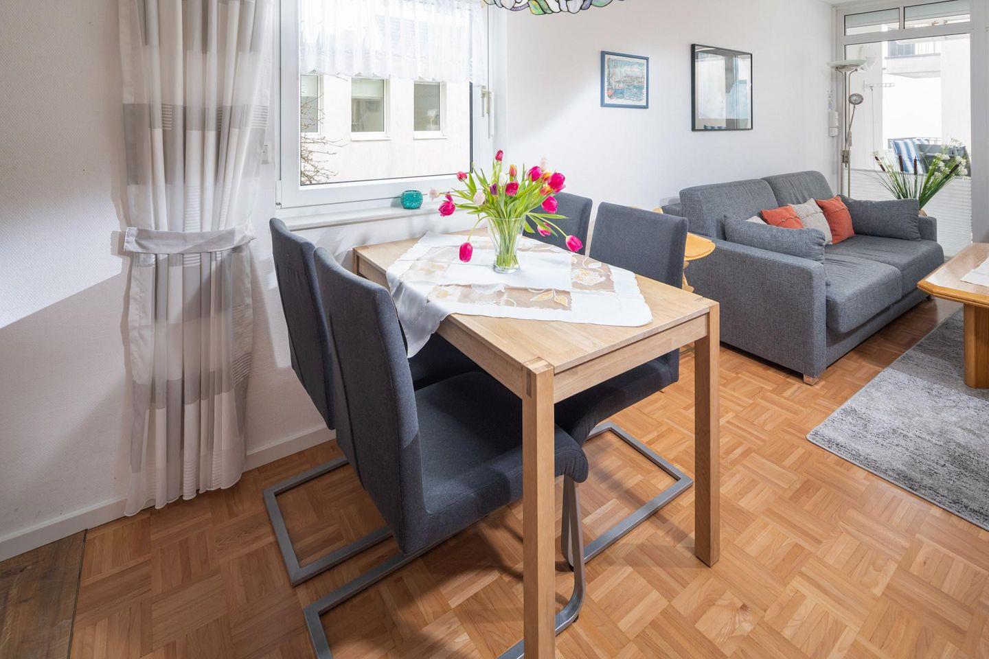 Die Inneneinrichtung der Wohnung wurde mit großer Sorgfalt ausgewählt. Ein Highlight der Wohnung ist der nach Südwesten ausgerichtete Balkon, der als geschützte Loggia gestaltet ist.