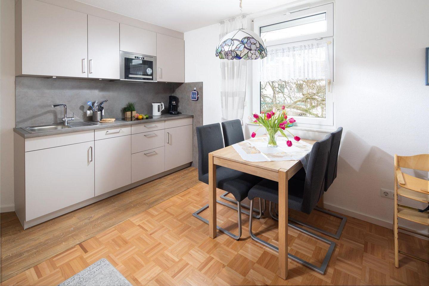 Die Küchenzeile ist optimal ausgestattet, inklusive moderner Spülmaschine und Backofen.