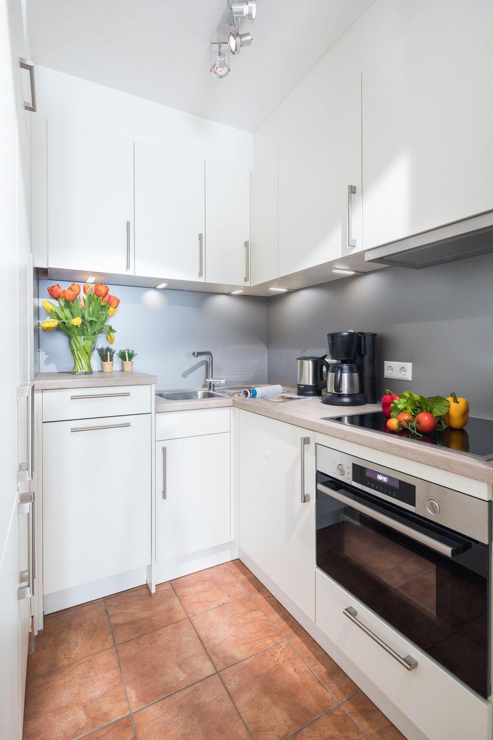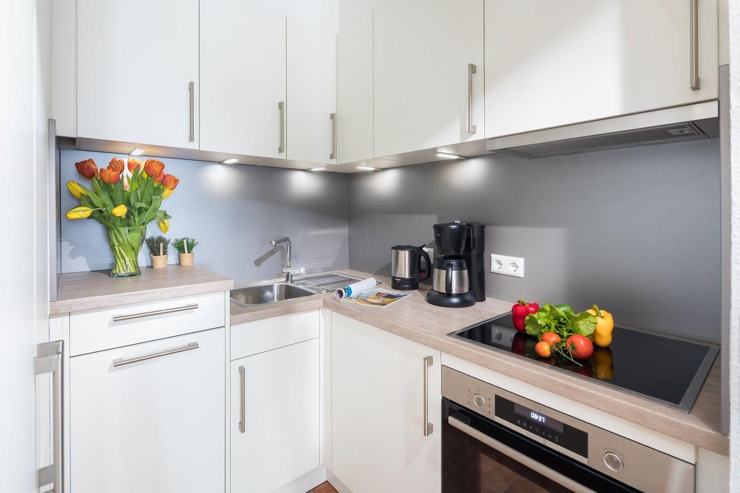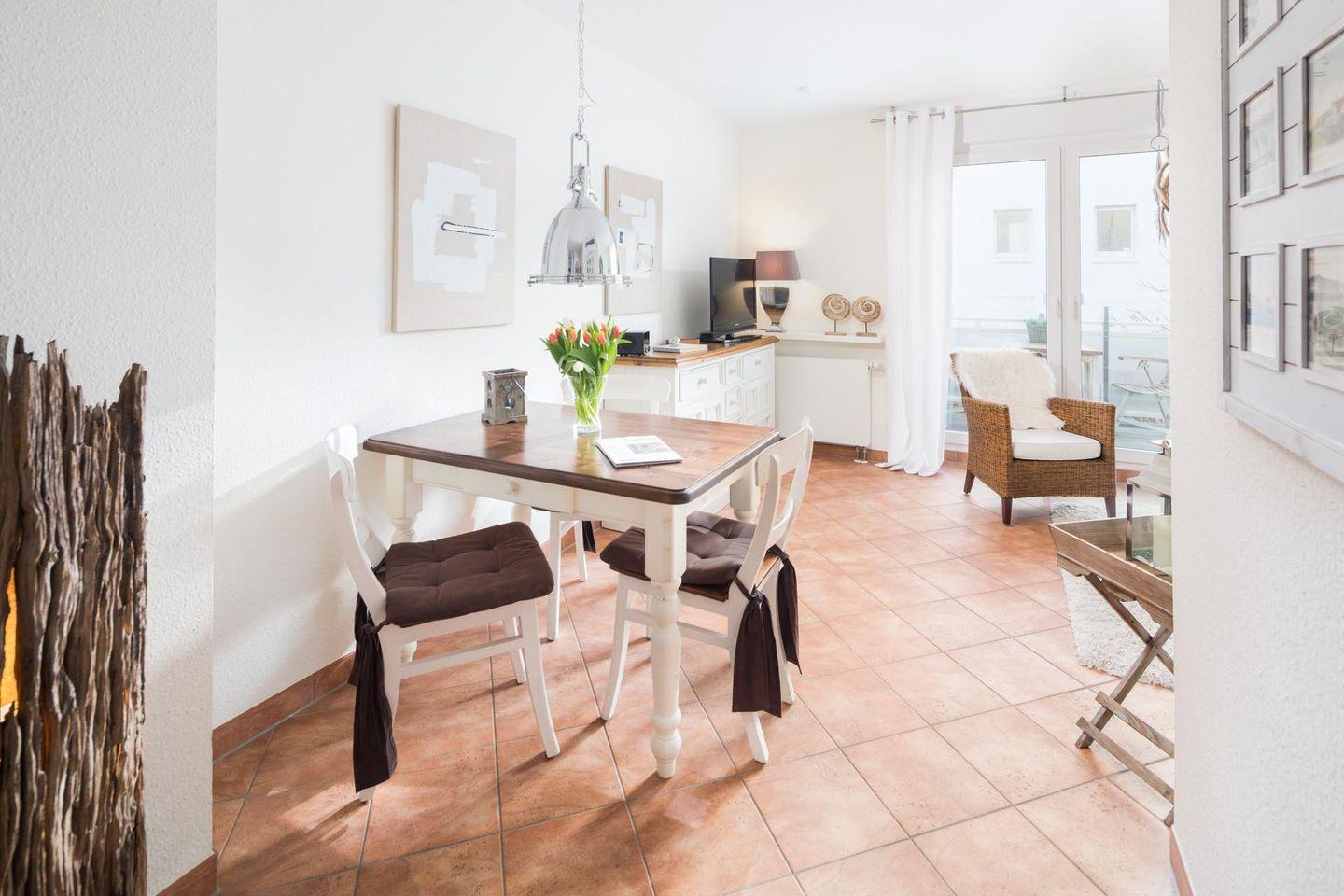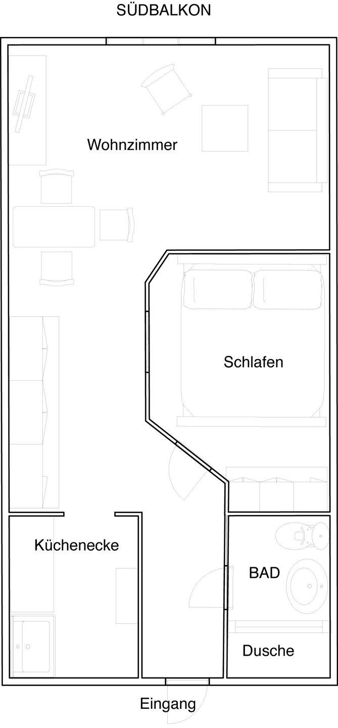 Die Wohnung verfügt über einen Raum, in dem der Schlafbereich räumlich abgetrennt ist. Eine kleine, moderne Küche ist in einer Nische untergebracht und ist sehr gut ausgestattet. Das Badezimmer ist mit einer Dusche ausgestattet. Das Highlight der Wohnung ist der Balkon. Dieser ist nach Süden ausgerichtet. Hunde sind in dieser Ferienwohnung nicht erlaubt.