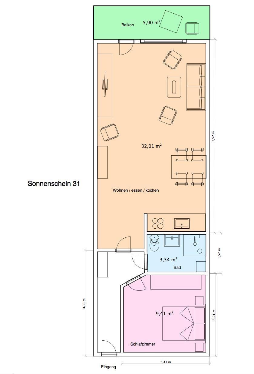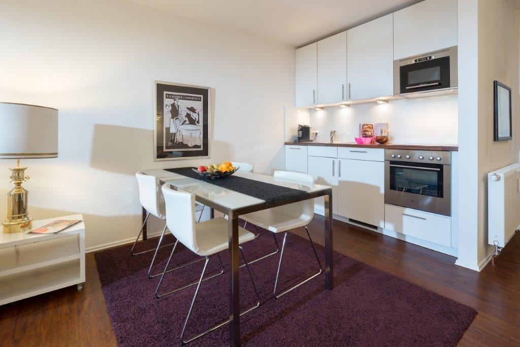Die Wohnung entspricht einem gehobenen Standard. Sie bietet einen Wohnbereich mit Essecke, einem Essbereich und einer voll eingerichteten, offenen Küche. Zudem gibt es im Wohnbereich einen DVD-Player, Internetzugang und einen Flachbildschirm-TV (Kabel) mit SKY-Bundesliga Programm. Das Schlafzimmer verfügt über ein Doppelbett. Das Badezimmer ist mit einer Dusche und einem Handtuchtrockner ausgestattet. Der Südbalkon ist mit einer Markise ausgestattet. Hunde sind in dieser Ferienwohnung nicht gestattet.