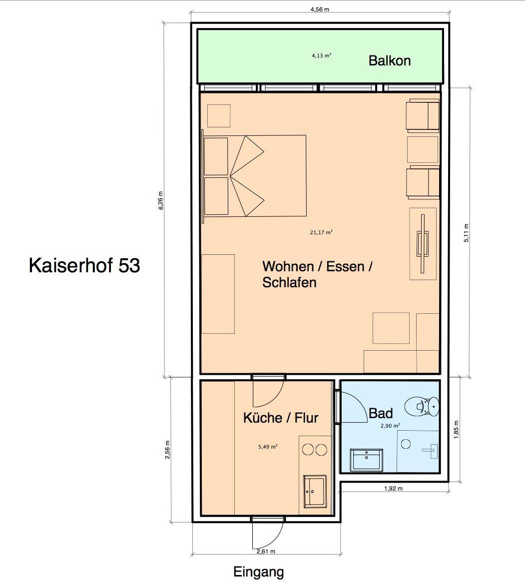 Die Wohnung 53 wurde im Herbst 2019 mit einem neuen, glatten Boden in Holzoptik ausgestattet. Im Wohn-Schlafbereich befindet sich ein Doppelbett. Der Vorraum, der auch als Flur und Küche dient, wurde mit einer vollwertigen Einbauküche ausgestattet. Das Badezimmer der Wohnung ist mit einer Dusche, einem WC und einem Handwaschbecken ausgestattet. Weiter verfügt die Wohnung über einen Balkon. Im Apartmenthaus "Kaiserhof" stehen den Bewohnern eine Waschmaschine und ein Wäschetrockner (beide mit Münzeinwurf) zur Verfügung. Zusätzlich steht eine Sauna bereit, die ebenfalls gegen Münzeinwurf nutzbar ist. Es ist zu beachten, dass das Schwimmbad aufgrund eines technischen Defektes geschlossen ist. Fahrräder können vor dem Haus (Nordseite) oder im Fahrradraum abgestellt werden. Hunde sind in dieser Wohnung nicht erlaubt.