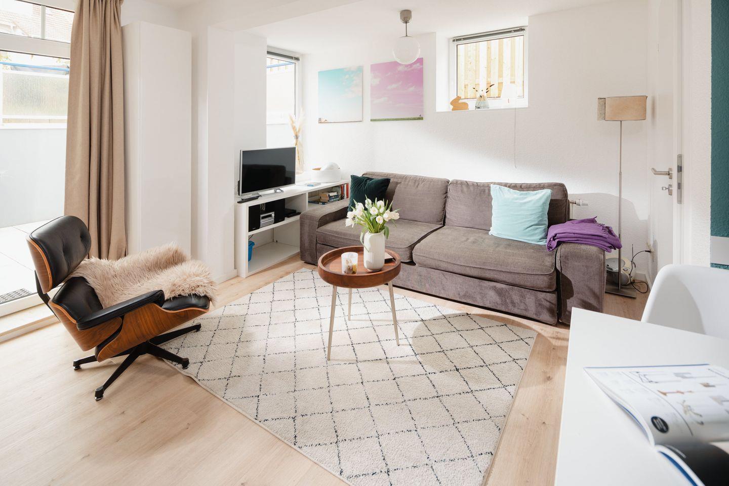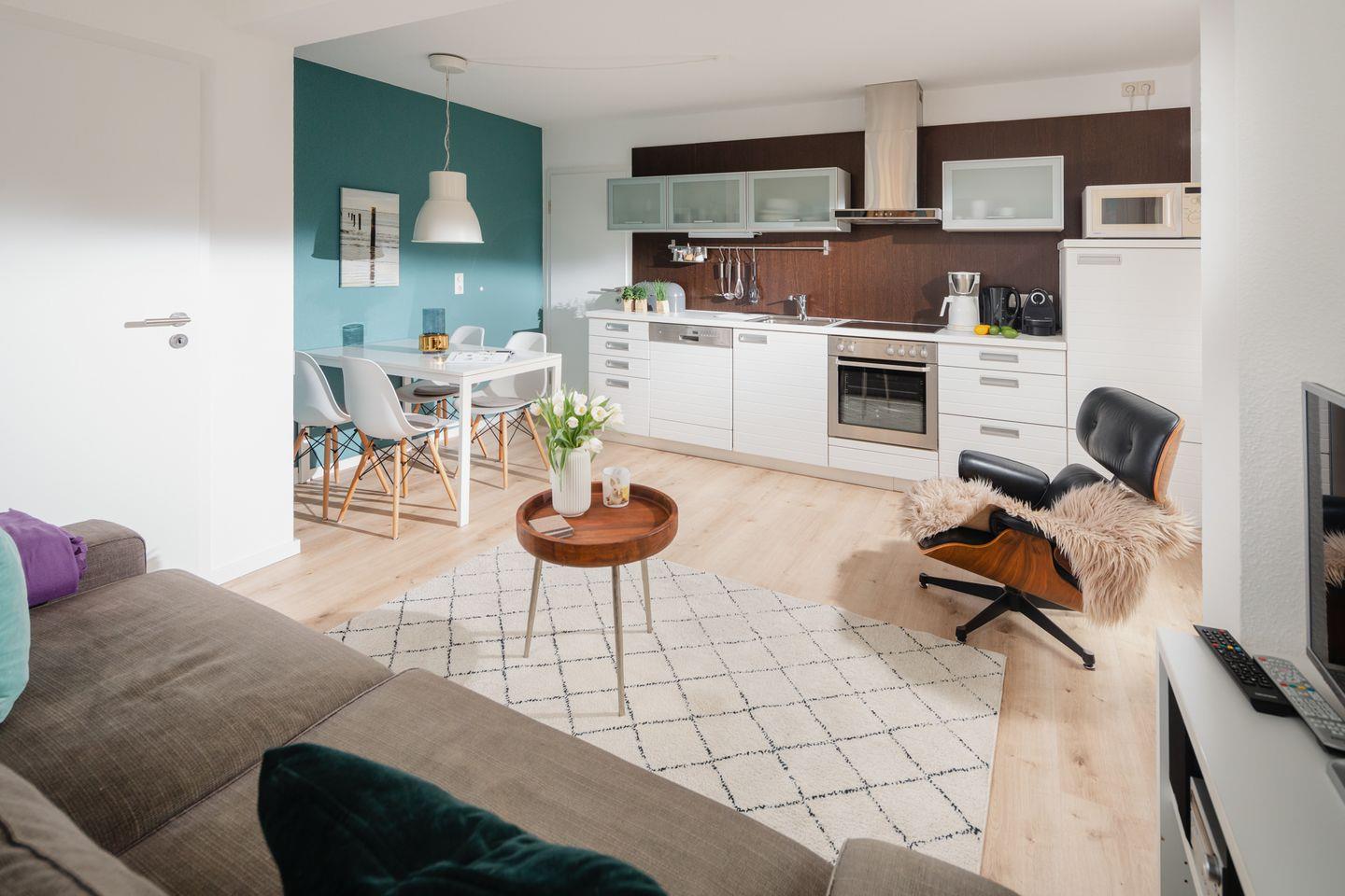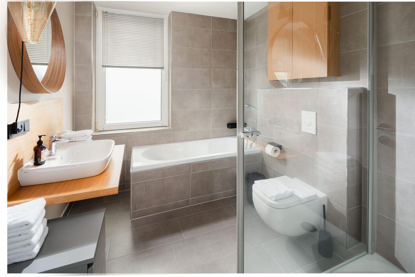 Die Wohnung "Windrose 1b" ist zwar kompakt, dafür jedoch gemütlich gestaltet. Sie liegt sehr ruhig zur straßenabgewandten Seite im Tiefparterre des Hauses. Durch das niedrigere Erdniveau auf dieser Seite ist die Wohnung ebenerdig und lichtdurchflutet. Bei der Wandgestaltung wurde Wert auf warme Farben gelegt. Sie verfügt über ein Wohnzimmer mit Küchenzeile und TV, ein Schlafzimmer mit Doppelbett sowie ein sehr kleines Kinderschlafzimmer mit Etagenbett und TV. Vom Wohnzimmer aus gelangt man auf die 22 Quadratmeter große Terrasse, die mit massiven Terrassenmöbeln ausgestattet ist. Das Badezimmer besticht durch hochwertige Schreinerarbeiten. Fahrräder können im Ständer am Haus oder im Keller abgestellt werden. Waschmaschine und Wäschetrockner befinden sich im Haus und stehen (für die gemeinschaftliche Nutzung gegen Münzeinwurf) zur Verfügung, was besonders für längere Aufenthalte von Vorteil ist. Haustiere (Hunde) sind in dieser Ferienwohnung nicht erlaubt.