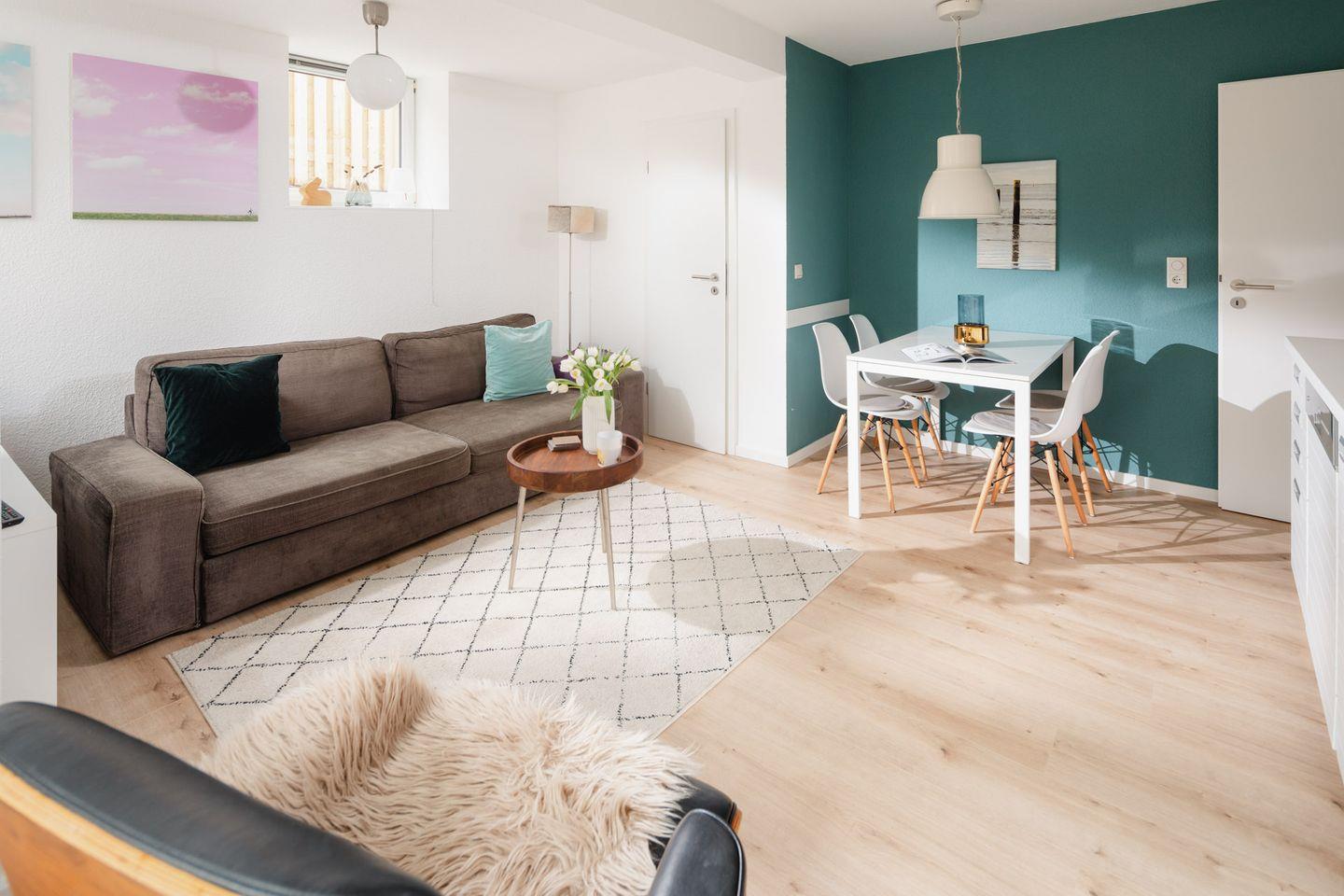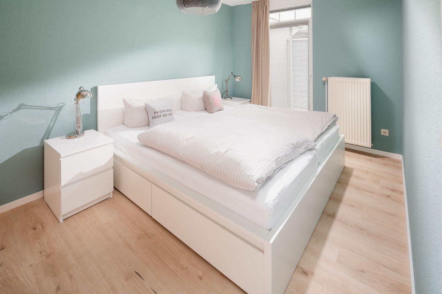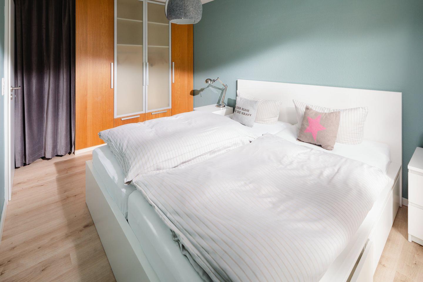 Die Wohnung "Windrose 1b" ist zwar kompakt, dafür jedoch gemütlich gestaltet. Sie liegt sehr ruhig zur straßenabgewandten Seite im Tiefparterre des Hauses. Durch das niedrigere Erdniveau auf dieser Seite ist die Wohnung ebenerdig und lichtdurchflutet. Bei der Wandgestaltung wurde Wert auf warme Farben gelegt. Sie verfügt über ein Wohnzimmer mit Küchenzeile und TV, ein Schlafzimmer mit Doppelbett sowie ein sehr kleines Kinderschlafzimmer mit Etagenbett und TV. Vom Wohnzimmer aus gelangt man auf die 22 Quadratmeter große Terrasse, die mit massiven Terrassenmöbeln ausgestattet ist. Das Badezimmer besticht durch hochwertige Schreinerarbeiten. Fahrräder können im Ständer am Haus oder im Keller abgestellt werden. Waschmaschine und Wäschetrockner befinden sich im Haus und stehen (für die gemeinschaftliche Nutzung gegen Münzeinwurf) zur Verfügung, was besonders für längere Aufenthalte von Vorteil ist. Haustiere (Hunde) sind in dieser Ferienwohnung nicht erlaubt.