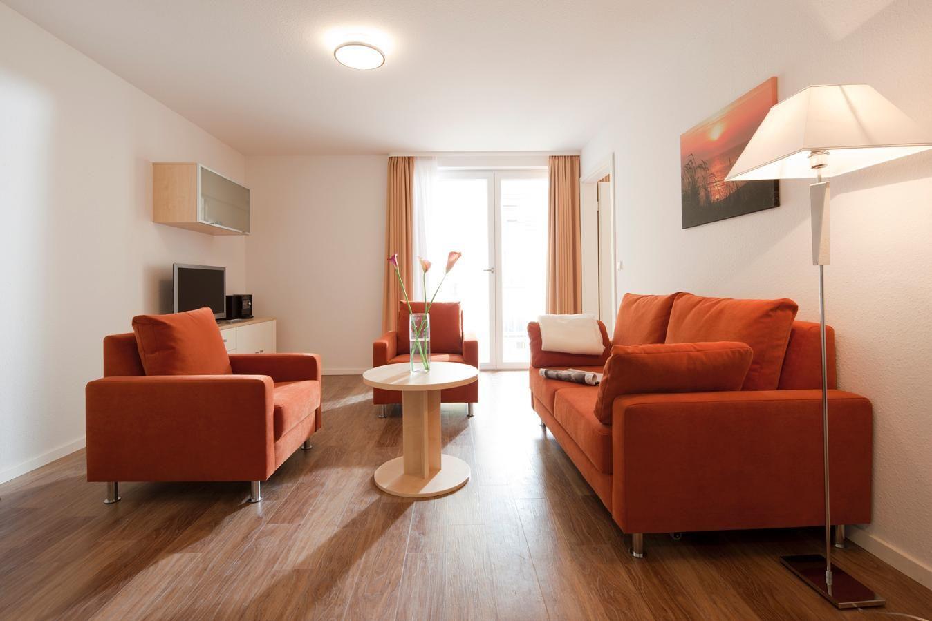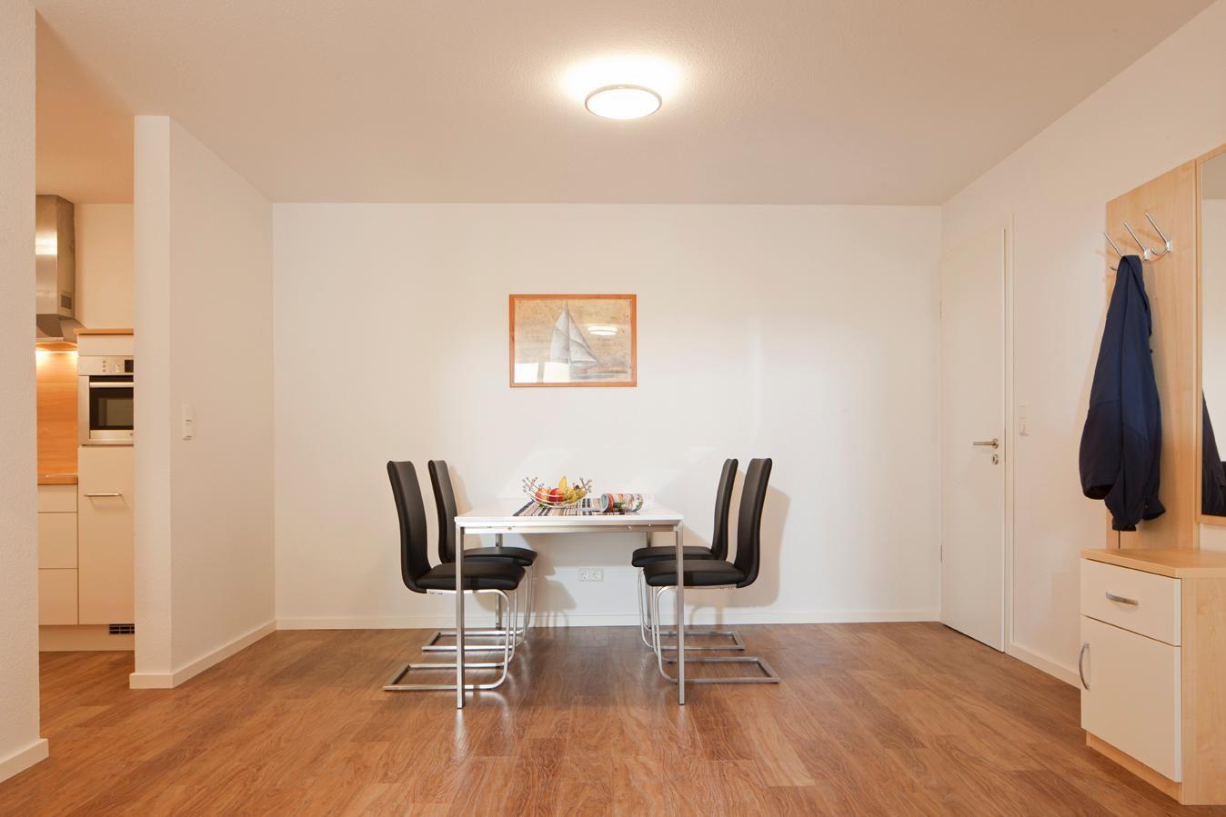 Die Wohnung bietet ein Wohnzimmer, ein Schlafzimmer mit Doppelbett, ein Schlafzimmer mit 2 Einzelbetten, eine offene Küche mit einem Esstisch und ein Badezimmer mit Dusche, Handtuchtrockner und Fußbodenheizung. Weiter sind zwei TV-Geräte vorhanden. Eine Waschmaschine und ein Wäschetrockner sind gegen Gebühr im Gemeinschaftskeller nutzbar. Fahrräder können vor dem Haus abgestellt werden. Bis zum Strand sind es nur etwa 700m, dadurch ist dieser in wenigen Gehminuten zu erreichen. Hunde sind in dieser Wohnung nicht erlaubt. Restaurants, Cafés und andere Einkaufsmöglichkeiten sind fußläufig in wenigen Gehminuten erreichbar.