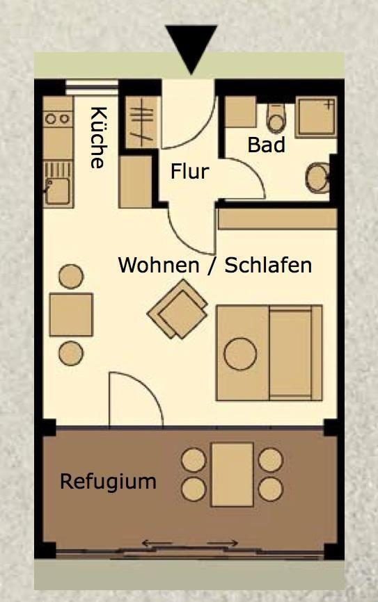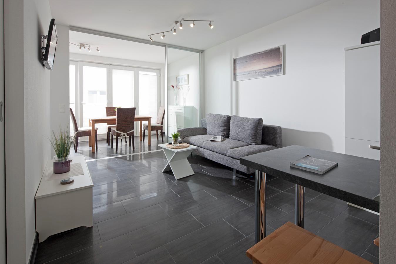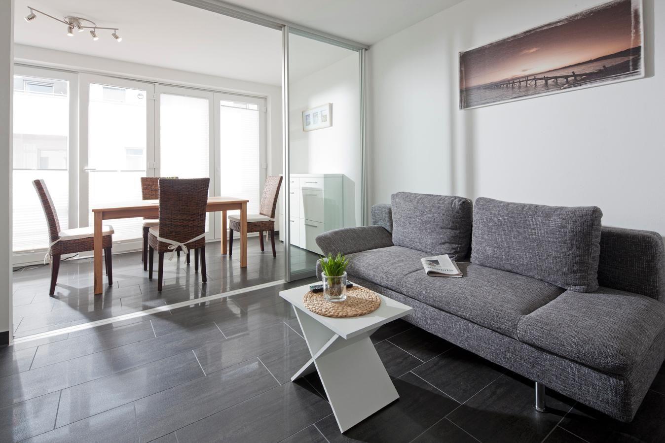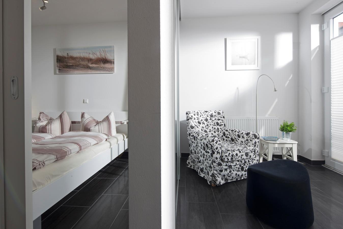 Bei der Gestaltung der Wohnung wurde Wert auf eine helle, freundliche und moderne Einrichtung gelegt. Das Wohnzimmer verfügt über eine angeschlossene Veranda, das "Refugium", dessen Verglasung sich je nach Wetter zur Straße hin öffnen lässt. Das Schlafzimmer ist mit einem Doppelbett mit einer Länge von 1,90m ausgestattet. Waschmaschine und Wäschetrockner befinden sich im Haus und stehen (für die gemeinschaftliche Nutzung gegen Münzeinwurf) zur Verfügung, was besonders für längere Aufenthalte von Vorteil ist. Hier darf auch der vierbeinige Freund mitkommen, denn die Ferienwohnung heißt auch Hunde herzlich willkommen. Erlaubt ist maximal 1 Hund (Höhe maximal kniehoch). Die Hundewiese befindet sich in der Nähe des Fährhafens (kein Leinenzwang).