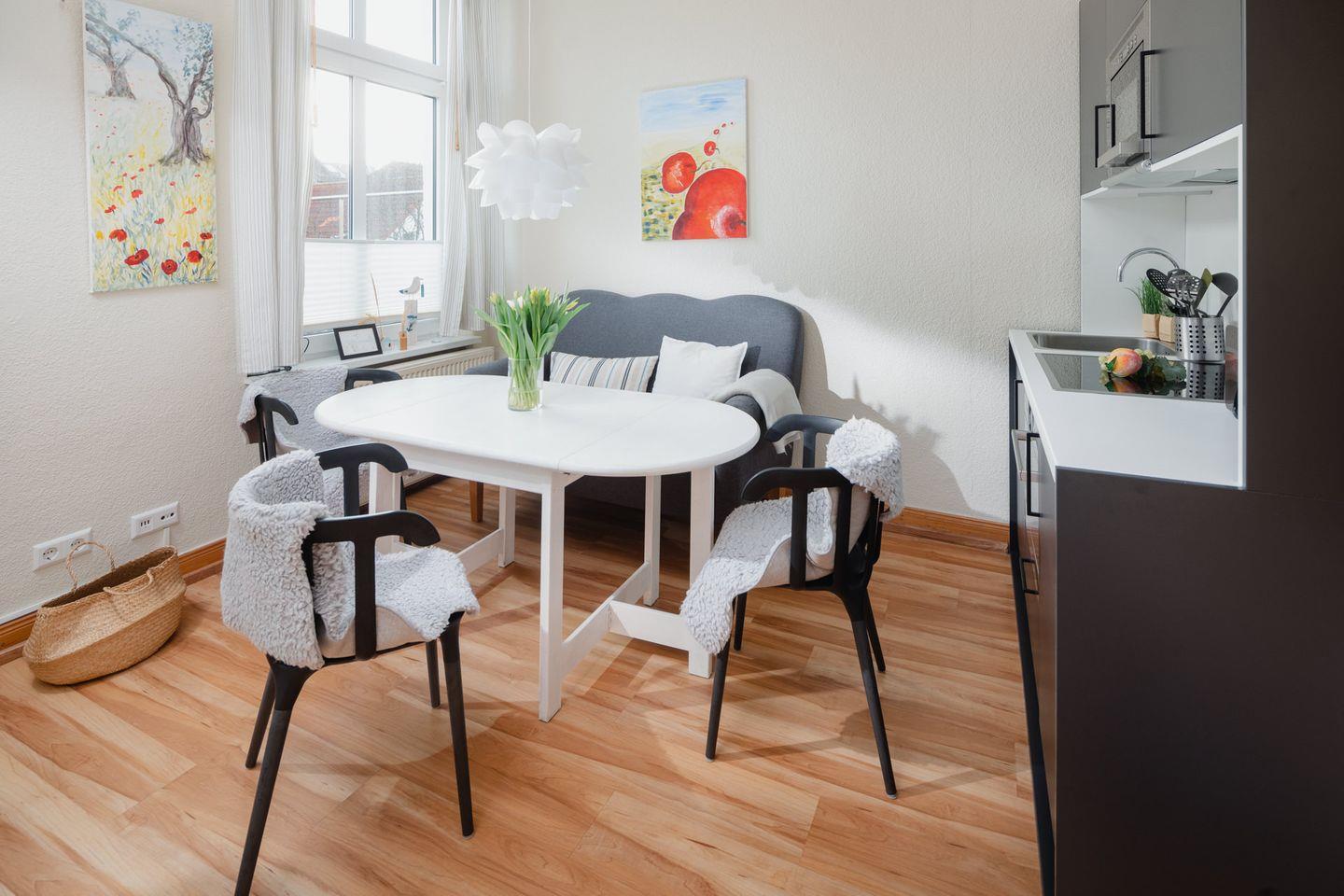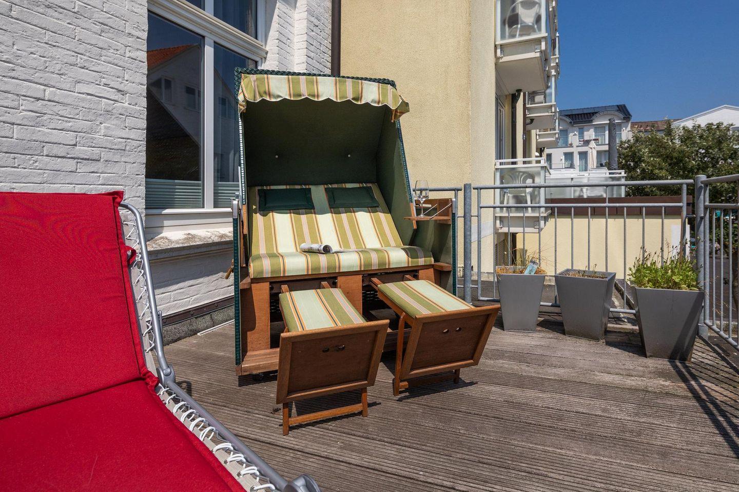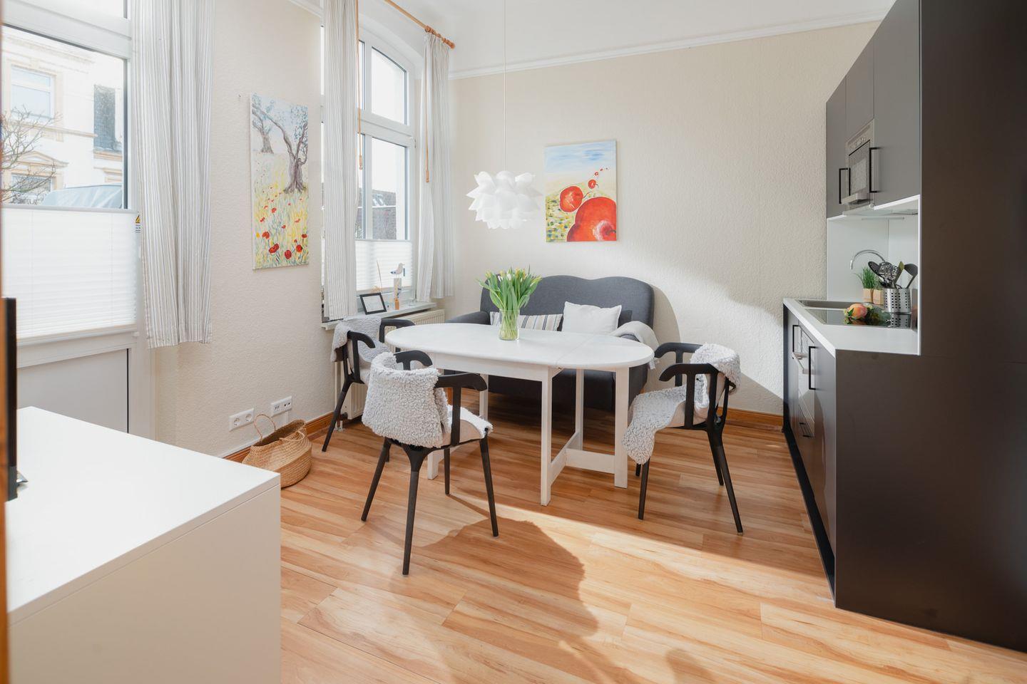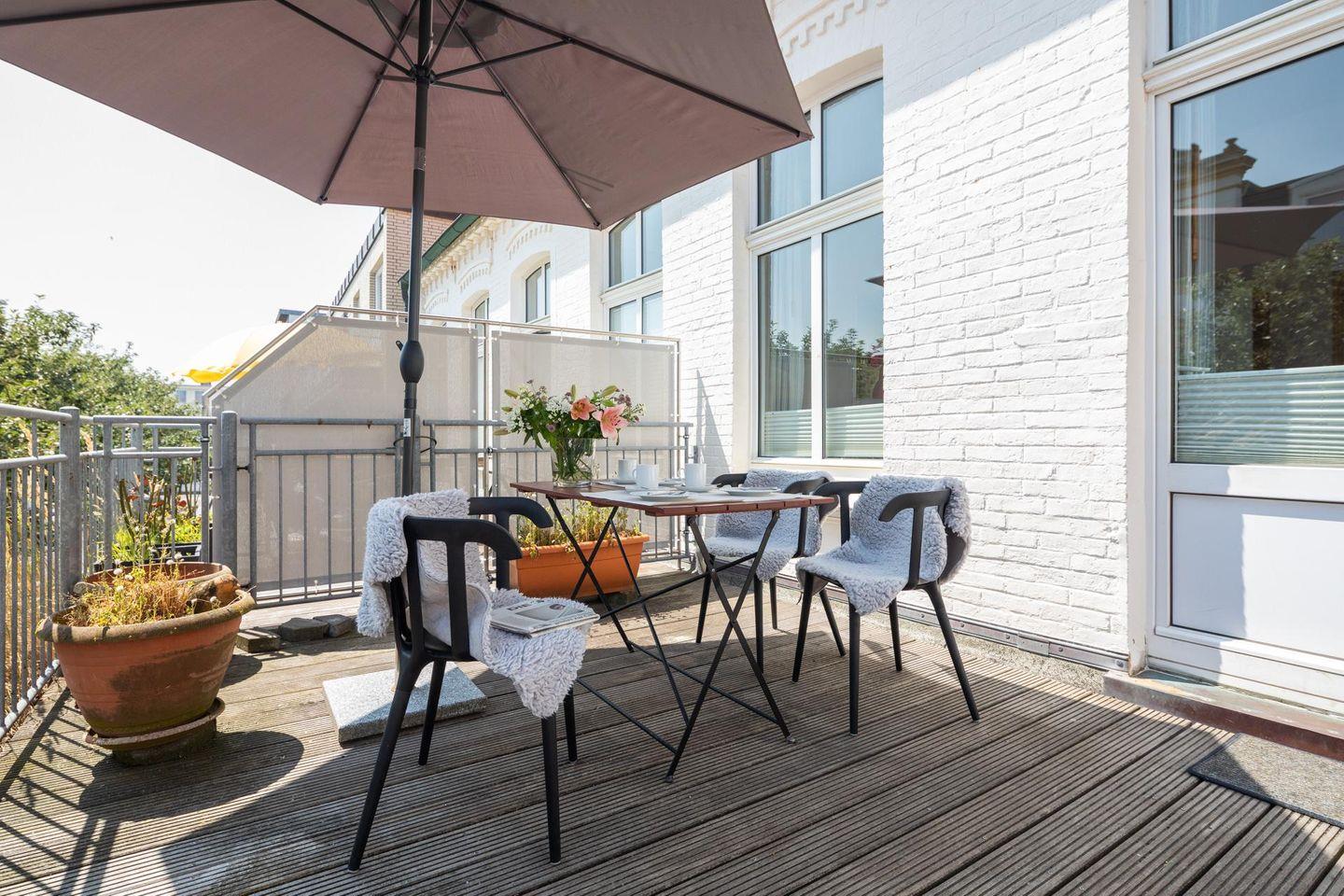 Die Wohnung wurde 2022 komplett renoviert. Das Schlafzimmer ist mit einem neuen Bett und offenem Kleiderschrank ausgestattet, während die neue Wohnküche über eine Küchenzeile mit Essbereich verfügt. Ein modernes Badezimmer rundet das Raumangebot ab. Das Highlight der Wohnung ist zweifellos die großzügige Südterrasse mit ihren 24 qm (inklusive Strandkorb). Es wird um Beachtung gebeten, dass bei einer Belegung mit drei Personen das Schlafsofa für die dritte Person im Schlafzimmer steht und die Liegefläche auf dem Boden liegt. Waschmaschine und Wäschetrockner befinden sich im Haus und stehen (für die gemeinschaftliche Nutzung ggfs. gegen Gebühr) zur Verfügung, was besonders für längere Aufenthalte von Vorteil ist. Haustiere (Hunde) sind in dieser Ferienwohnung nicht erlaubt.