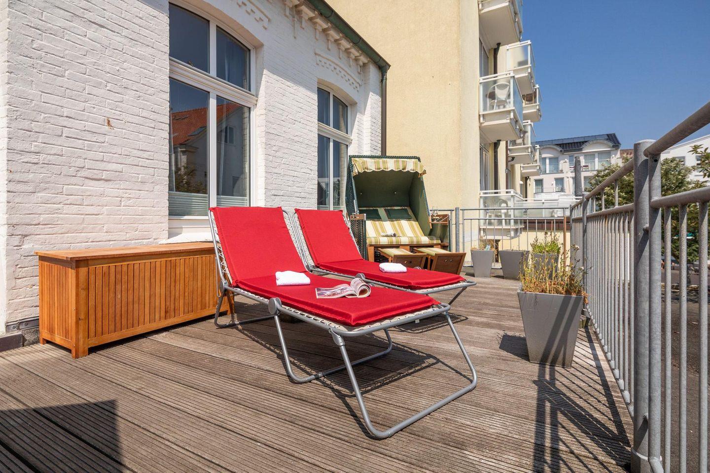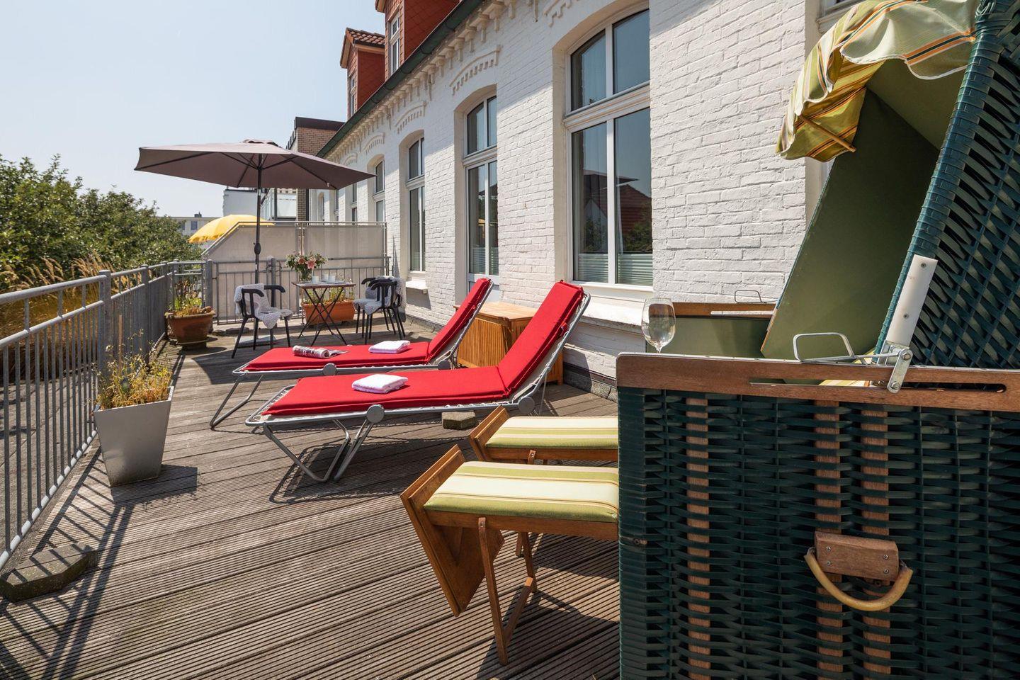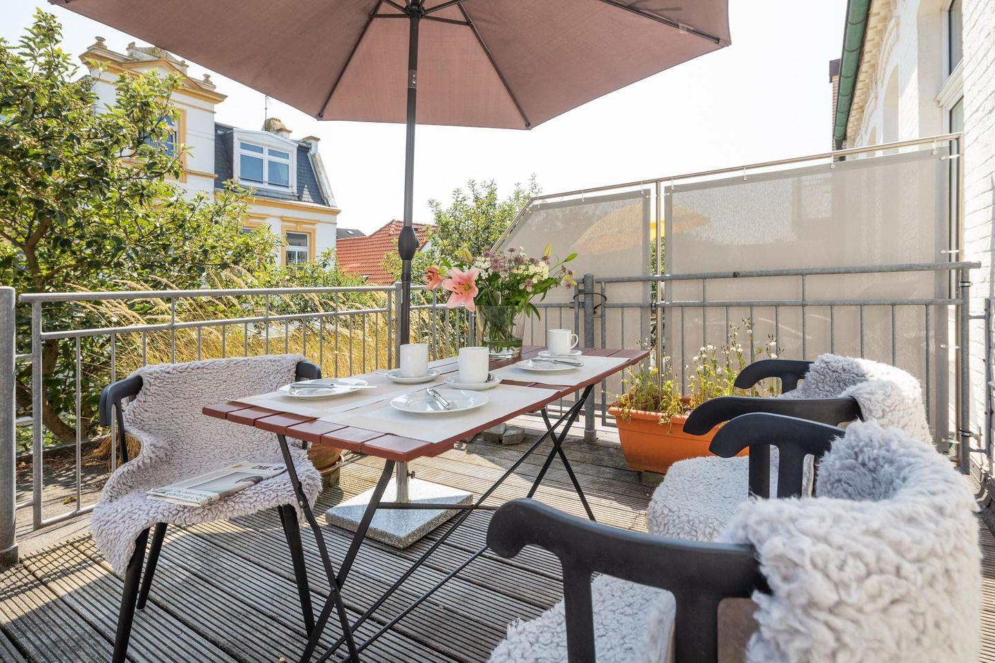 Die Wohnung wurde 2022 komplett renoviert. Das Schlafzimmer ist mit einem neuen Bett und offenem Kleiderschrank ausgestattet, während die neue Wohnküche über eine Küchenzeile mit Essbereich verfügt. Ein modernes Badezimmer rundet das Raumangebot ab. Das Highlight der Wohnung ist zweifellos die großzügige Südterrasse mit ihren 24 qm (inklusive Strandkorb). Es wird um Beachtung gebeten, dass bei einer Belegung mit drei Personen das Schlafsofa für die dritte Person im Schlafzimmer steht und die Liegefläche auf dem Boden liegt. Waschmaschine und Wäschetrockner befinden sich im Haus und stehen (für die gemeinschaftliche Nutzung ggfs. gegen Gebühr) zur Verfügung, was besonders für längere Aufenthalte von Vorteil ist. Haustiere (Hunde) sind in dieser Ferienwohnung nicht erlaubt.