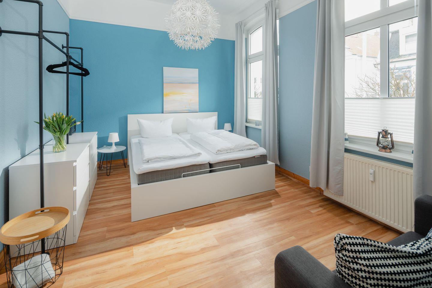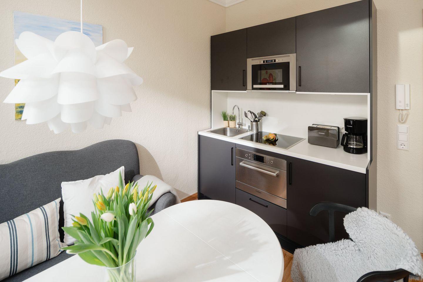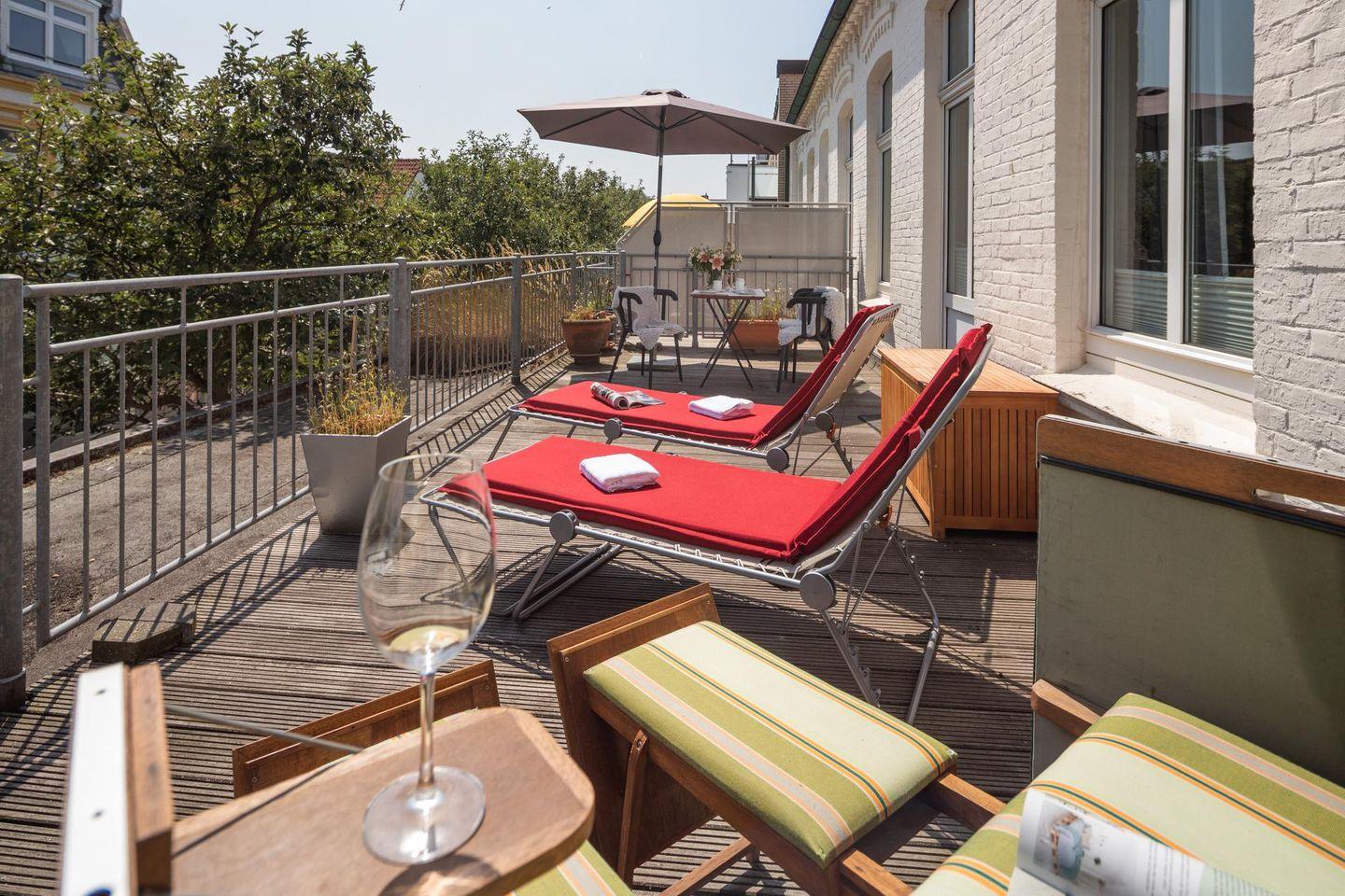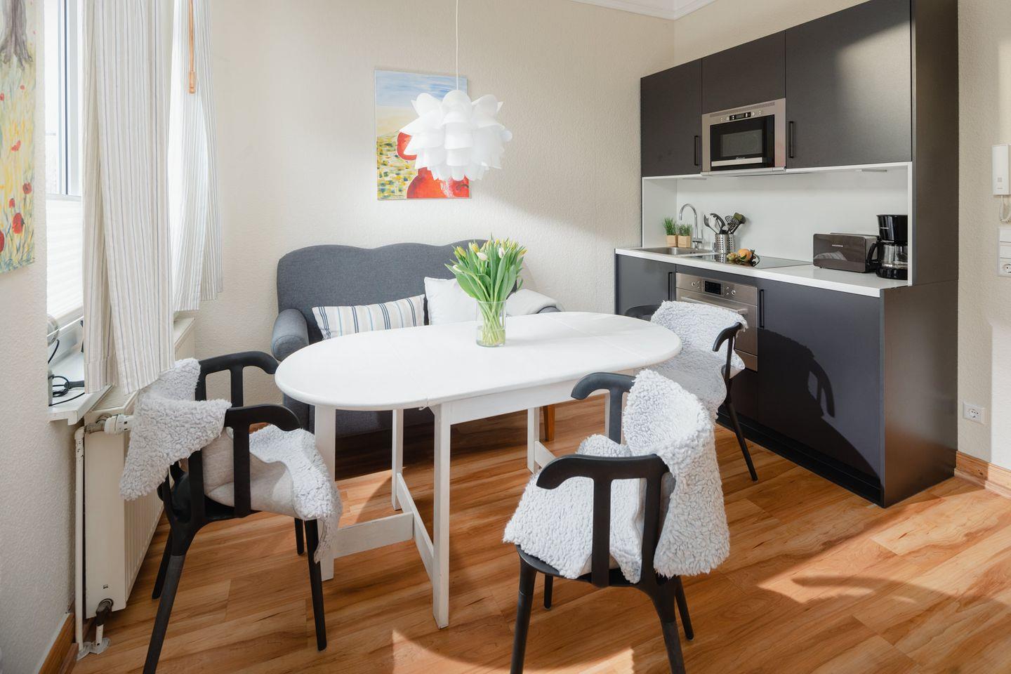Die Wohnung wurde 2022 komplett renoviert. Das Schlafzimmer ist mit einem neuen Bett und offenem Kleiderschrank ausgestattet, während die neue Wohnküche über eine Küchenzeile mit Essbereich verfügt. Ein modernes Badezimmer rundet das Raumangebot ab. Das Highlight der Wohnung ist zweifellos die großzügige Südterrasse mit ihren 24 qm (inklusive Strandkorb). Es wird um Beachtung gebeten, dass bei einer Belegung mit drei Personen das Schlafsofa für die dritte Person im Schlafzimmer steht und die Liegefläche auf dem Boden liegt. Waschmaschine und Wäschetrockner befinden sich im Haus und stehen (für die gemeinschaftliche Nutzung ggfs. gegen Gebühr) zur Verfügung, was besonders für längere Aufenthalte von Vorteil ist. Haustiere (Hunde) sind in dieser Ferienwohnung nicht erlaubt.