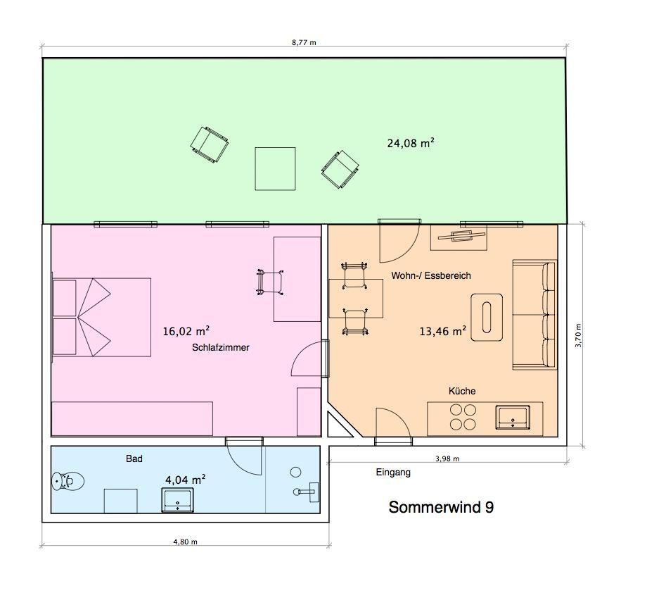 Die Wohnung bietet auf ca. 34qm Platz für bis zu 3 Personen. Die Ferienwohnung Sommerwind 9 ist ideal für zwei Erwachsene oder eine kleine Familie mit einem Kind geeignet. Der Strand ist nur ca. 190m entfernt. Einige Restaurants, Cafés und andere Einkaufsmöglichkeiten sind in wenigen Gehminuten erreichbar.