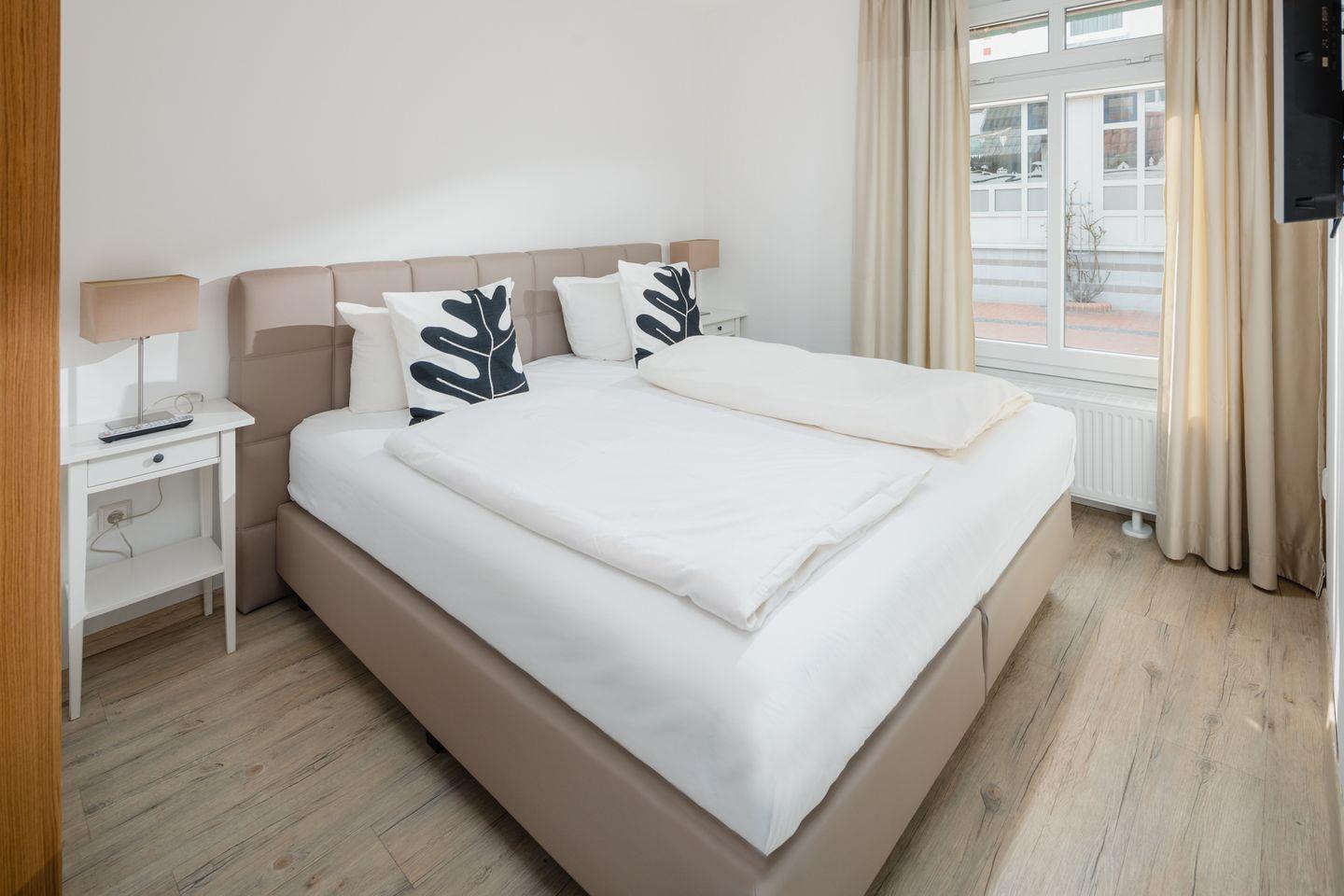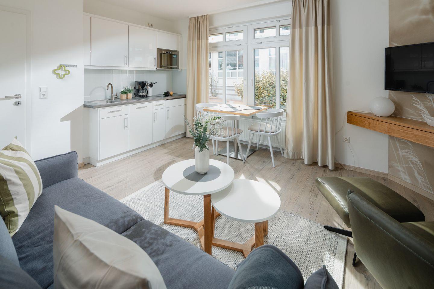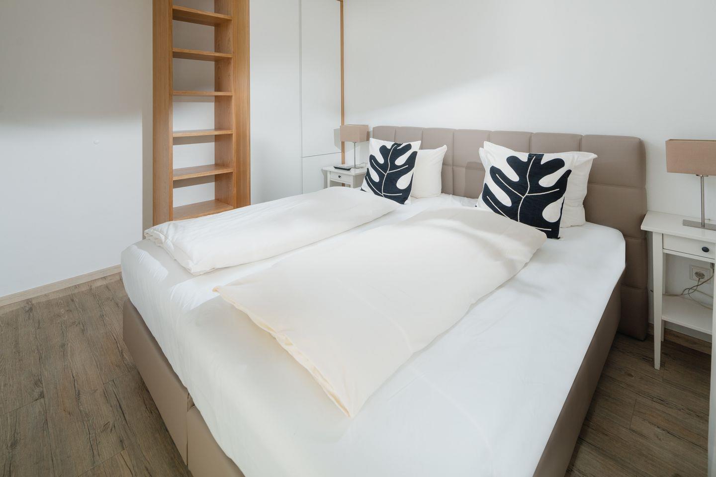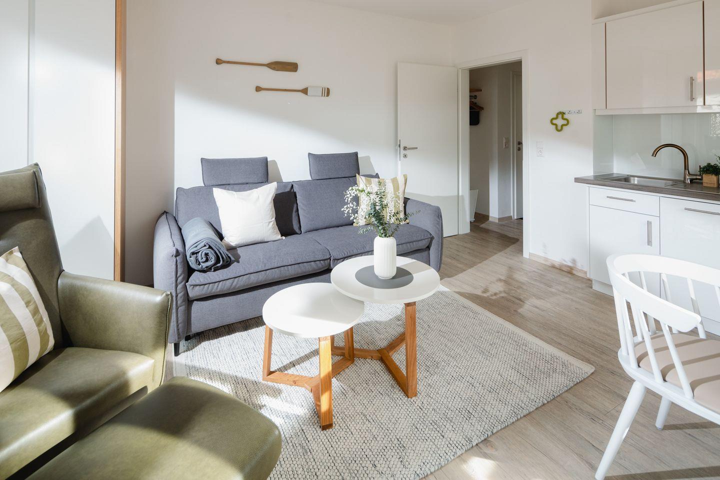 Bei der Gestaltung der Wohnung wurde Wert auf helle und natürliche Farben und einen modernen Einrichtungsstil gelegt. Die Wohnung verfügt über ein Schlafzimmer mit einem Doppelbett und TV. Das Wohnzimmer bietet eine Schlafcouch (1,60m x 2,00m), die ideal für eine zweite Person ist, die separat schlafen möchte. Die integrierte Küchenzeile ist mit allem ausgestattet. Das Bad ist mit einer Dusche, einem Handtuchtrockner und einem WC ausgestattet. Haustiere (Hunde) sind in dieser Ferienwohnung nicht erlaubt.