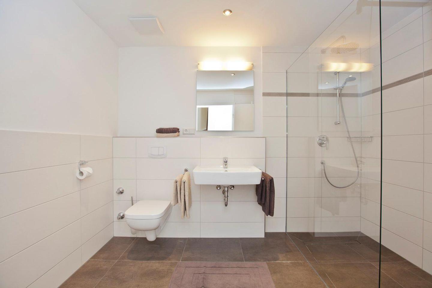 Insgesamt stehen zwei Schlafzimmer (jeweils mit einem Doppelbett), zwei Badezimmer (jeweils mit einer ebenerdigen Dusche), ein Wohnbereich (mit einem Kamin) sowie eine moderne und voll ausgestattete Küche (mit einem Essbereich) zur Verfügung. Die Wohnung verfügt über einen Balkon und eine eigene Terrasse.