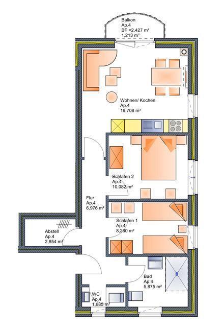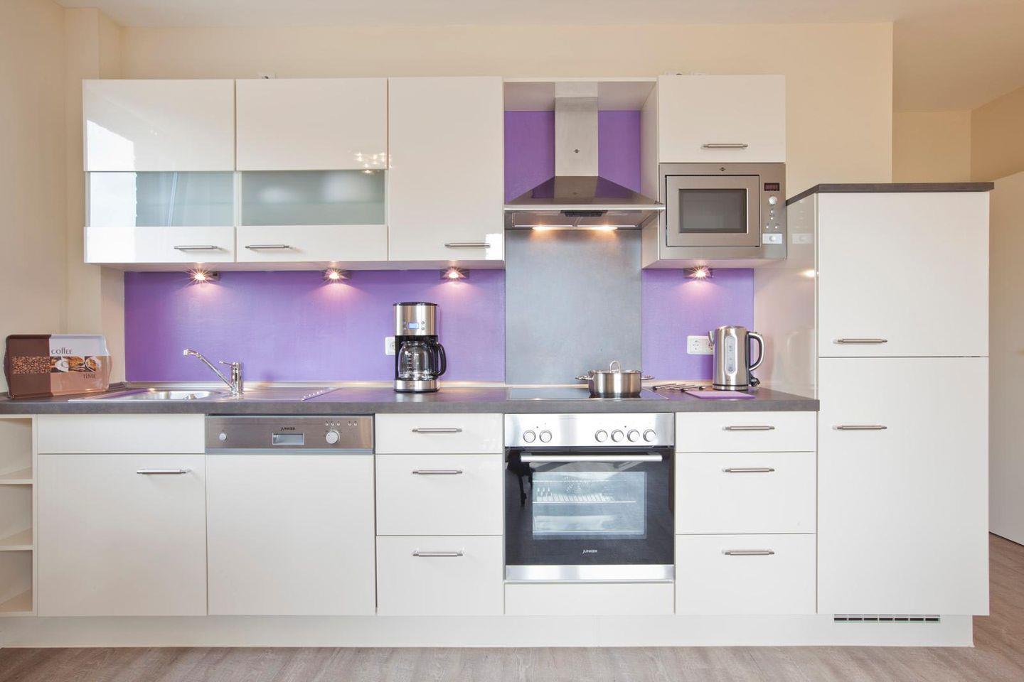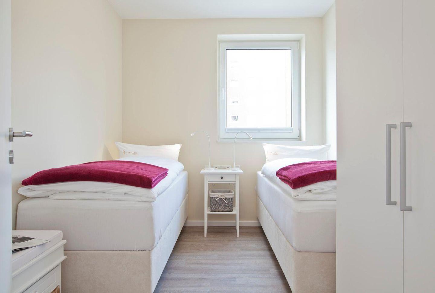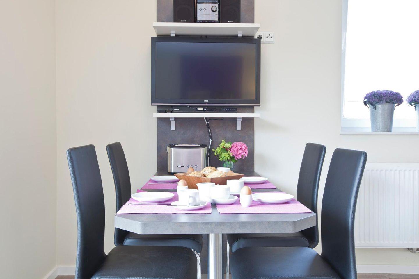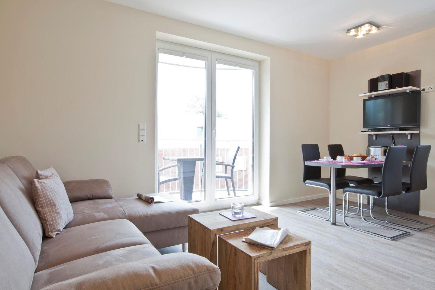 Die Wohnung wurde modern eingerichtet. Insgesamt stehen 2 Schlafzimmer, eines mit einem Doppelbett und eines mit zwei Einzelbetten ausgestattet, zur Verfügung. Das Badezimmer verfügt über eine ebenerdige Dusche. Der Wohnbereich wurde mit einer voll ausgestatteten Küchenzeile sowie einem Essbereich eingerichtet. Vom Wohnbereich kann der Balkon betreten werden.