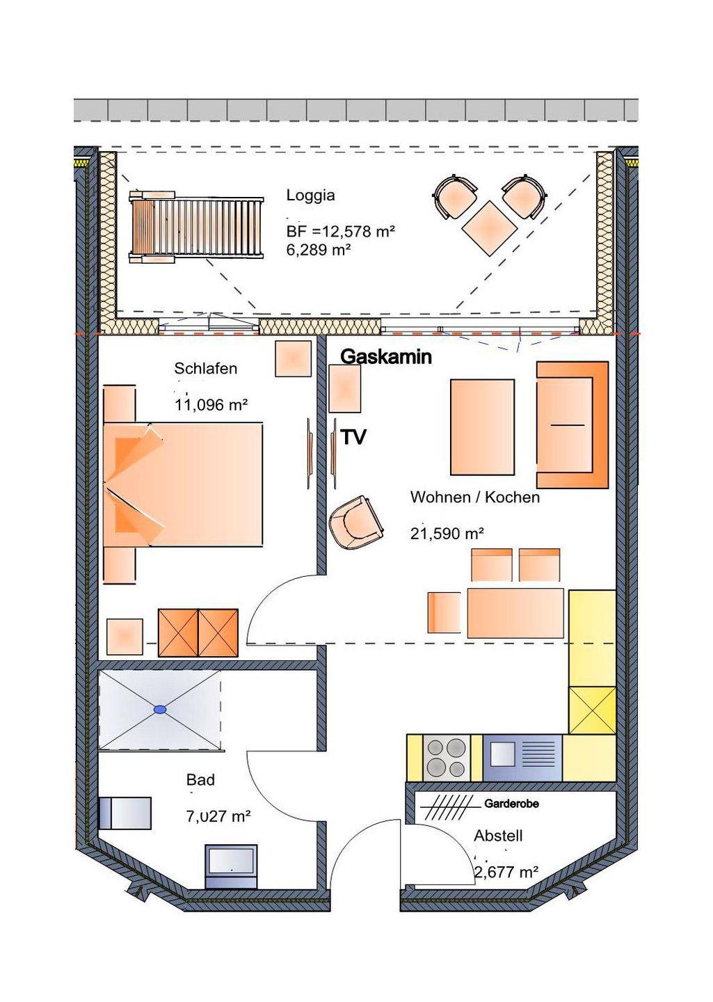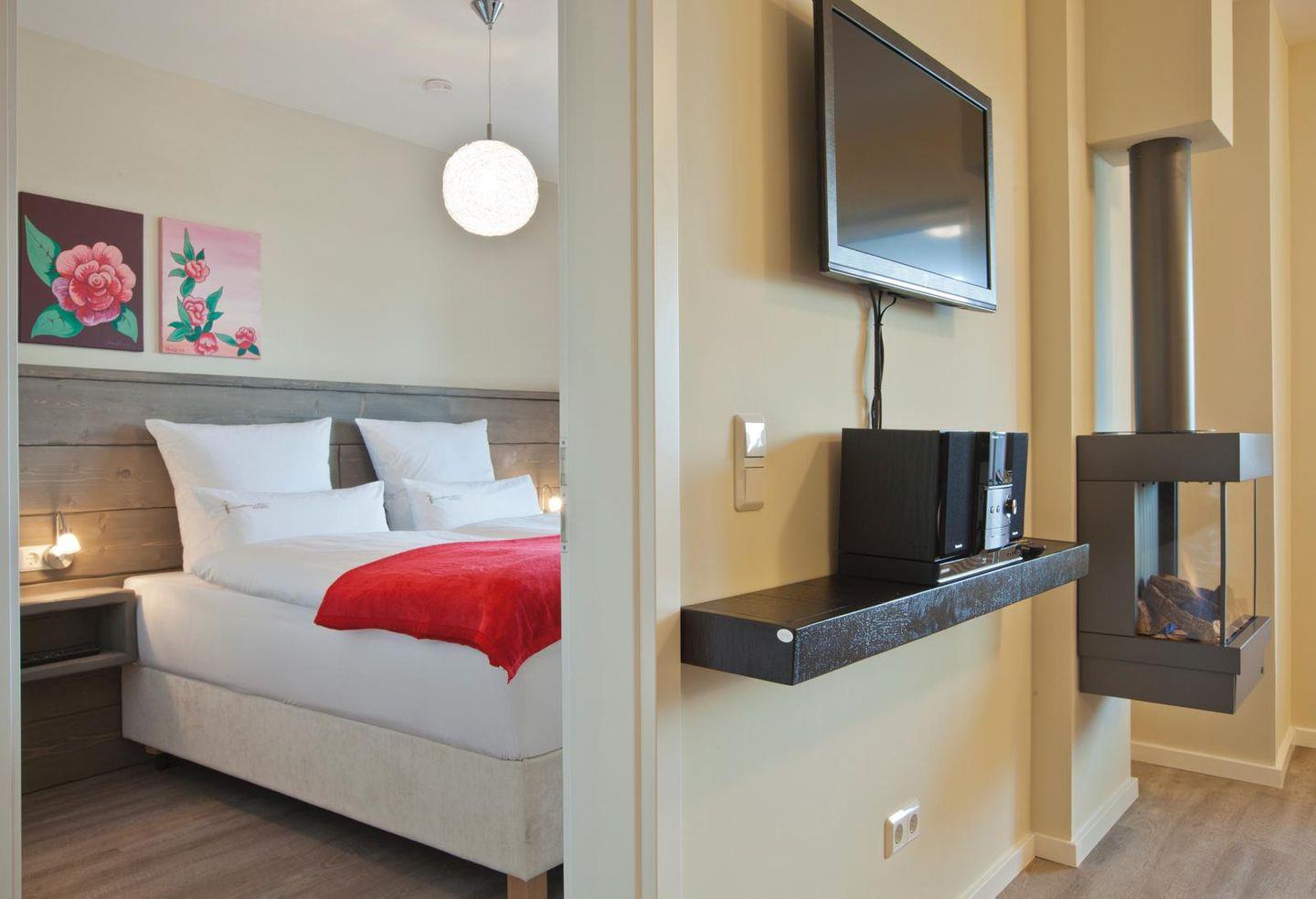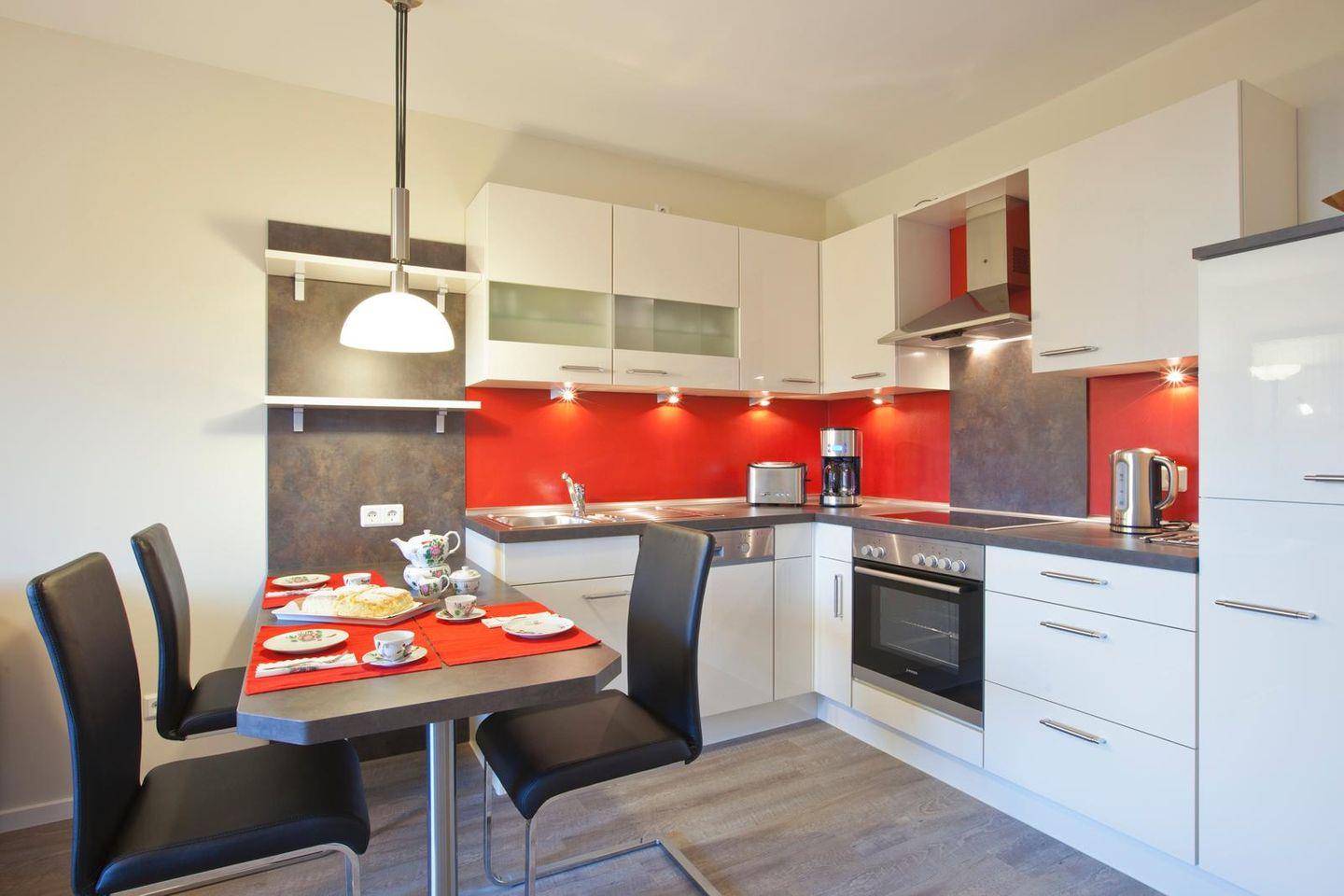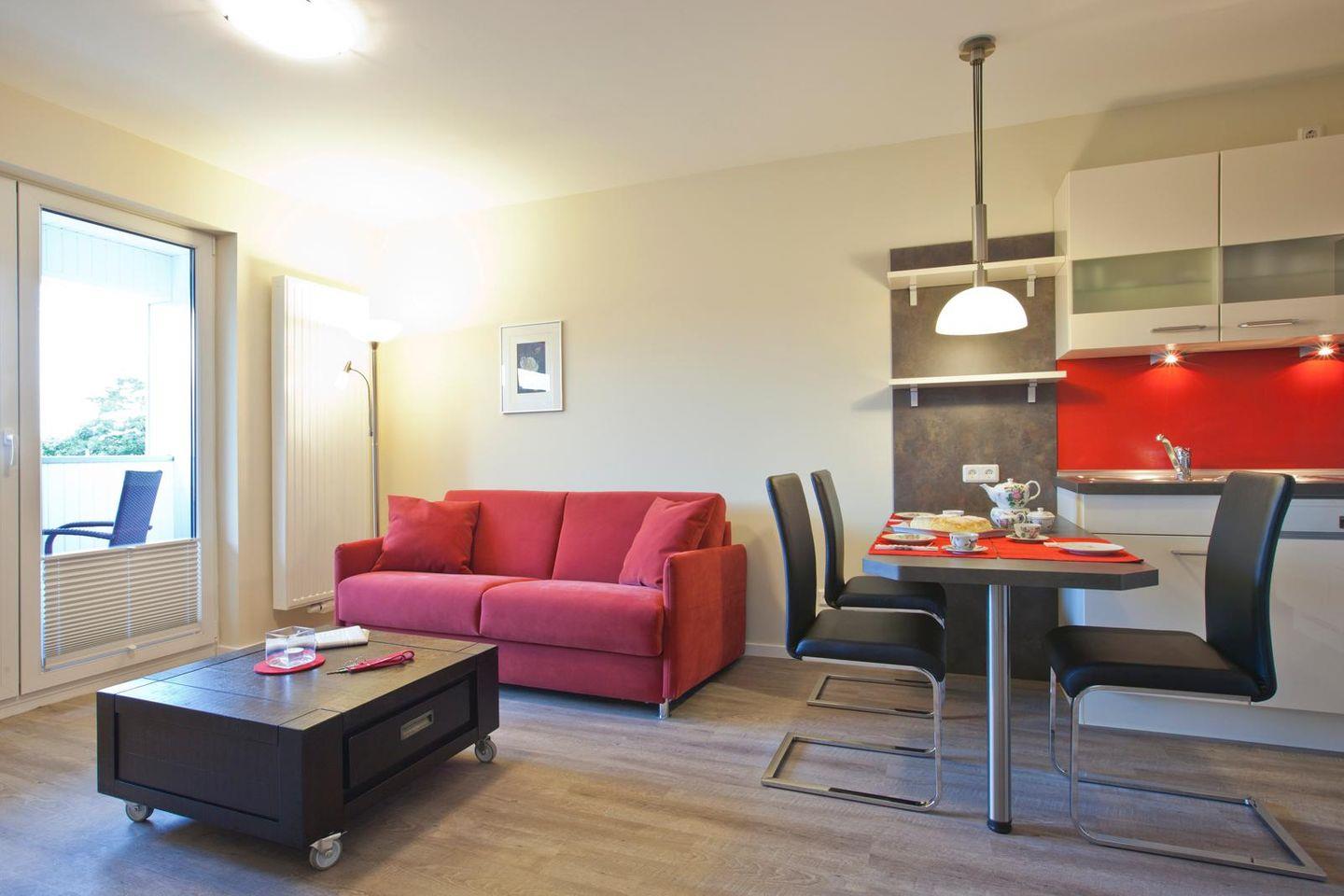 Die Wohnung wurde modern eingerichtet. Insgesamt stehen ein Schlafzimmer (mit einem Doppelbett), ein Badezimmer (mit einer ebenerdigen Dusche) sowie ein Wohnbereich mit einer voll ausgestatteten Küchenzeile sowie einem Essbereich, zur Verfügung. Vom Balkon der Wohnung kann man das Wasser (Surferbecken) sehen.
