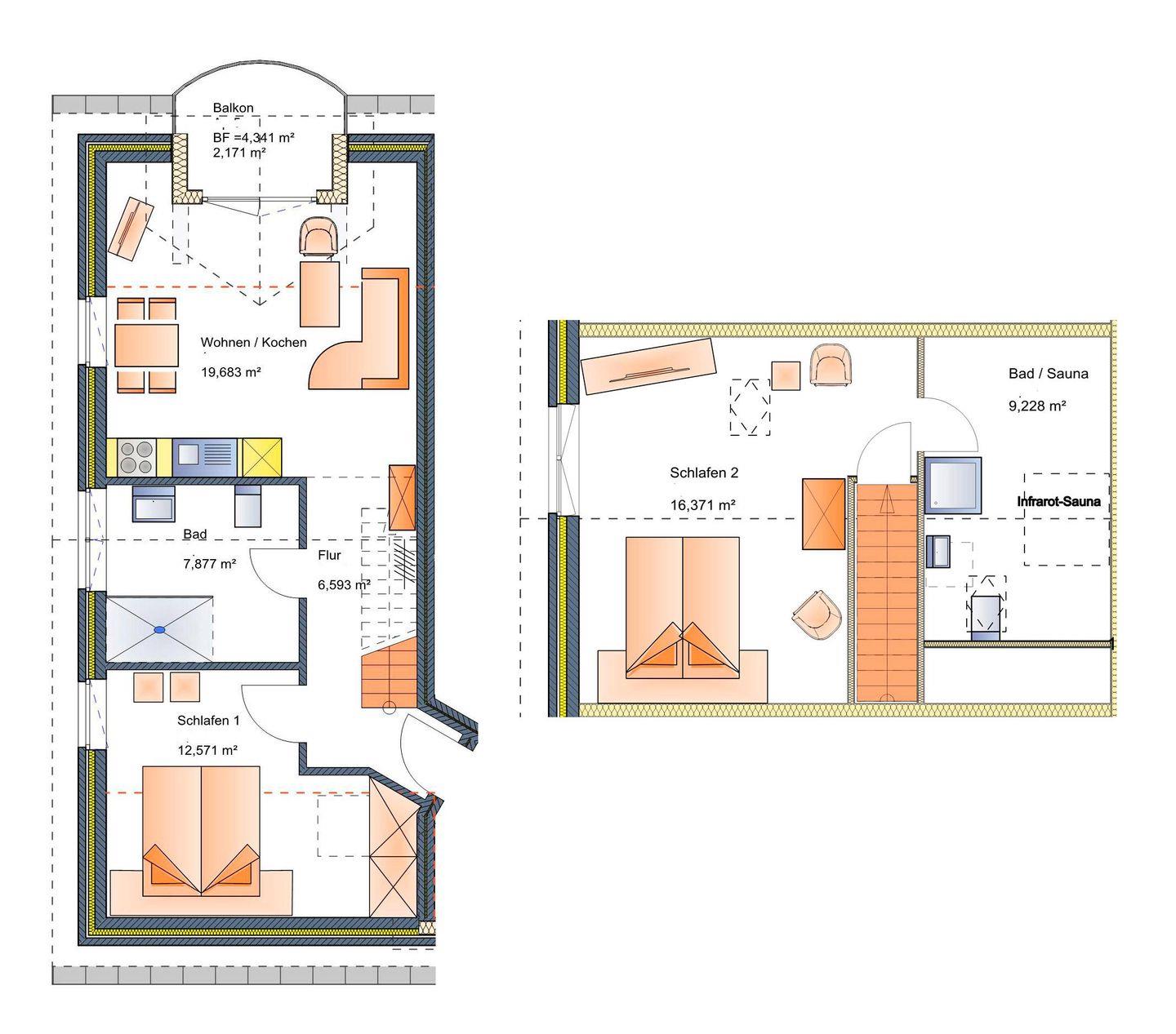 Die Wohnung verfügt über 2 Schlafzimmer, die jeweils mit einem Doppelbett ausgestattet sind. Dazu gibt es auch zwei Badezimmer. Das Wohnzimmer wurde mit einer offenen Küche und einem Essbereich eingerichtet. Zusätzlich hat die Wohnung einen kleinen Balkon. Ein Highlight der Wohnung ist die kleine Sauna (befindet sich hinter einem der Schlafzimmer). Es handelt sich um eine Infrarotsauna. Die Infrarotkabine erzeugt niedrige Temperaturen, die eine punktuelle, tiefenwirksame Wärme erzeugen. Dies hat den Effekt, den Körper zu reinigen und von Schlacken zu befreien.