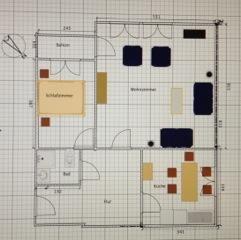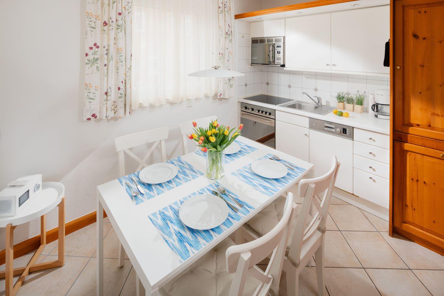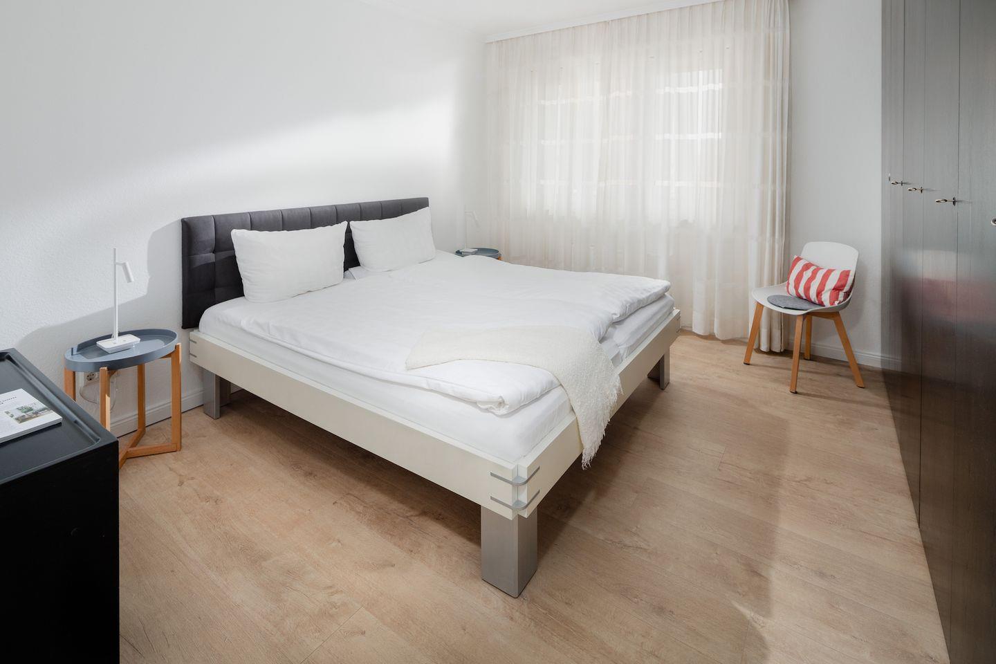 Die Wohnung ist über Treppen erreichbar und verfügt über ein Schlafzimmer mit Doppelbett. Bei der Gestaltung des Wohnzimmers wurde auf abgestimmte Details Wert gelegt. Zudem bietet das Wohnzimmer einen Zugang zu einem Südwest-Balkon. Die separate Küche ist gut ausgestattet und verfügt über eine Essecke. Die Küche ist unter anderem mit einem Geschirrspüler, einem Ceranfeld-Herd sowie einem Backofen ausgestattet. Zusätzlich zur herkömmlichen Kaffeemaschine gibt es auch eine Nespresso-Kaffeemaschine. Das Badezimmer ist mit einer Dusche und einem WC ausgestattet. Hunde sind in dieser Wohnung nicht erlaubt.