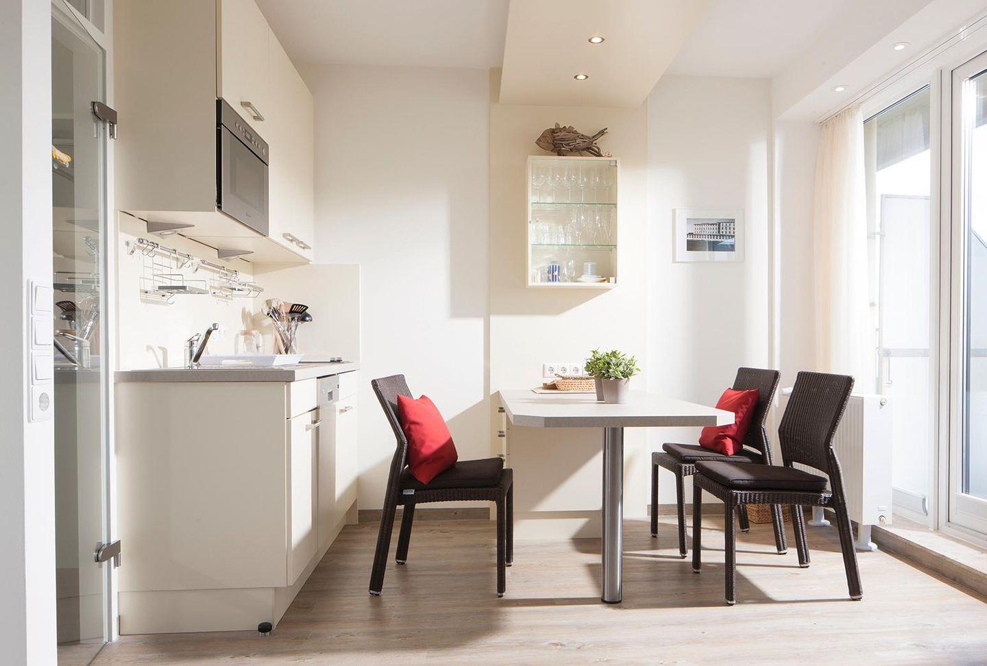 Die Wohnung wurde hell und mit Naturfarben eingerichtet. Das Wohn-Schlafzimmer wurde mit einem Doppelbett ausgestattet. Die Küchenzeile ist sehr gut ausgestattet, verfügt aber über keinen Backofen, dafür ist eine Mikrowelle vorhanden. Der Balkon mit einem seitlichen Blick auf das Meer ist das kleine Highlight der Wohnung. Im Apartmenthaus "Kaiserhof" stehen den Bewohnern eine Waschmaschine und ein Wäschetrockner (beide mit Münzeinwurf) zur Verfügung. Zusätzlich steht eine Sauna bereit, die ebenfalls gegen Münzeinwurf nutzbar ist. Es ist zu beachten, dass das Schwimmbad aufgrund eines technischen Defektes geschlossen ist. Fahrräder können vor dem Haus (Nordseite) oder im Fahrradraum abgestellt werden. Hier darf auch der vierbeinige Freund mitkommen, denn die Ferienwohnung heißt auch Hunde herzlich willkommen. Erlaubt ist maximal 1 Hund (Höhe maximal kniehoch). Die Hundewiese befindet sich in der Nähe des Fährhafens (kein Leinenzwang).