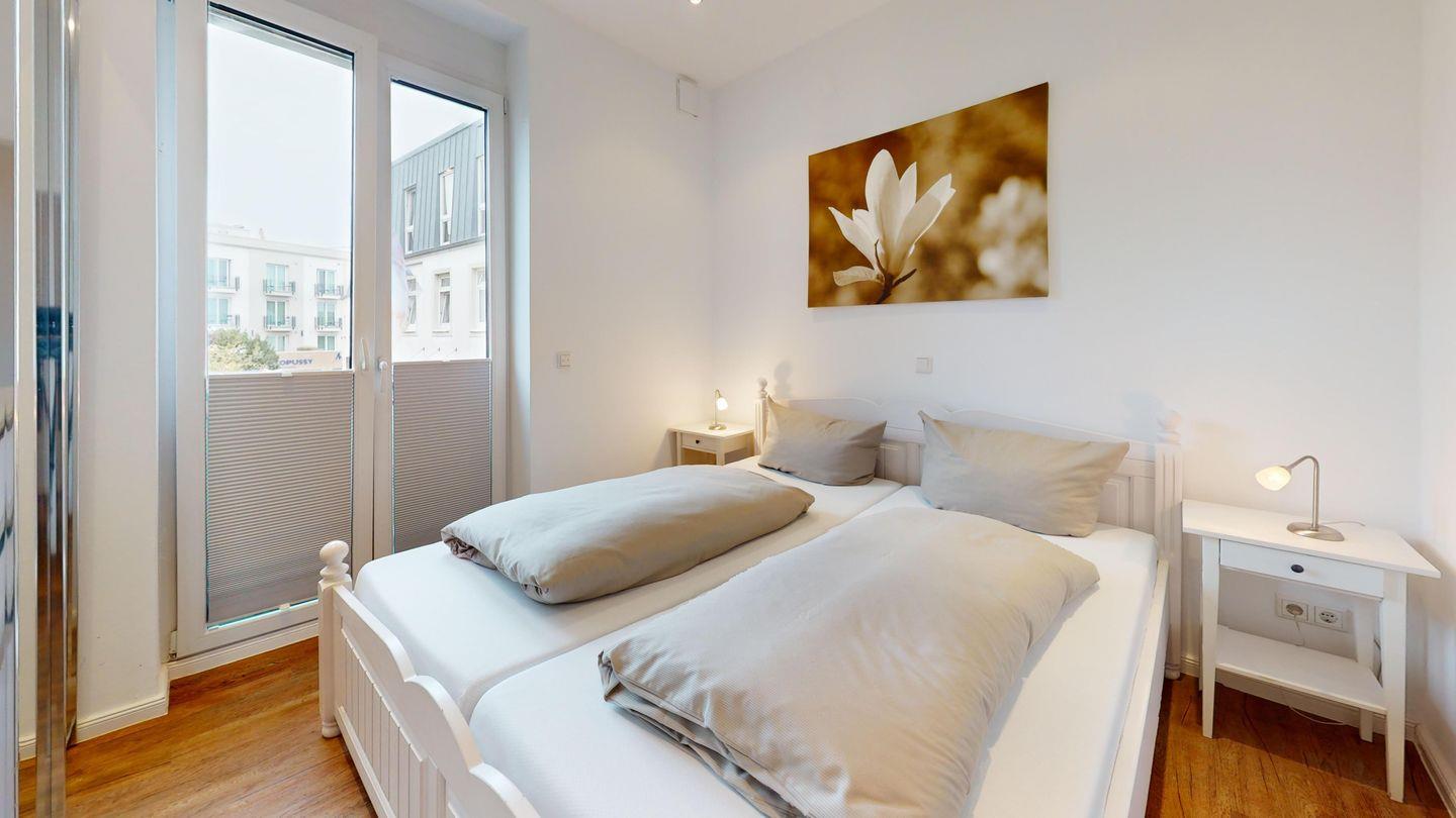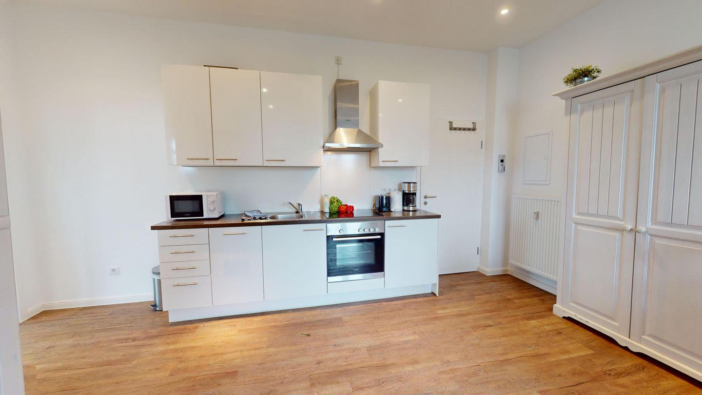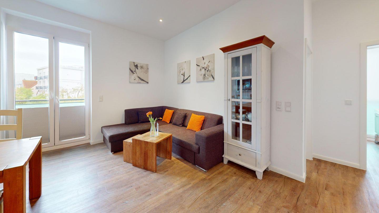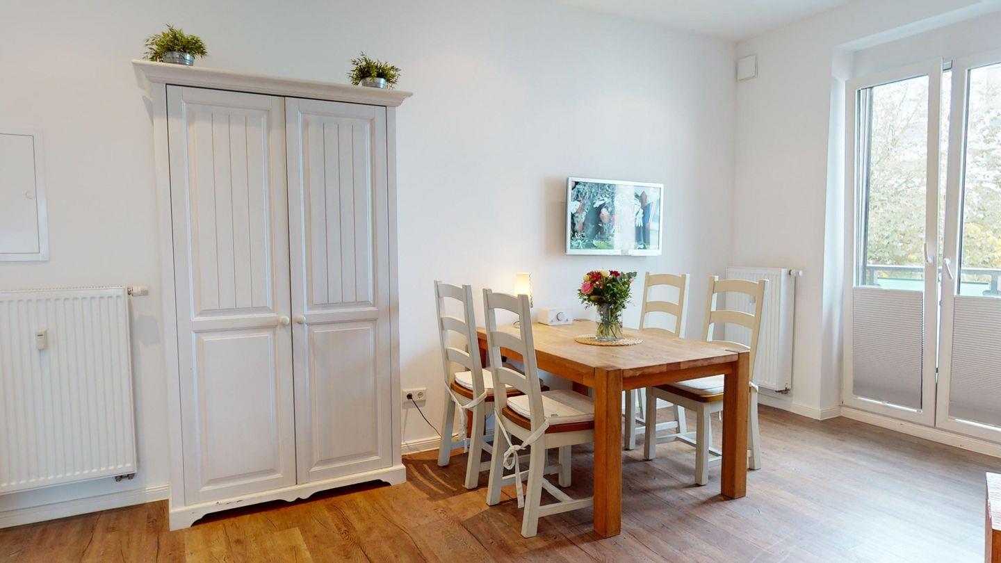 Bei der Innenausstattung wurde Wert auf helle und natürliche Farben gelegt. Das Schlafzimmer ist mit einem Doppelbett ausgestattet. Das Wohnzimmer bietet mit einer Schlafcouch eine weitere Schlafmöglichkeit für bis zu zwei Personen. Das Badezimmer ist mit einer Dusche und einem Handtuchtrockner eingerichtet. Die Wohnung verfügt über einen Balkon. Eine Waschmaschine und ein Wäschetrockner stehen im Haus (zur gemeinschaftlichen Nutzung ggf. gegen Gebühr) zur Verfügung. Hier darf auch der vierbeinige Freund mitkommen, denn die Ferienwohnung heißt auch Hunde herzlich willkommen. Erlaubt ist maximal 1 Hund (Höhe maximal kniehoch). Die Hundewiese befindet sich in der Nähe des Fährhafens (kein Leinenzwang).